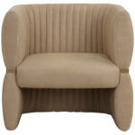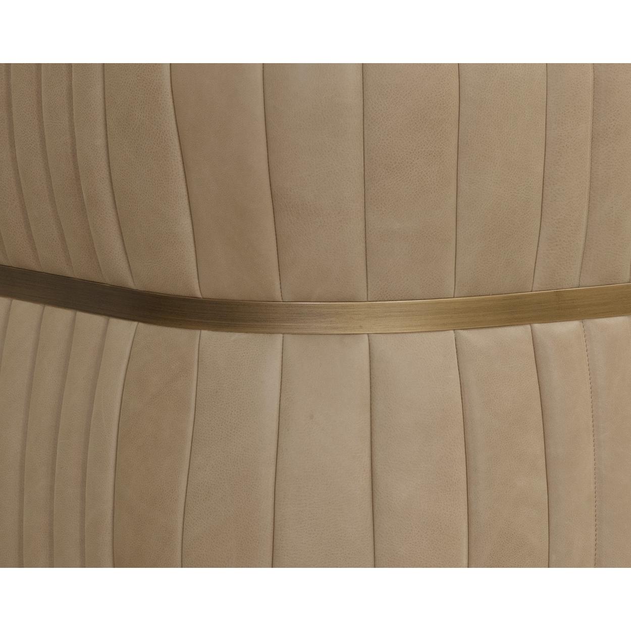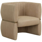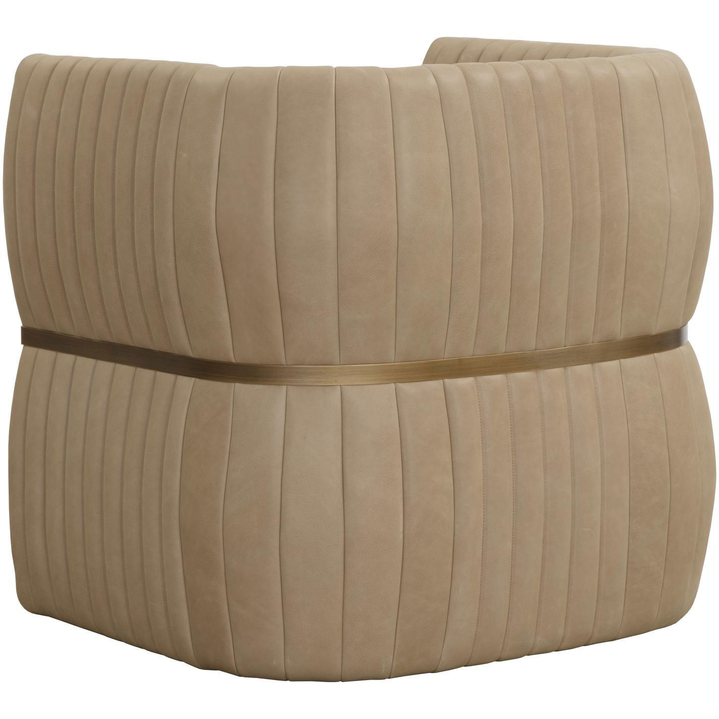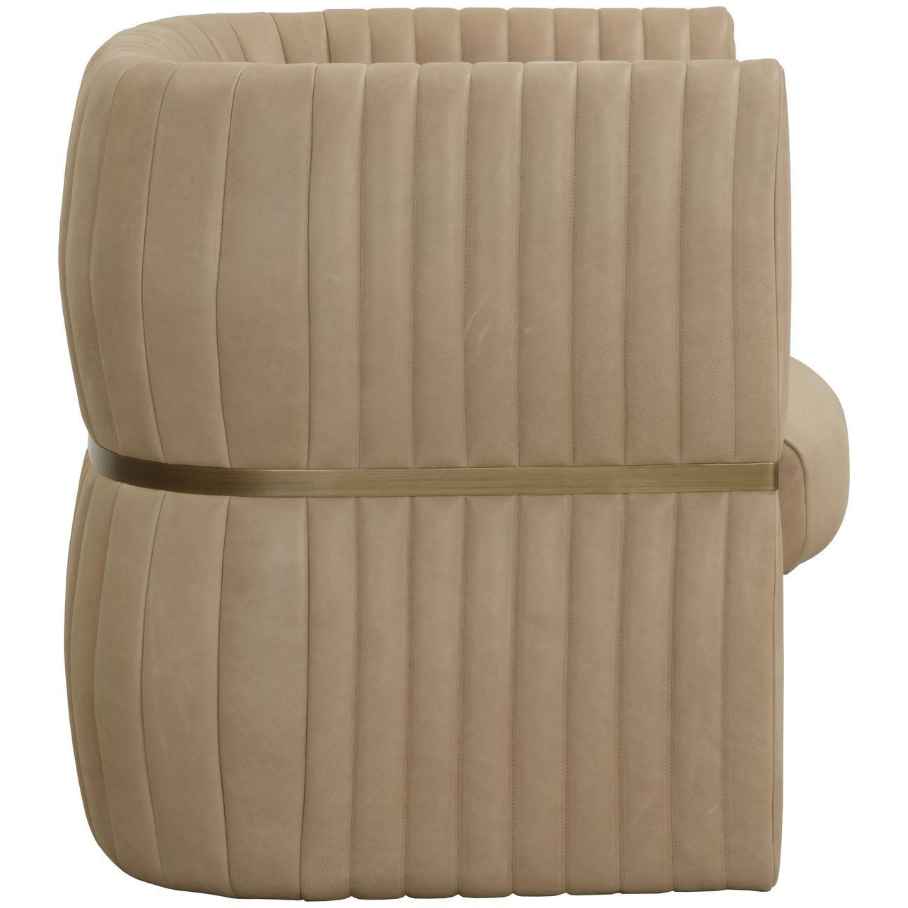 The Tryor Lounge Chair is defined by its contemporary style and enhanced proportions. Fully upholstered in our smooth sahara sand top grain leather for a luxurious feel. An antique brass iron metal accent wraps around the chair to accentuate its channel design.