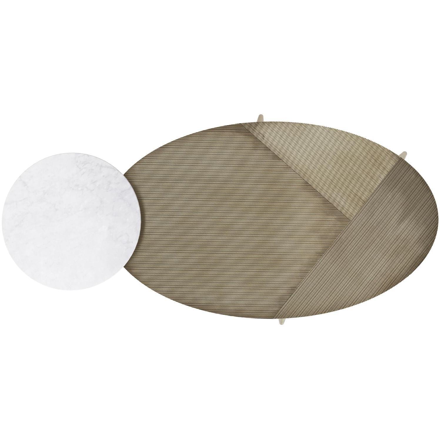 A unique coffee table crafted with mixed materials and organic shapes. Features a hand-etched antique brass iron oval top and legs with a round white marble shelf. Also available in a triangular version. Made in India: With refined craftsmanship, this design was brought to life by skilled local artisans. By nature, these materials develop unique imperfections such as fissures, markings and colour variations for a truly one-of-a-kind piece. As marble is a natural material, unique veining, pitting, fissures, micro-cracks and colour variations are all characteristics that add to the uniqueness and beauty of each piece.