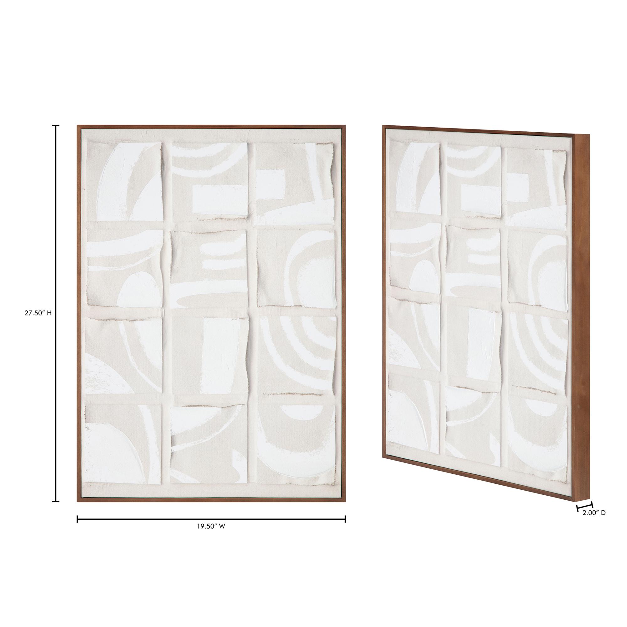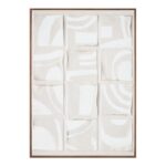 Inspired by the Dadaist movement and collage art, Unfold 2 is an homage to Ellsworth Kelly’s Cité, where ink strokes were brushed across a sheet of paper, cut into twenty squares, and randomly recomposed in a grid pattern. Shadowed tones add depth and dimension to the collage-like squares, while a neutral color palette and irregular shapes offer a softness to the sharp shapes—a remarkable abstract piece expertly finished with a solid pine frame.