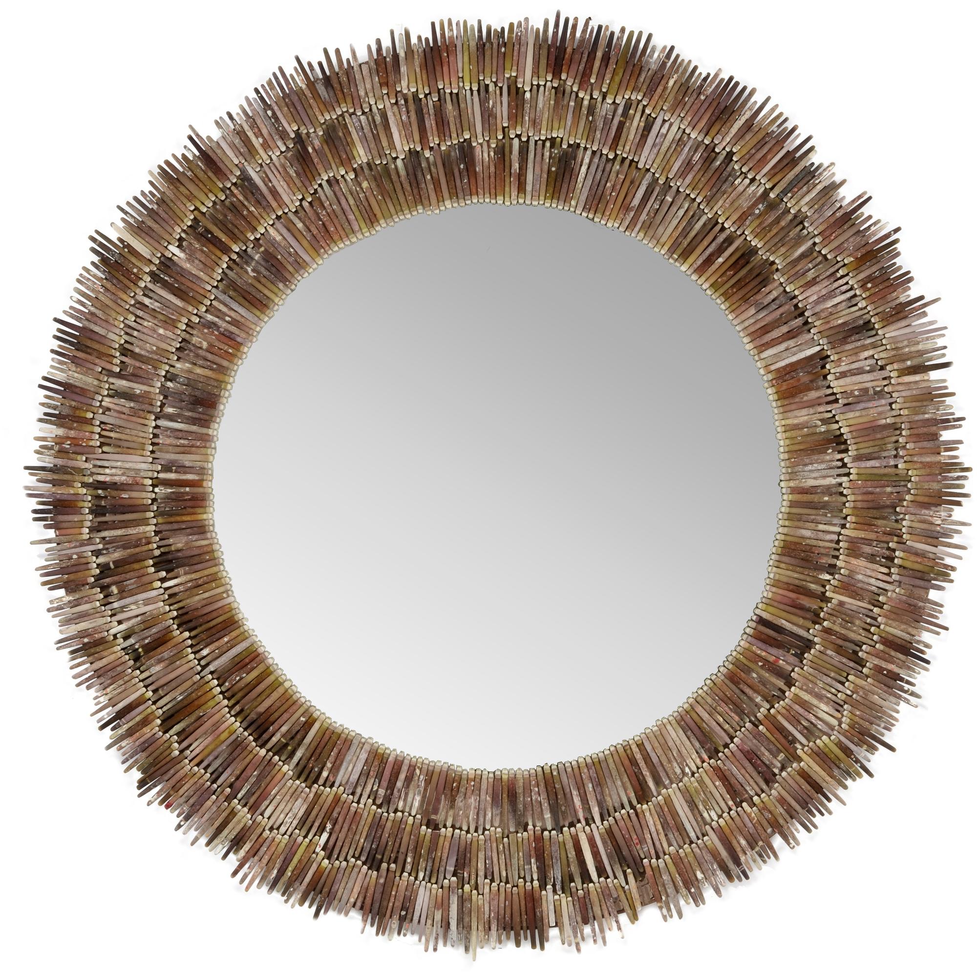 Mirror in round frame constructed with individually applied urchin spine shells.