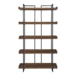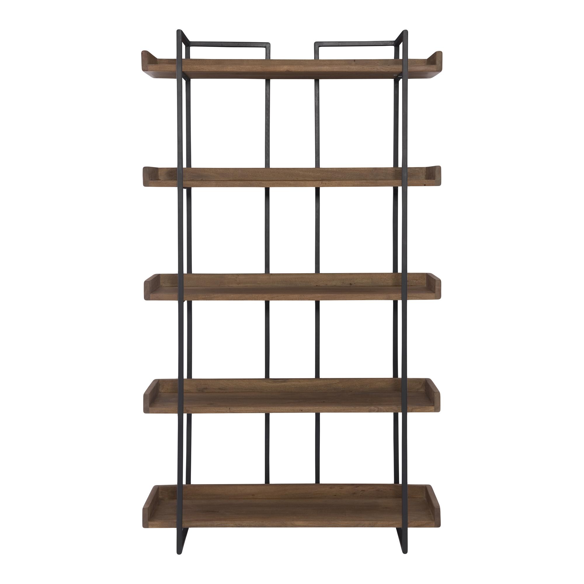 A sleek contemporary style, constructed with an iron frame and solid acacia with a light brown stain.