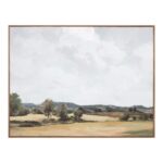 Vast Country depicts unfolding scenery. The painterly-like quality adds an air of romanticism to the rural scenes of nature. Soft, muted colors create a serene and comforting setting for the viewer, while the pine frame is stained in warm brown for a sentimental finish.