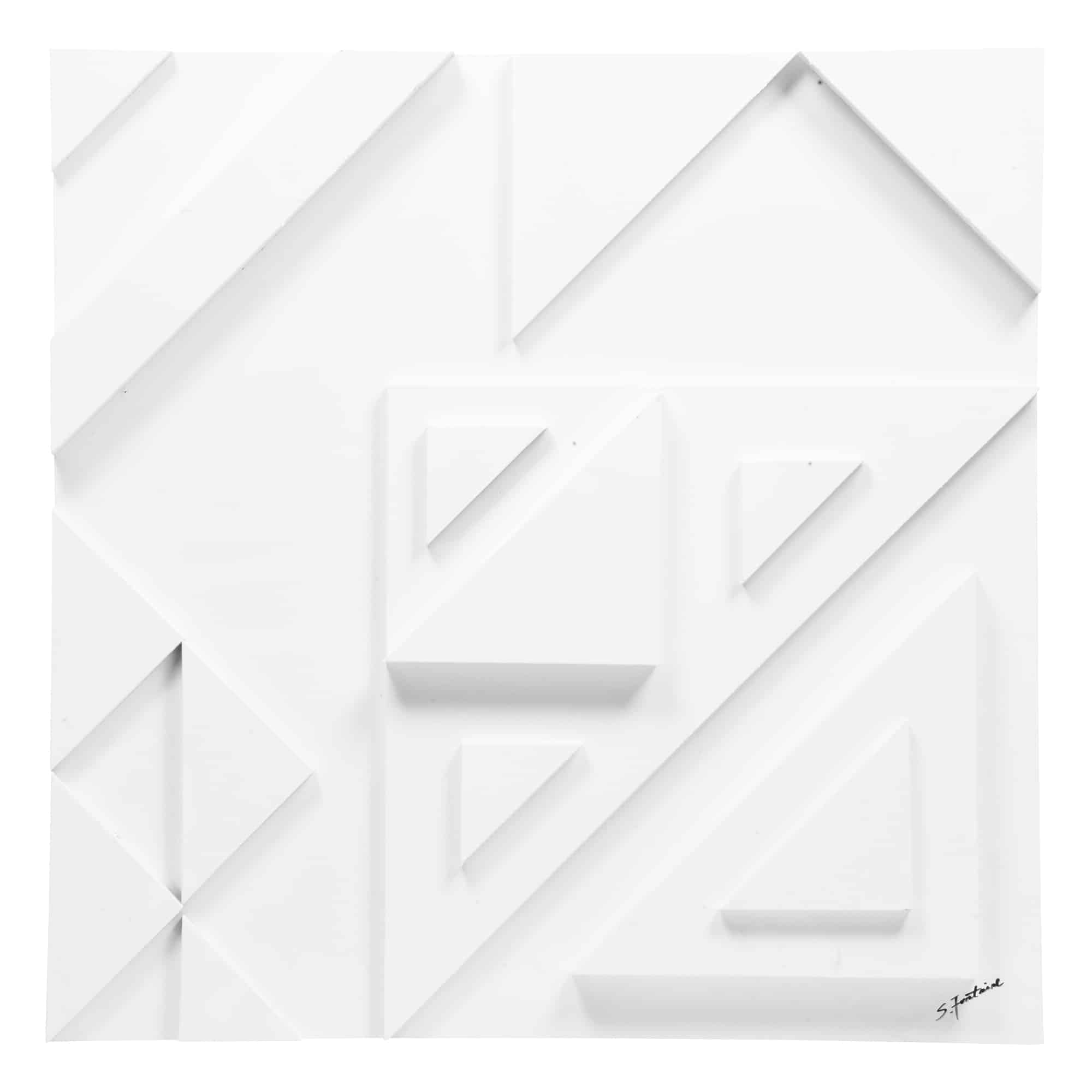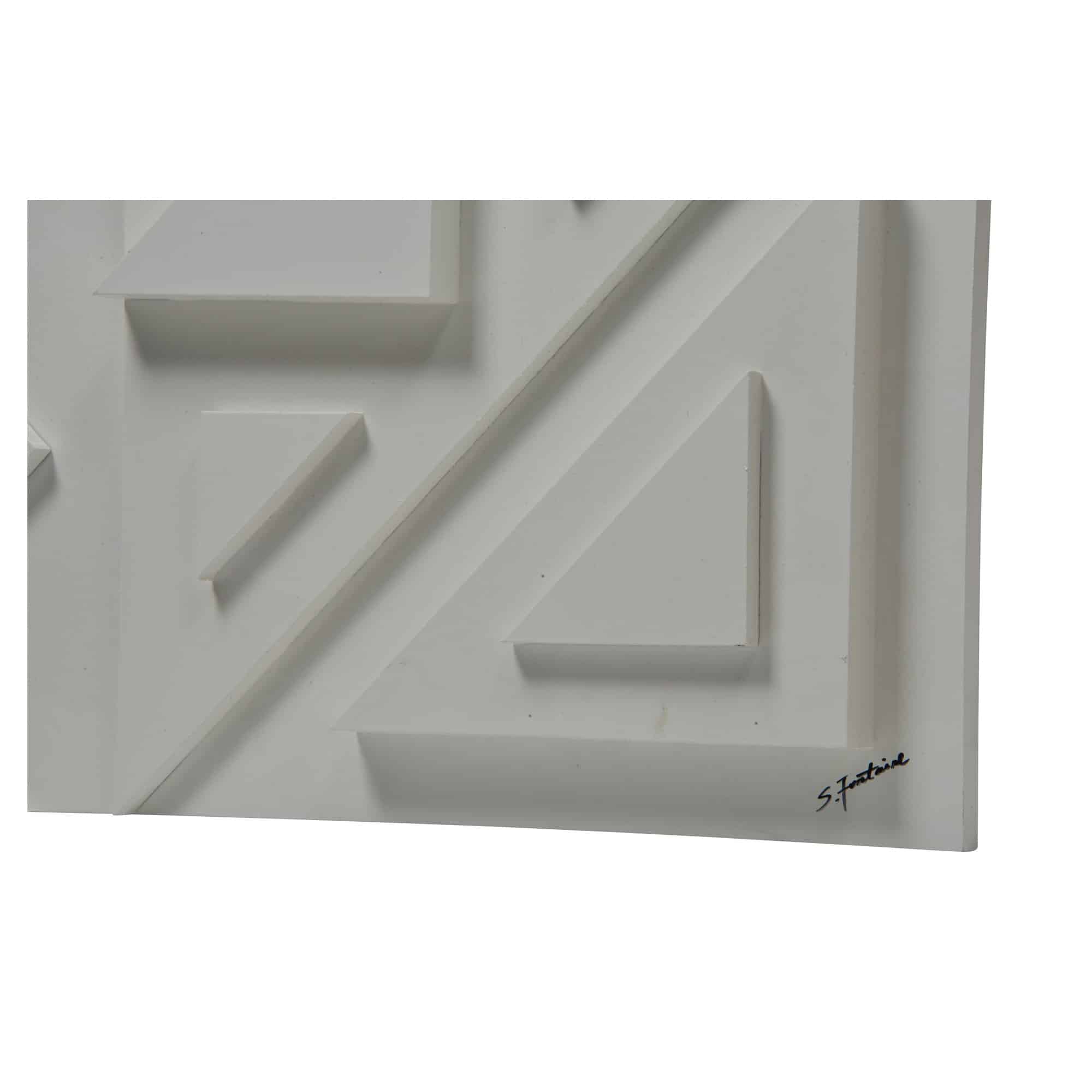 High-relief stripes and assorted stacked triangles create the stark composition of this three-dimensional geometric wall decoration. The minimalist Matte white finish strips away unnecessary conventions of color. The interpretive nature of the abstract art piece can be hung horizontally or vertically, providing a sense of purpose to an empty interior wall.
