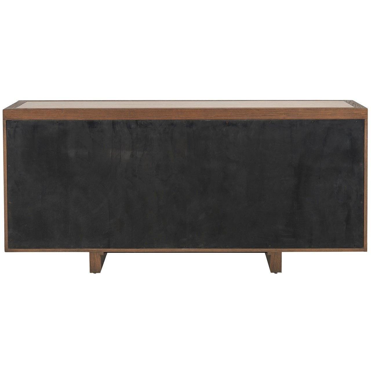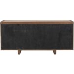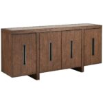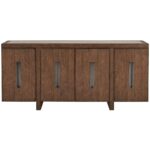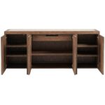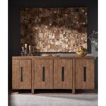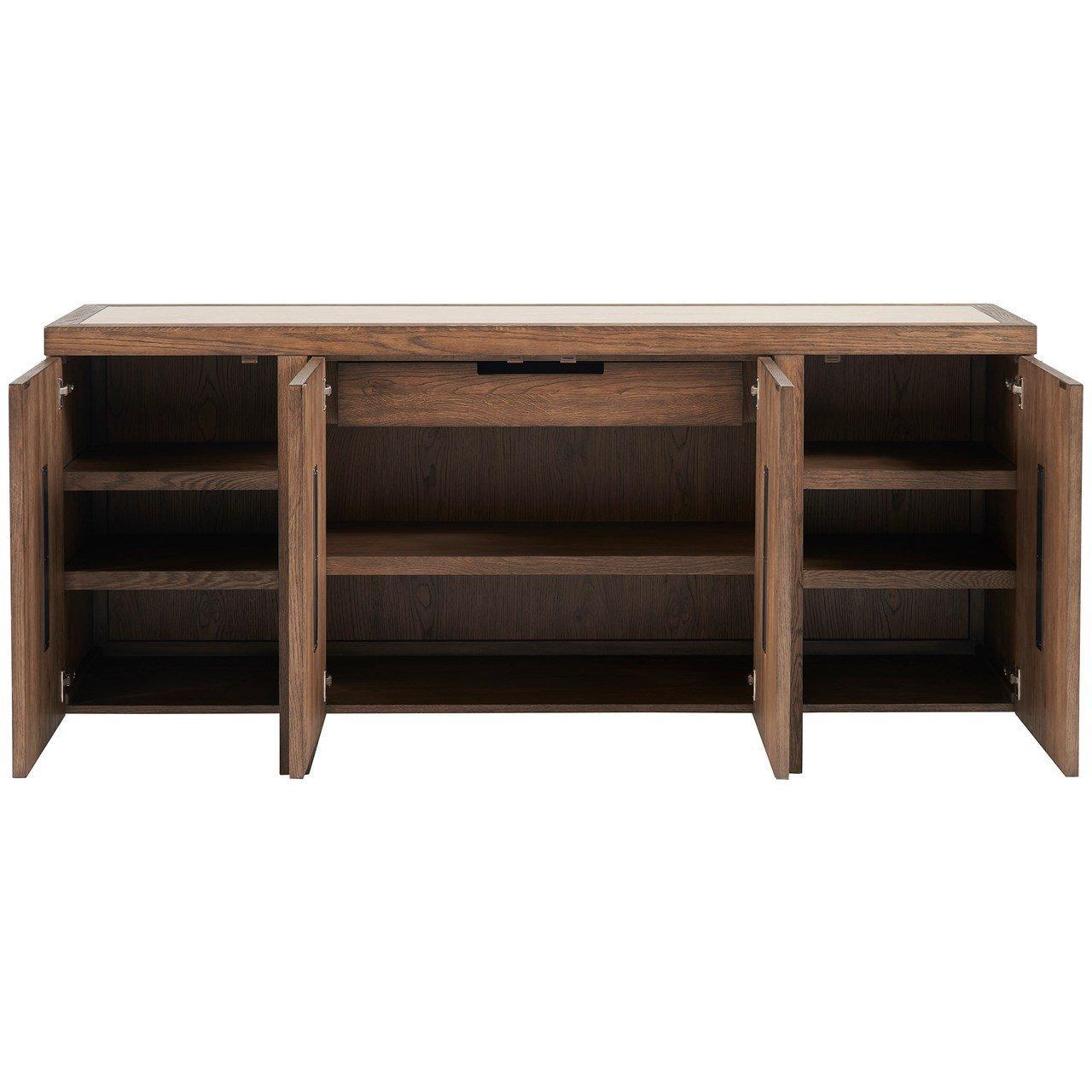 The Veda Credenza, in a bold Medium Brown Oak finish, commands attention with its four doors and interior adjustable shelving, designed for versatility. The innovative design integrates pulls directly into the doors, creating a seamless, illusionary effect that enhances the credenza’s sleek and modern appeal. This piece is a perfect blend of functionality and artistic design, making a striking addition to any space.