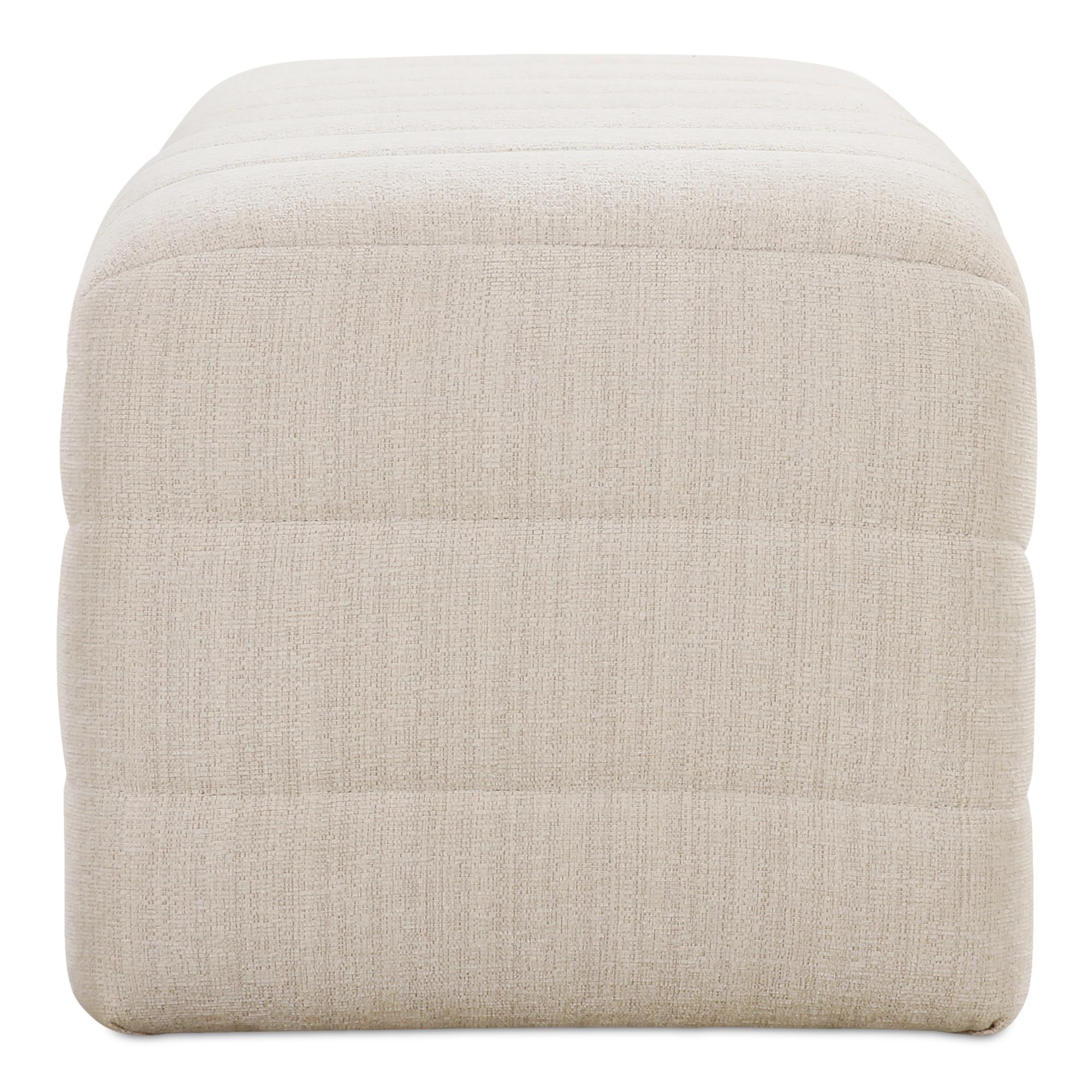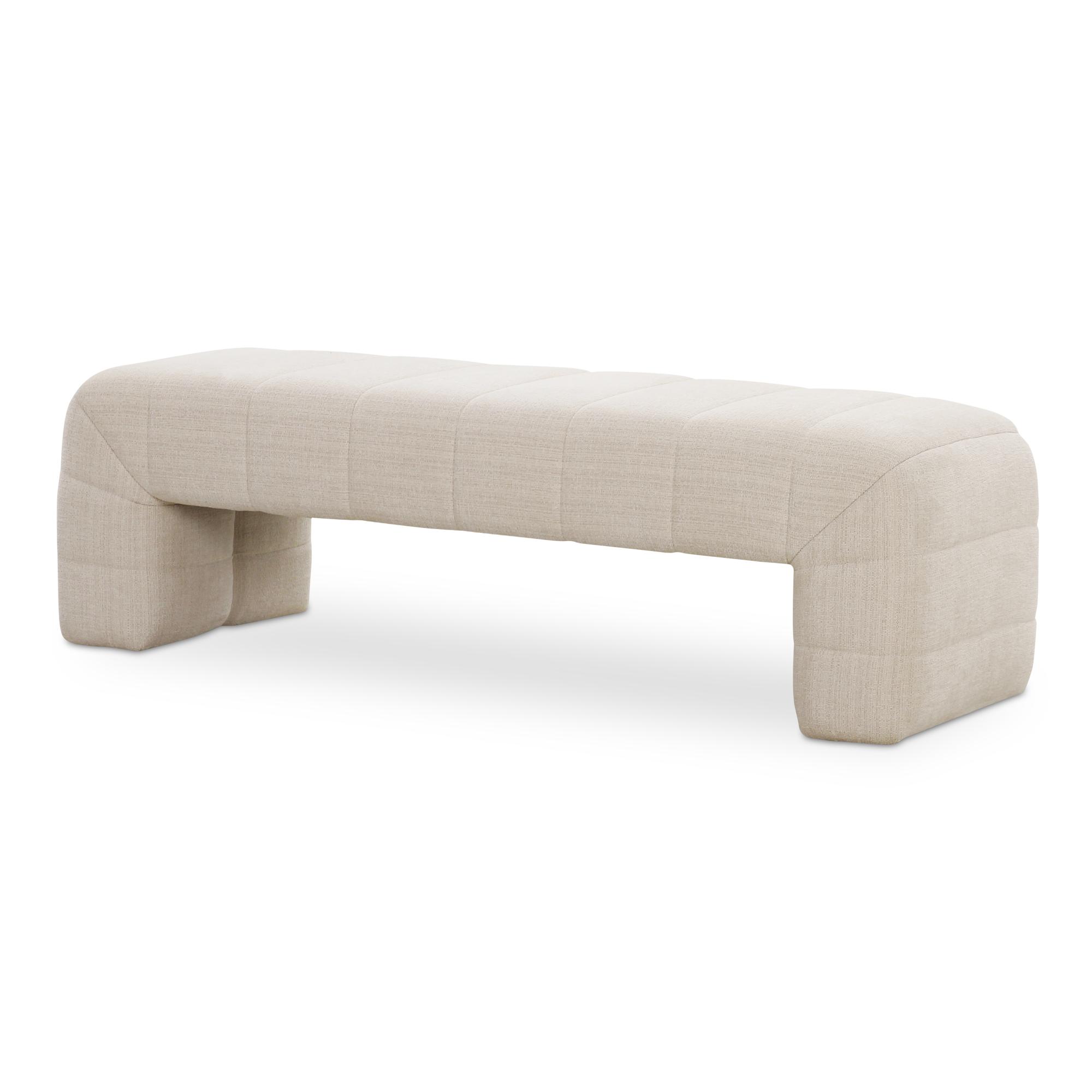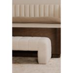 The Verity bench features a plump form enveloped in soft, flecked textured upholstery with warm tones for a touch of elegance. Wide channel detailing adds texture and visual interest, complemented by rich, warm tones that tell a story of comfort and coziness as the high-density foam seat provides a plush seating experience.