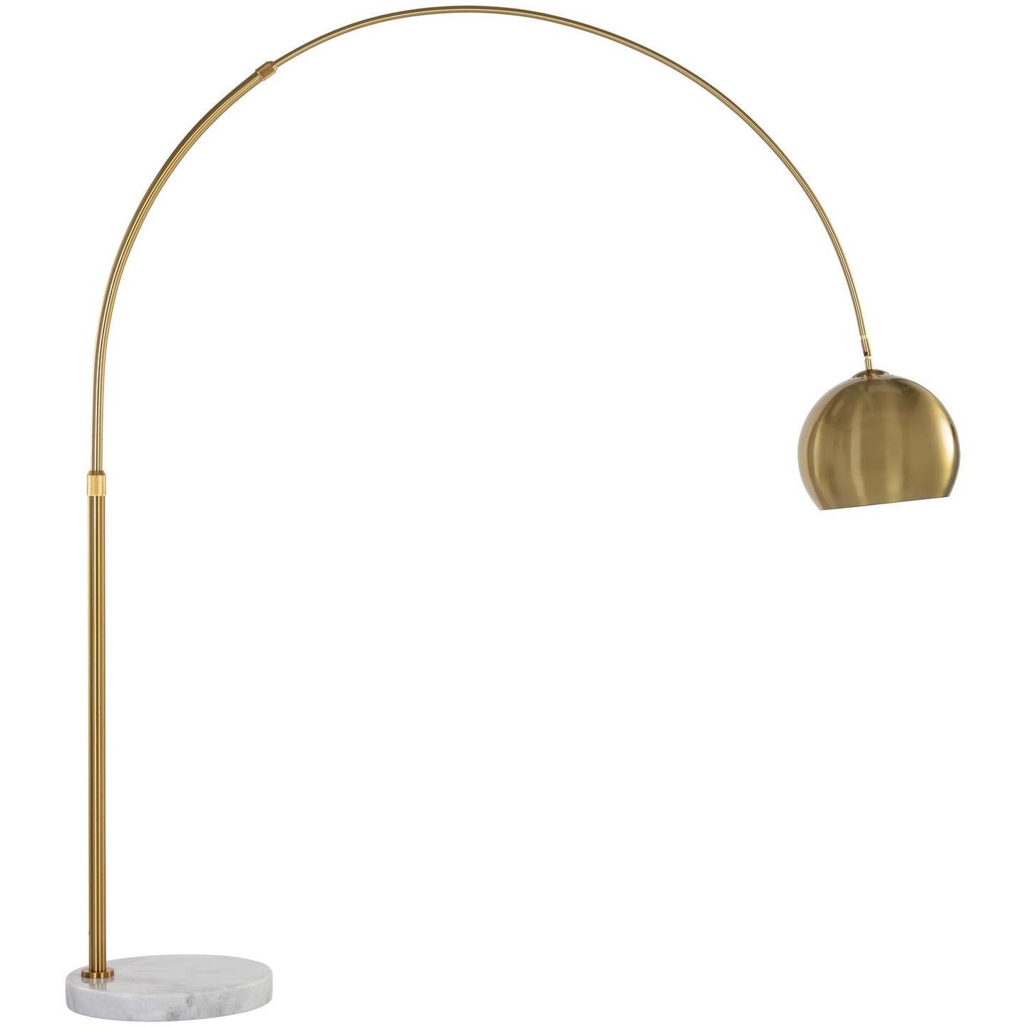With a sweeping arc, this bold lamp will define living, lounge and office spaces with style. Features a globe shade in brass iron with a white marble base. As marble is a natural material, unique veining, pitting, fissures, micro-cracks and colour variations are all characteristics that add to the uniqueness and beauty of each piece.