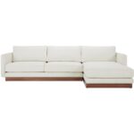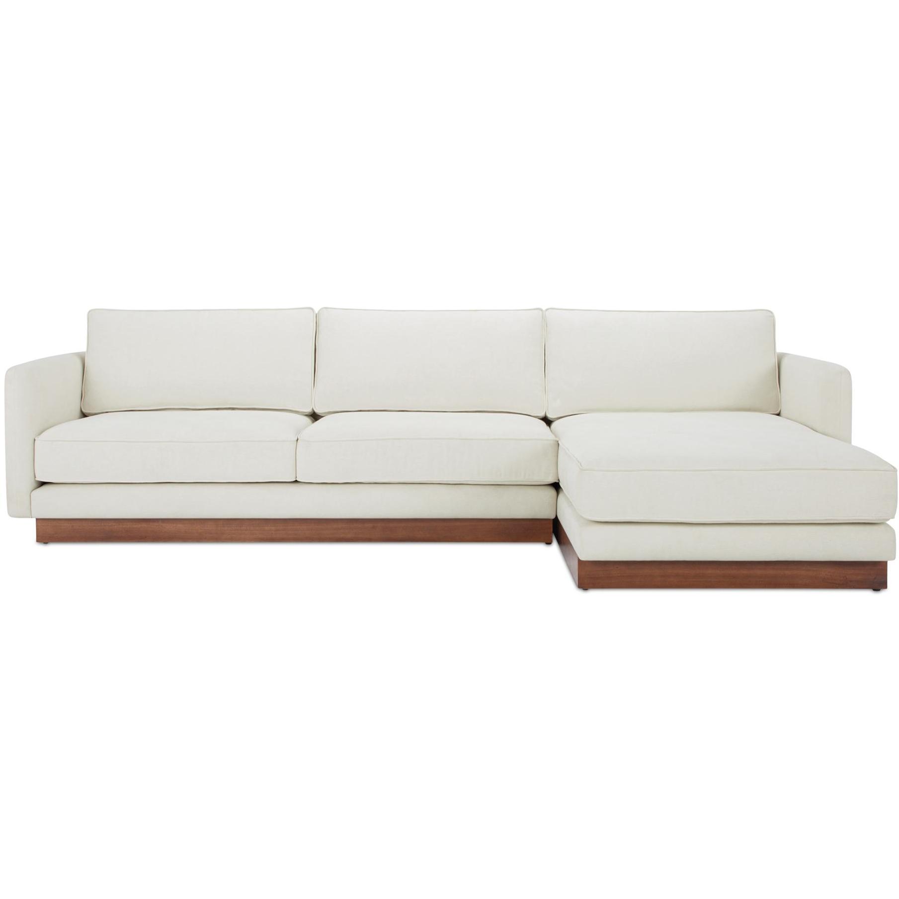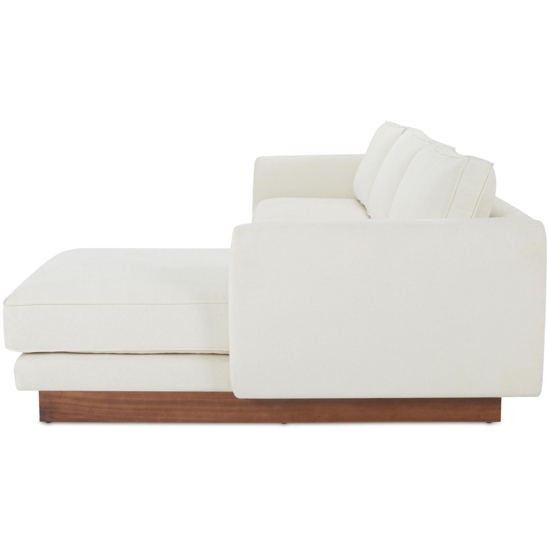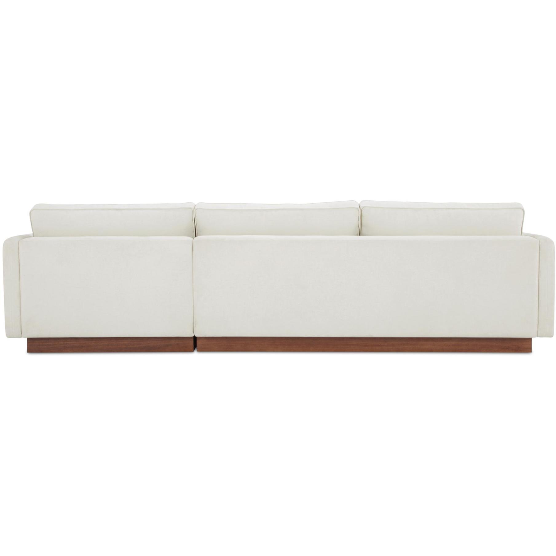 The Vernon sectional blends mid-century design with modern functionality. It features a wooden plinth base for an elevated, lighter appearance. This sectional offers unmatched comfort with removable cushions. Upholstered in durable, OEKO-TEX and Green Guard-certified fabric, it is ideal for family living, combining everyday practicality with durability.