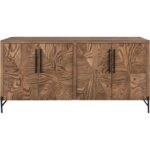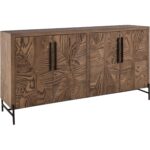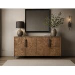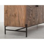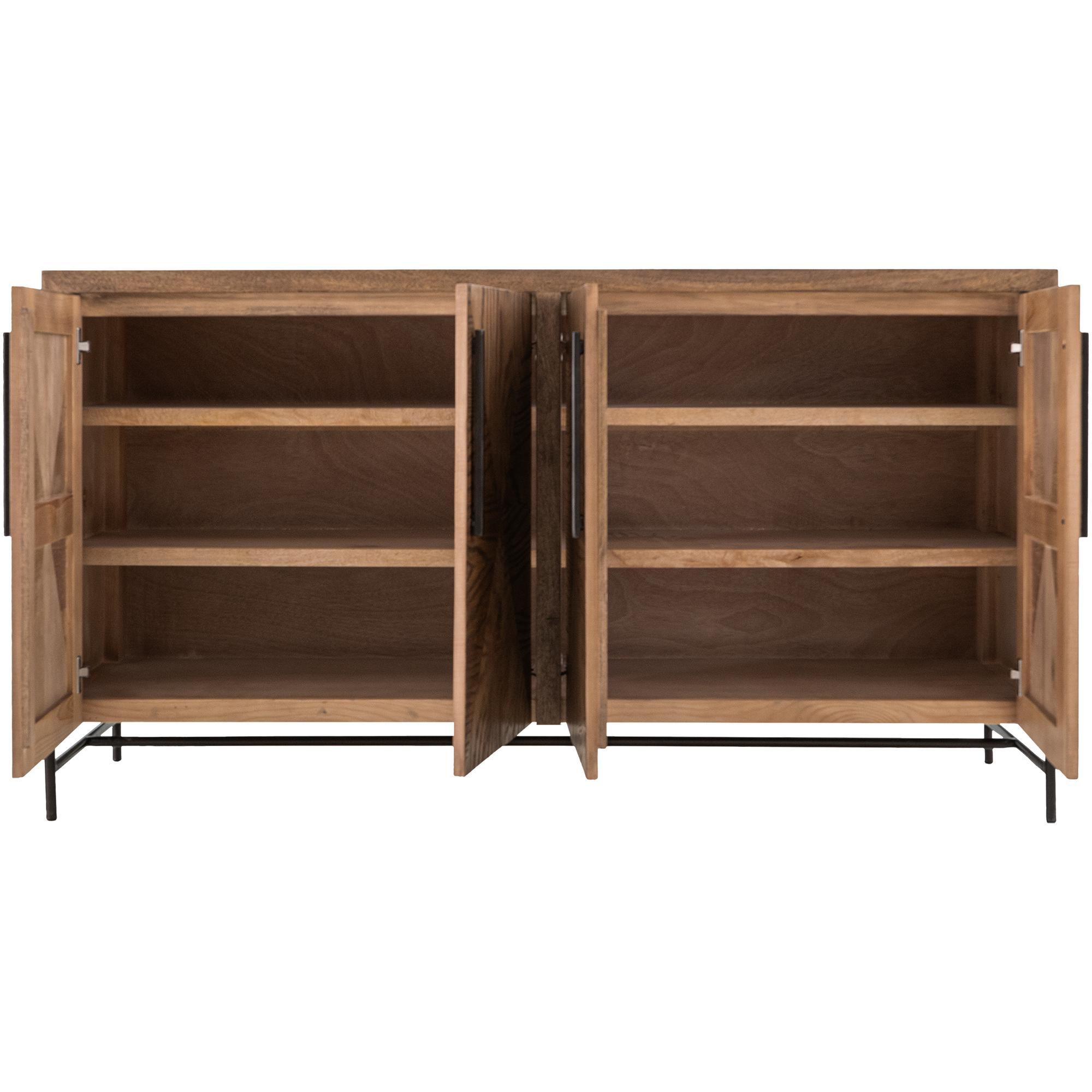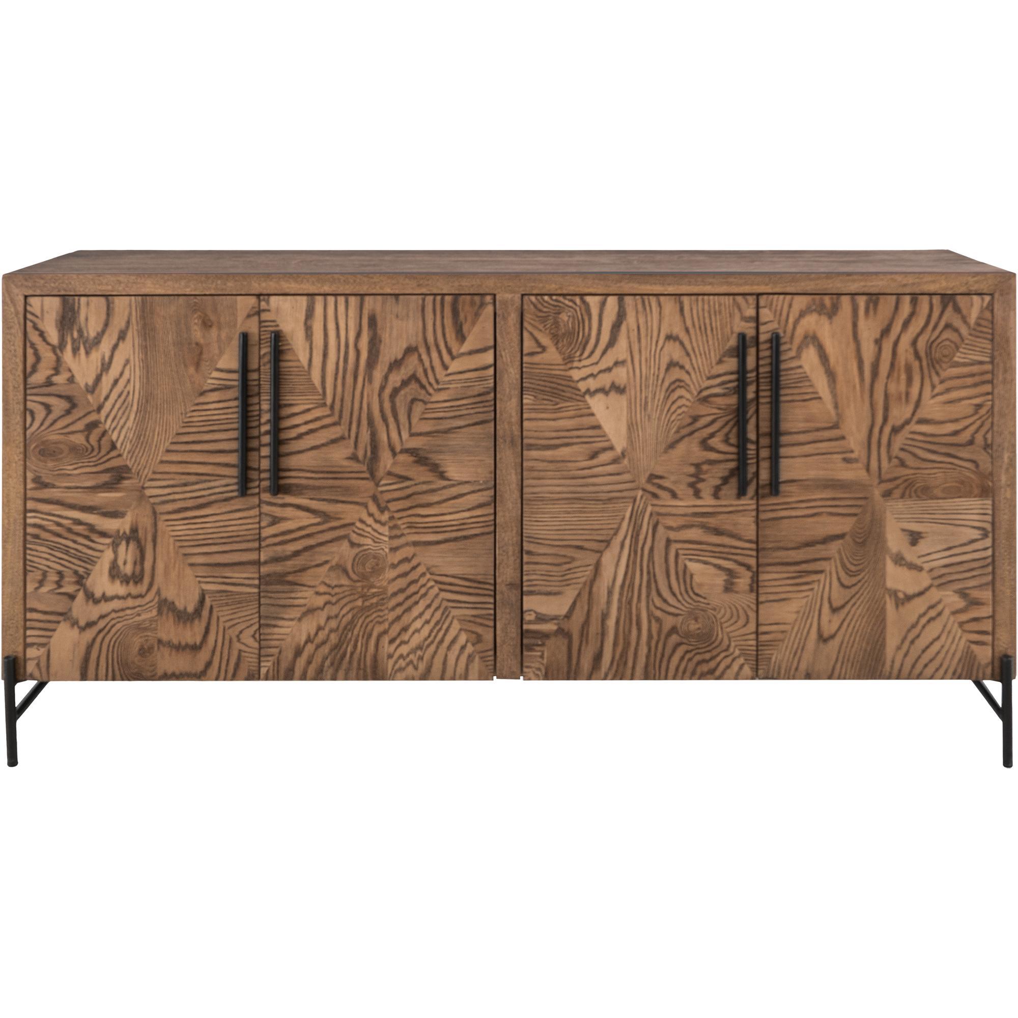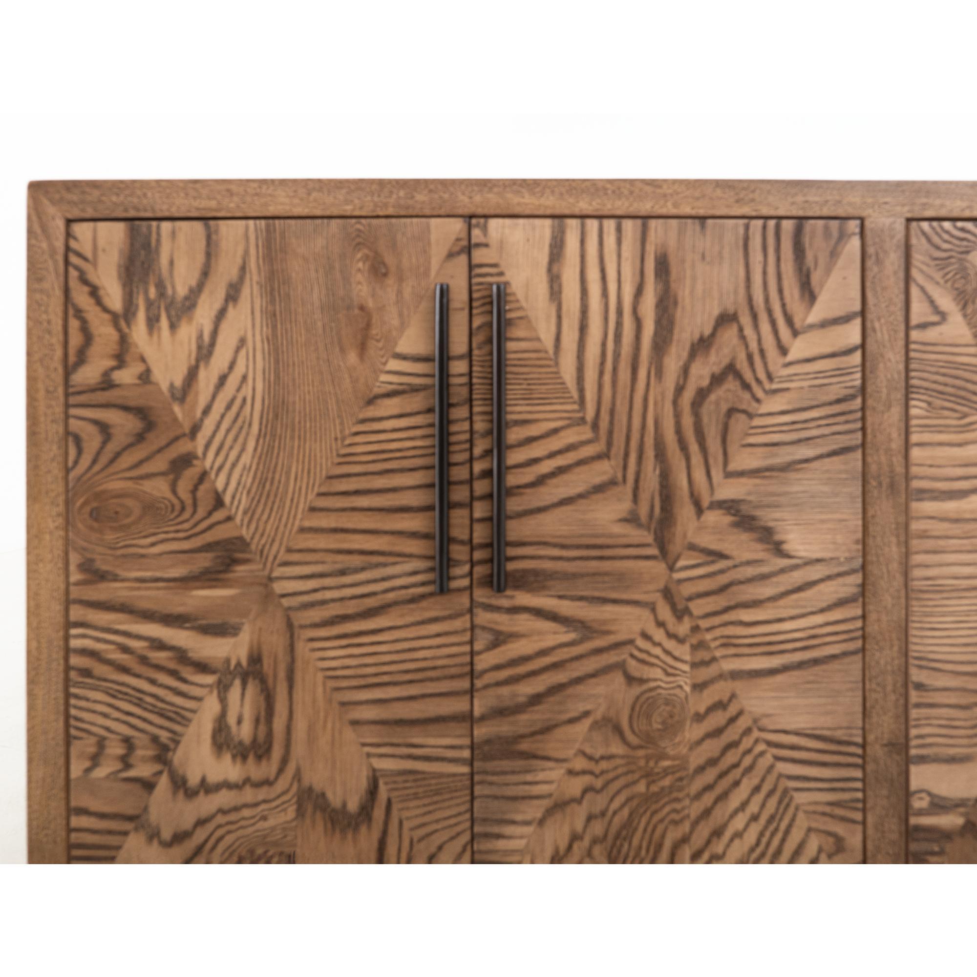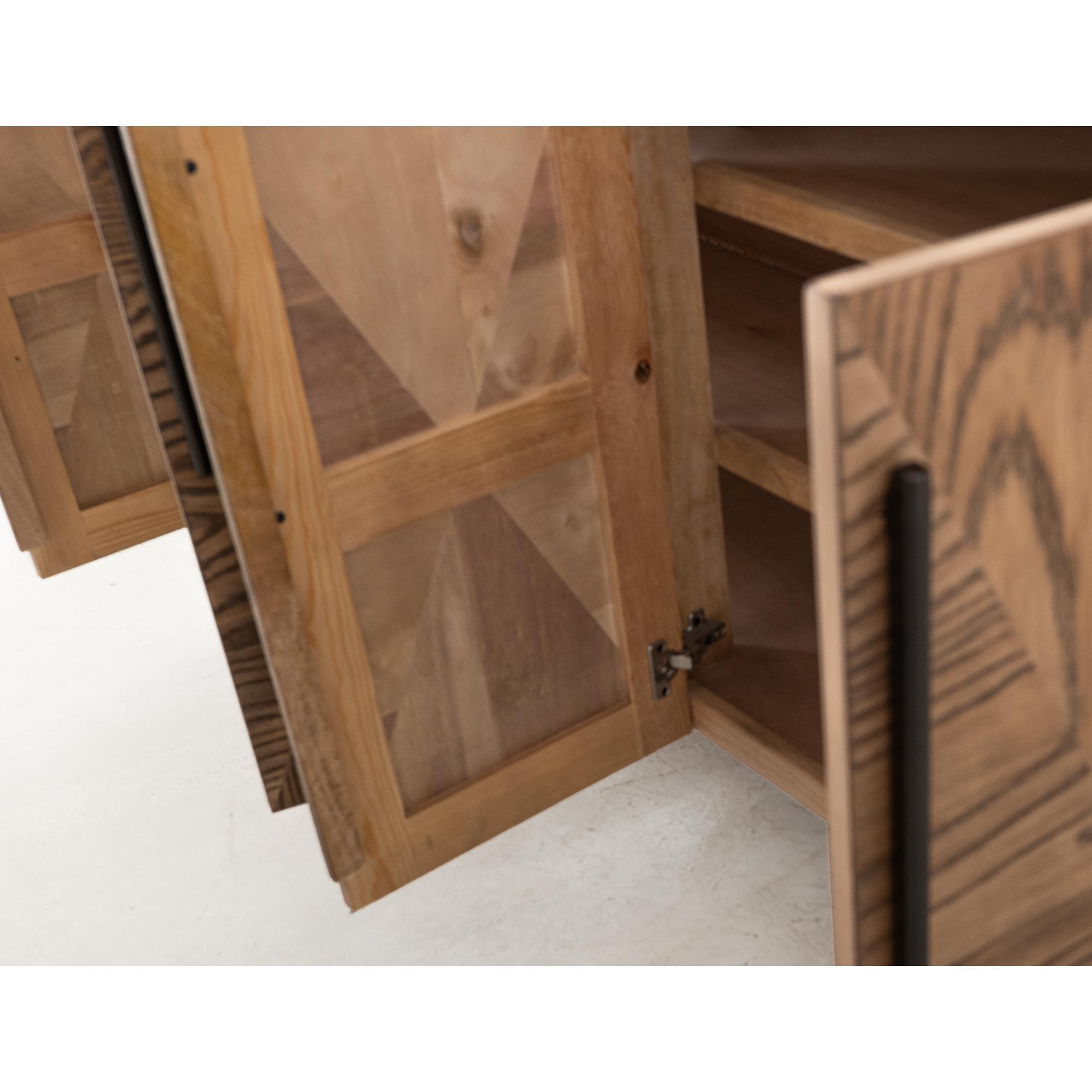 The Verona console combines sculptural elegance, making it a versatile addition to any space. Constructed with a solid mango wood frame and mortise-and-tenon joinery, it offers both strength and artisanal quality. The doors and top are made from engineered ash wood, featuring a bold geometric pattern that showcases the natural wood grain. In contrast, the slim metal base adds a contemporary touch. Custom metal pulls provide a subtle yet refined finishing detail. This console also features an innovative storage solution, complemented by four shelves designed for optimal organization and style.