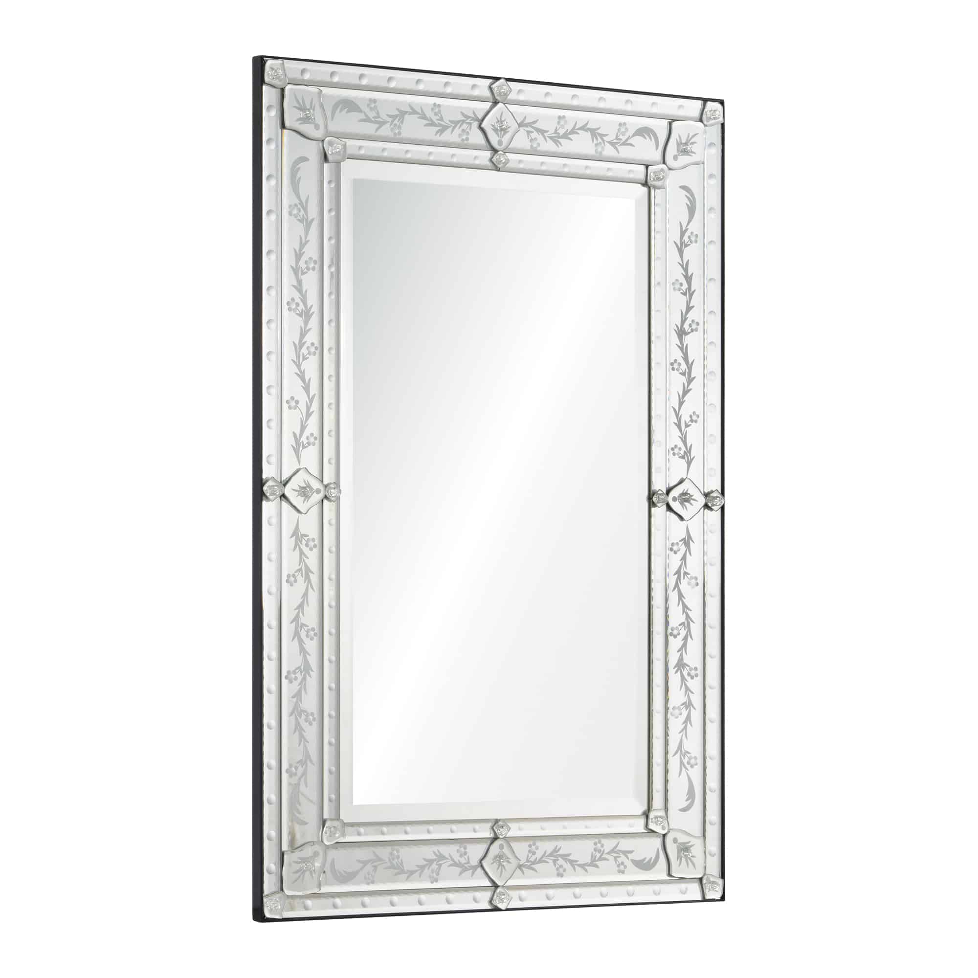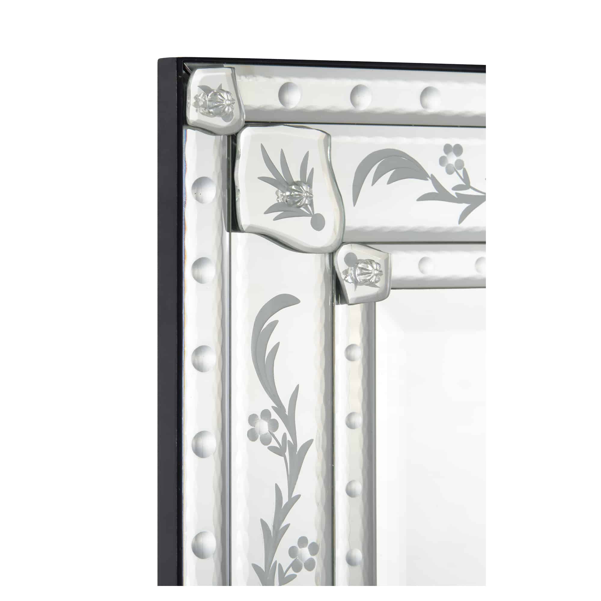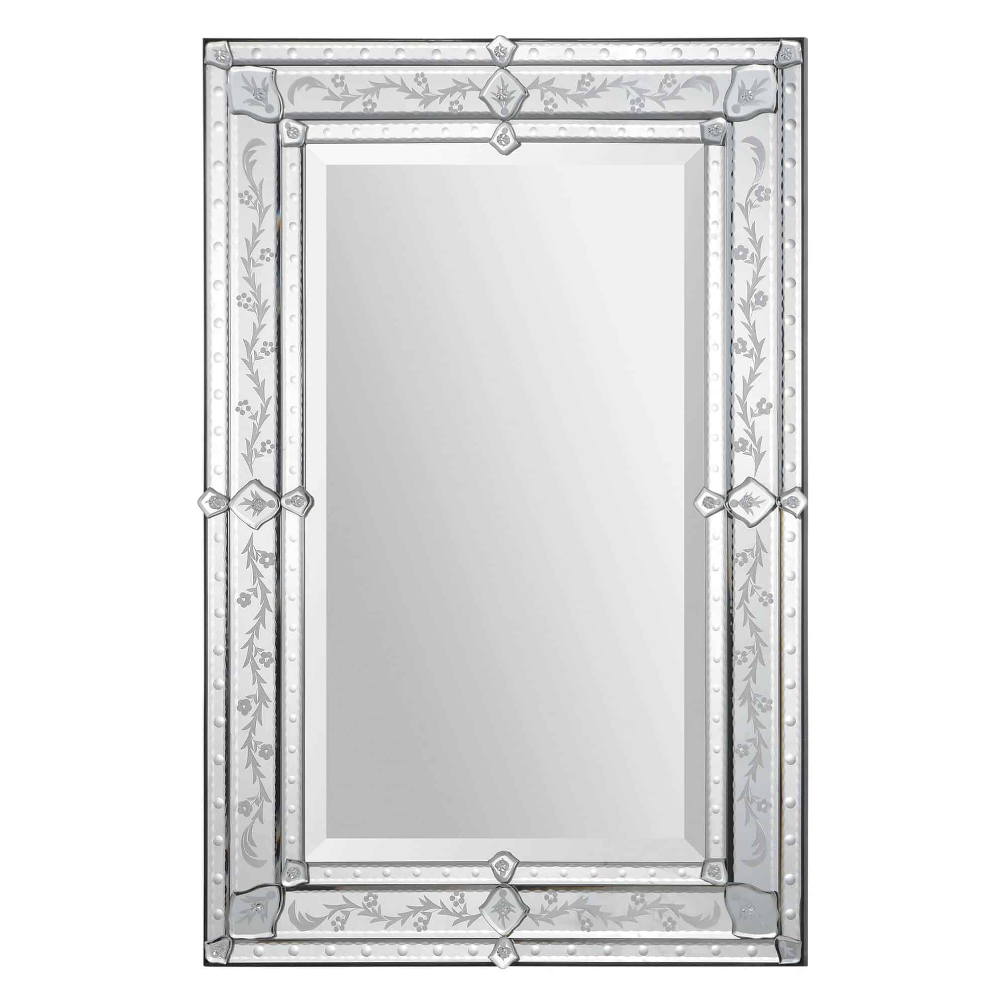 This elegant Venetian mirror features a classic etched pattern frame. Mirror is beveled.