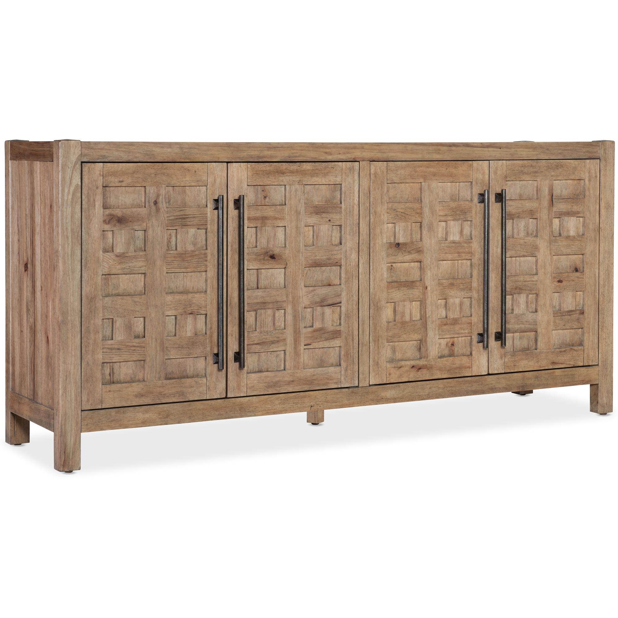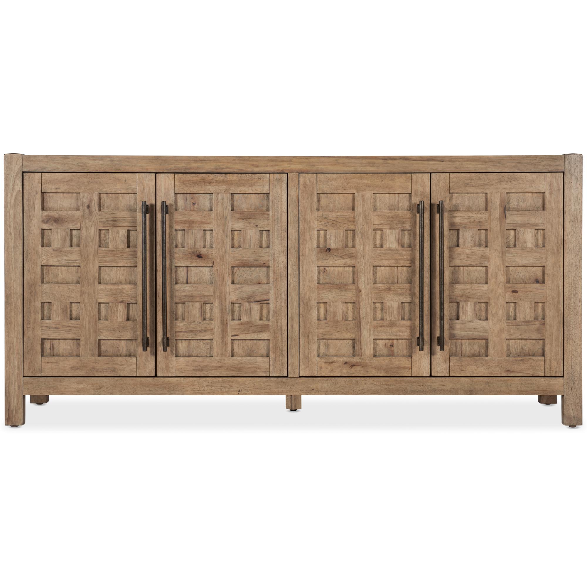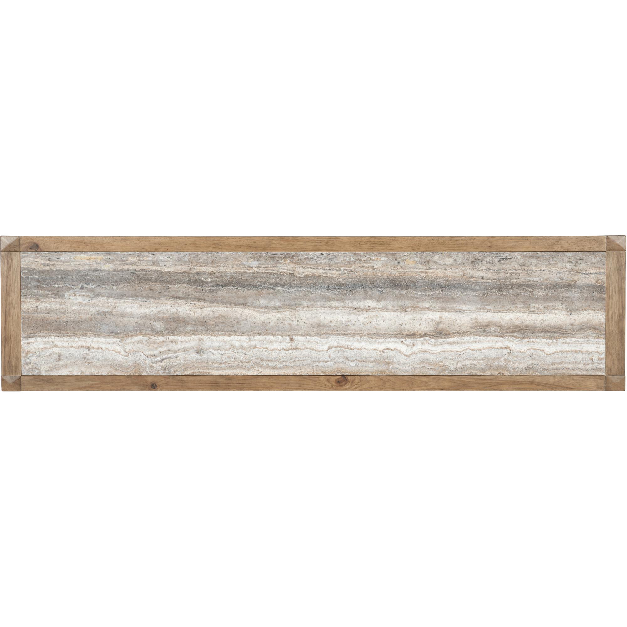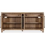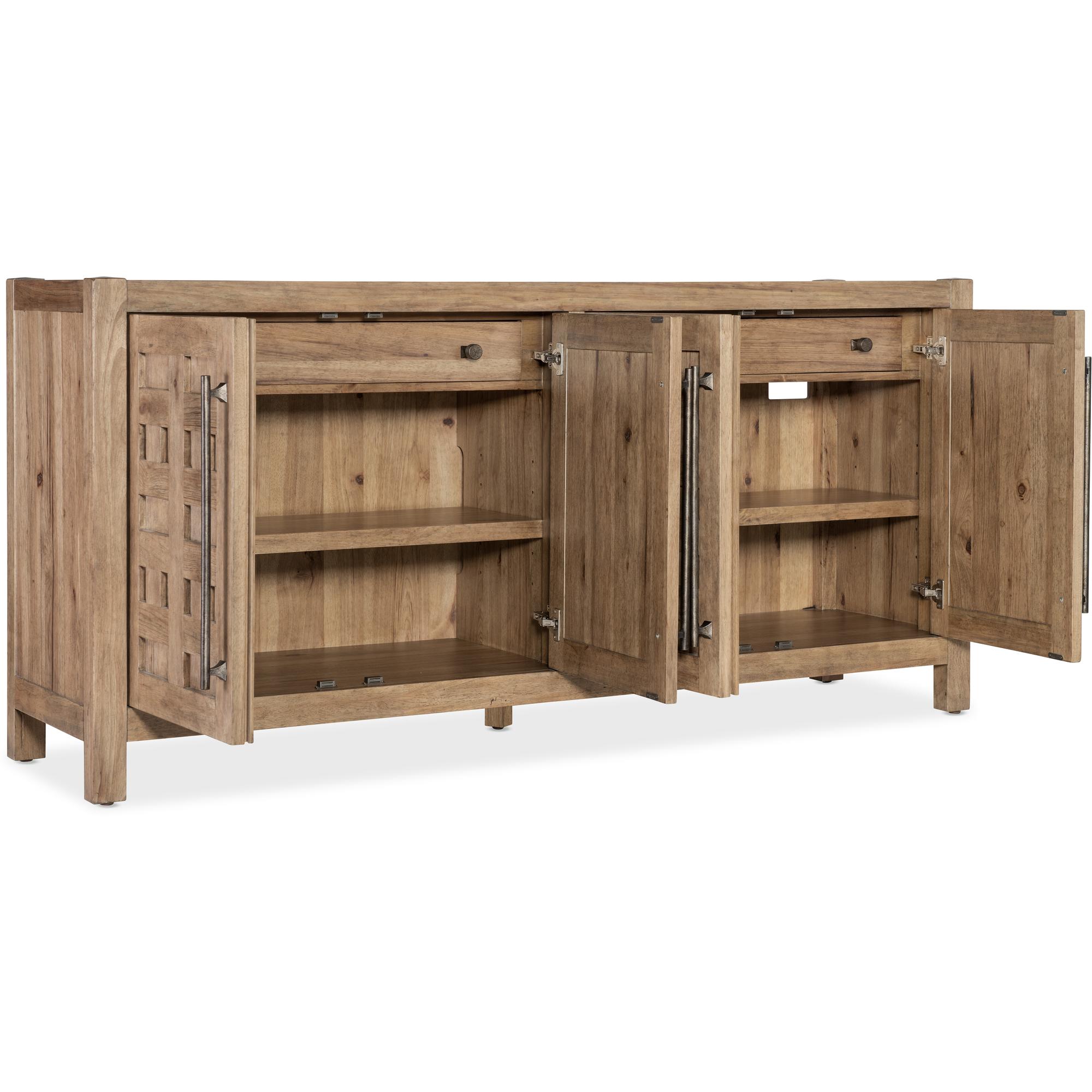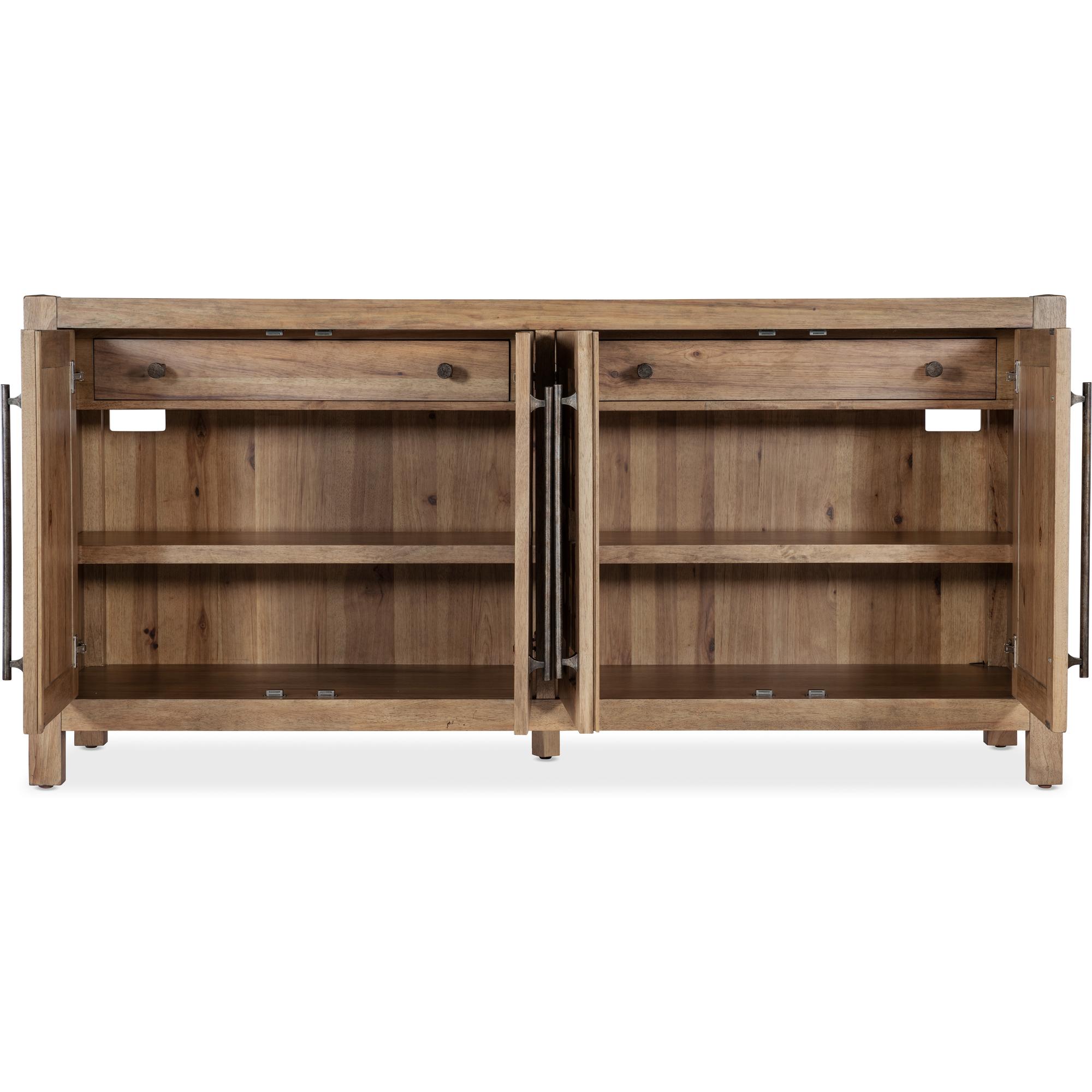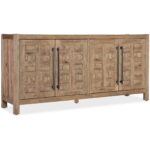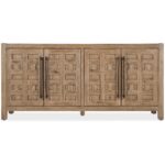Features: Honey gray travertine insert on top Four doors with soft close hinges and magnetic door catches Doors feature cutout fretwork door fronts One self-closing drawer behind each pair of doors Left drawer has removable black felt silverware tray Right drawer has removable black felt liner One adjustable wood shelf behind each pair of doors