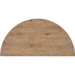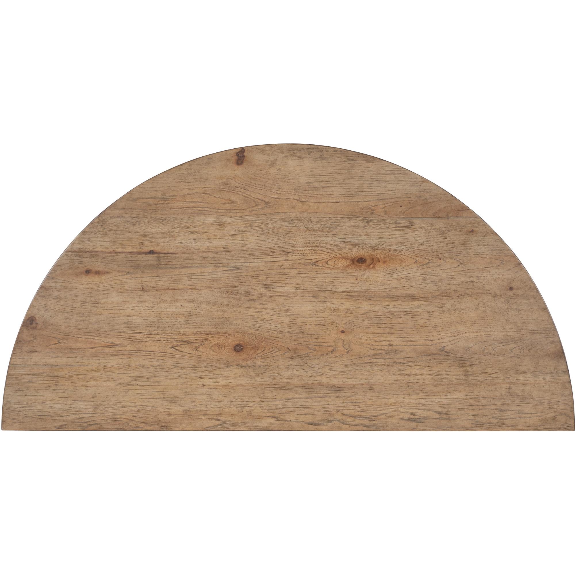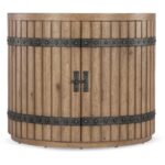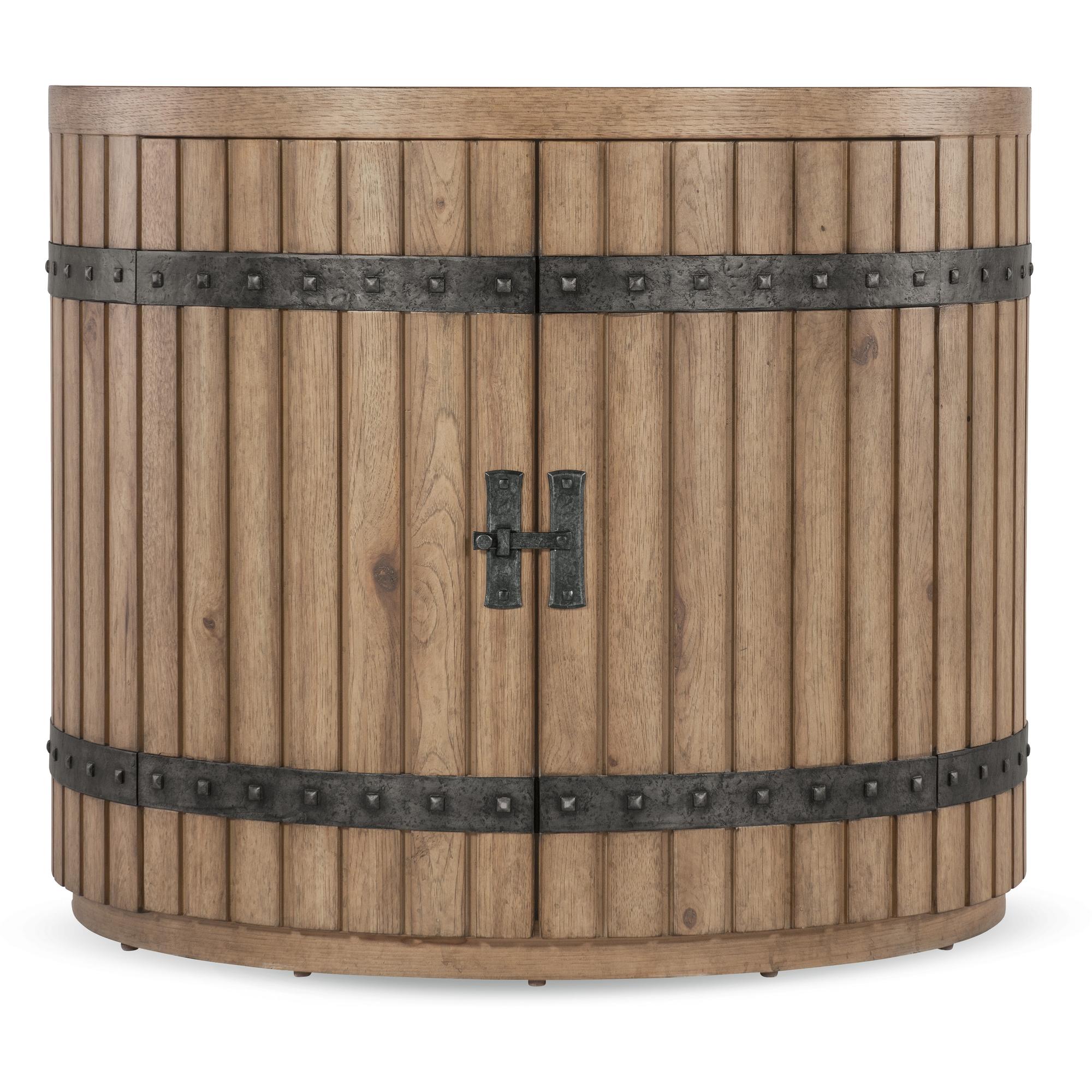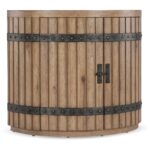 Features: Two doors have soft close hinges and magnetic door catches Two adjustable wood shelves Half circle shape Wine barrel design Rustic, hammered metal accents