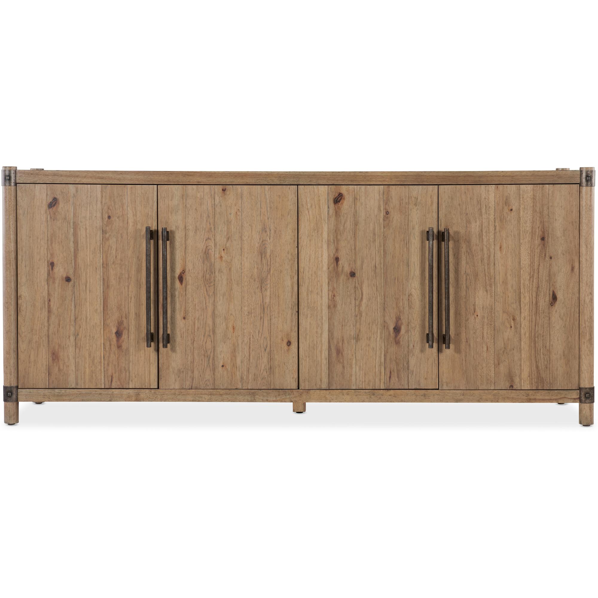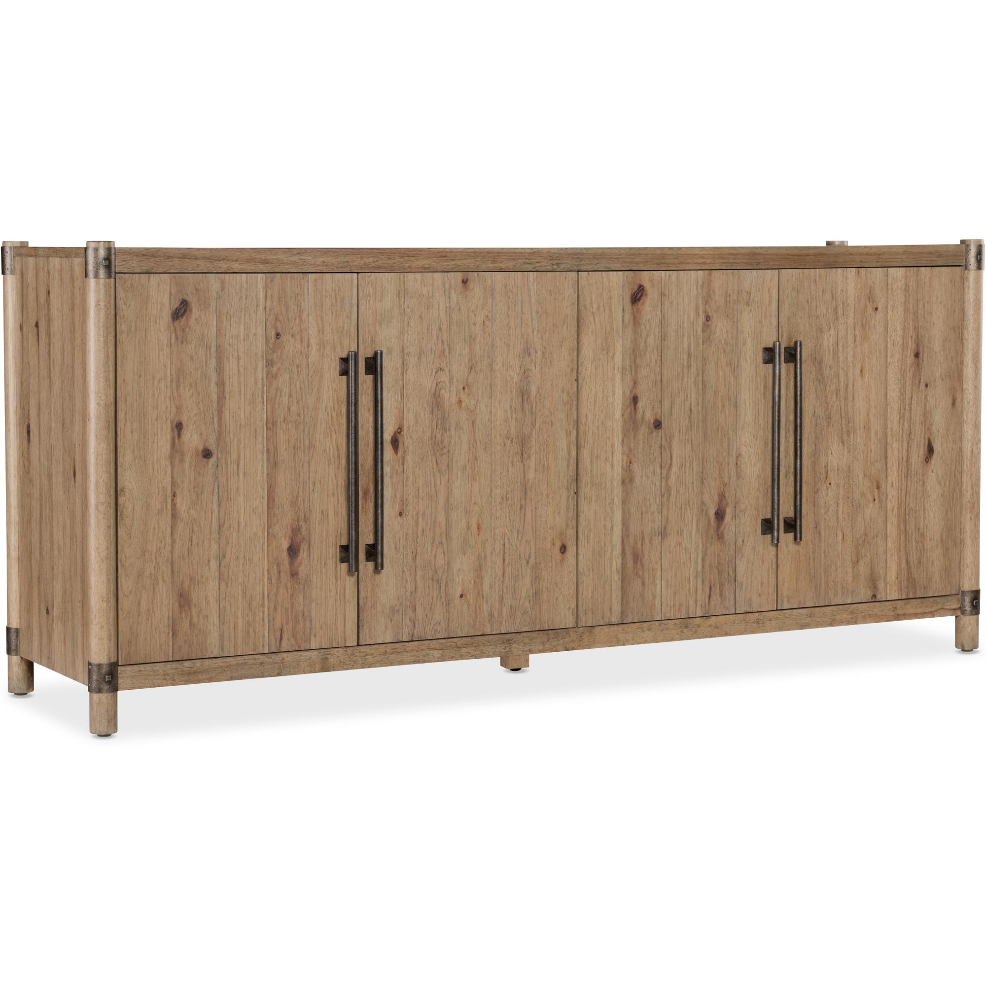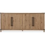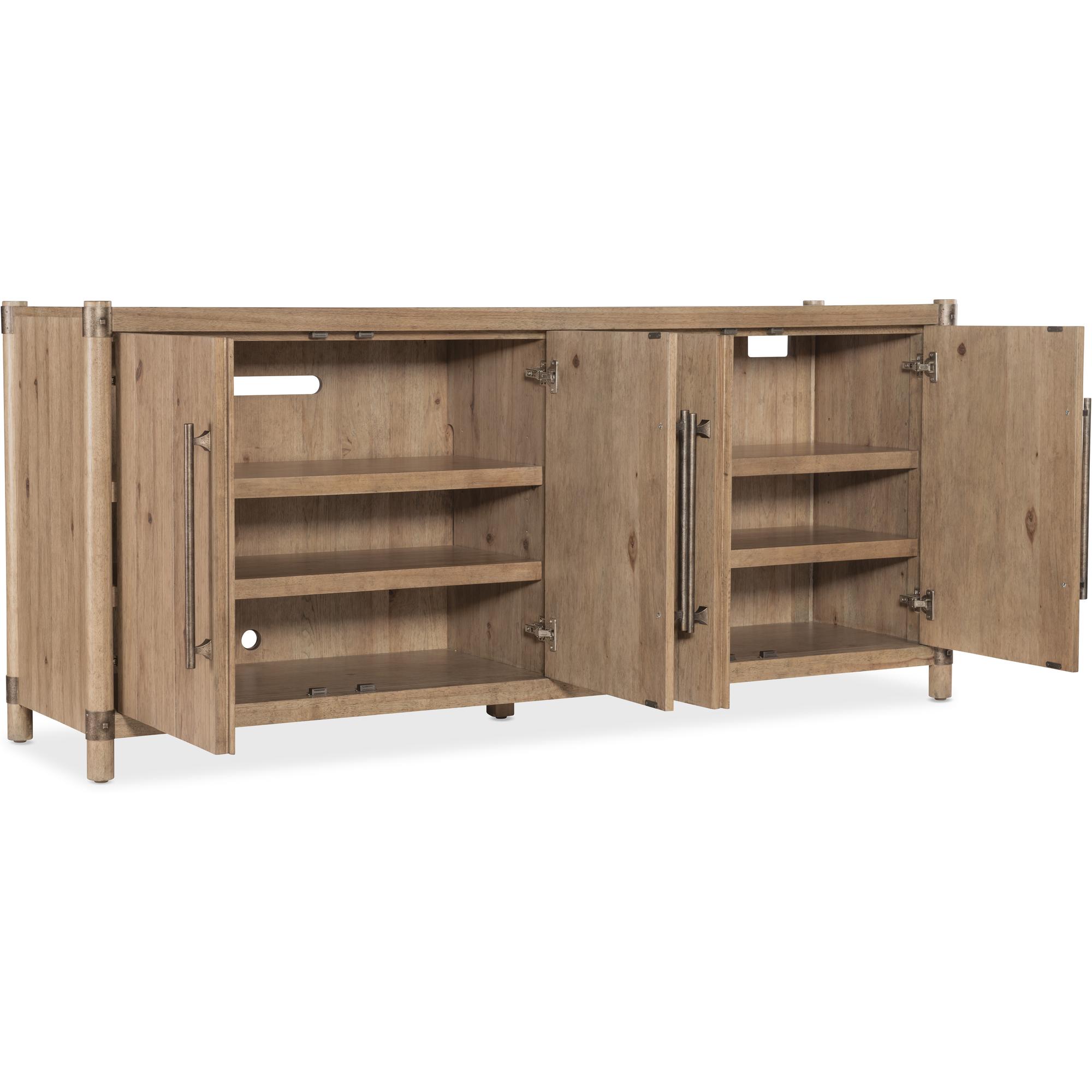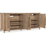 Features: Four doors with soft close hinges and magnetic catches Two adjustable wood shelves behind each pair of doors Ventilated back panel and wire management behind each pair of doors Rustic, hammered metal accents