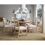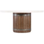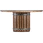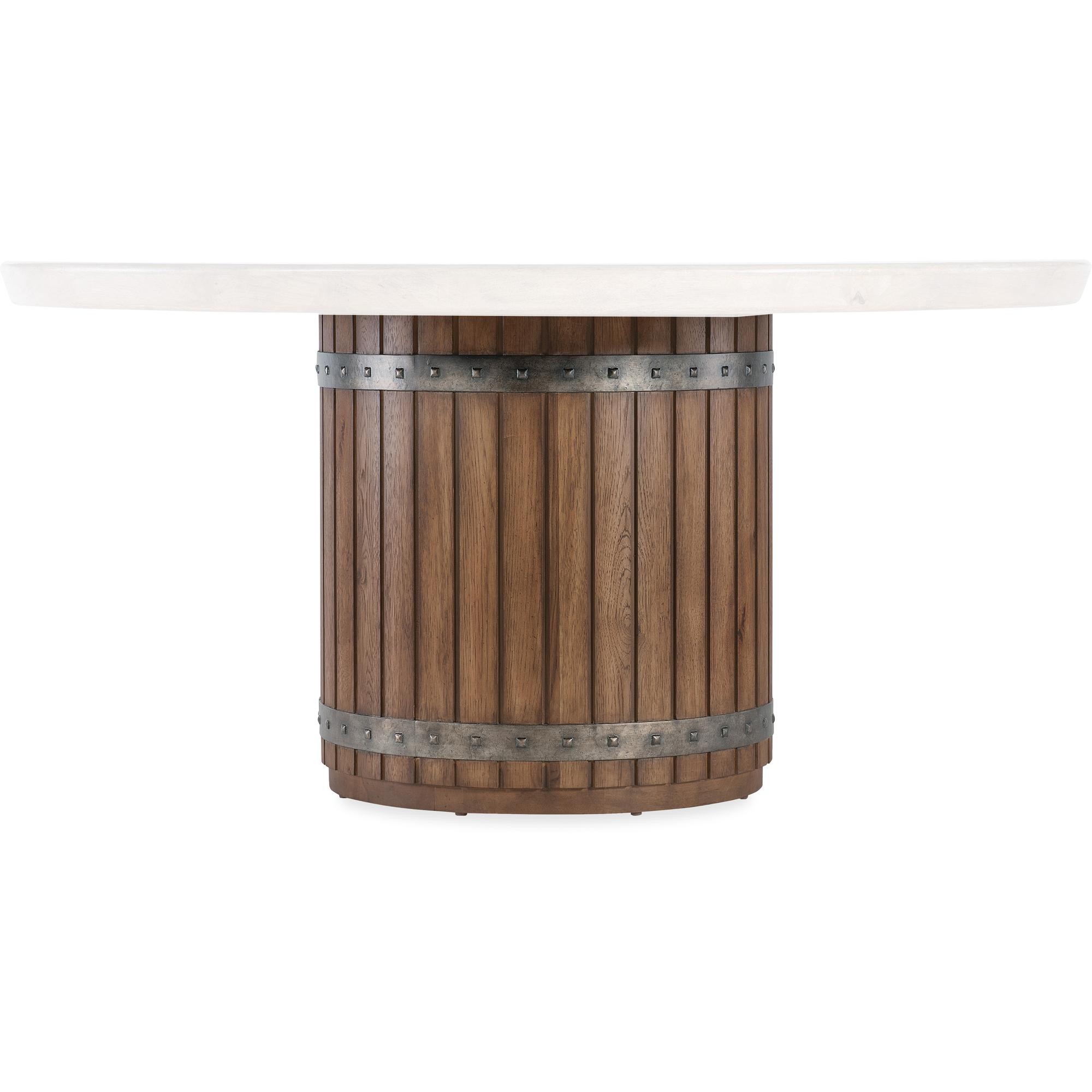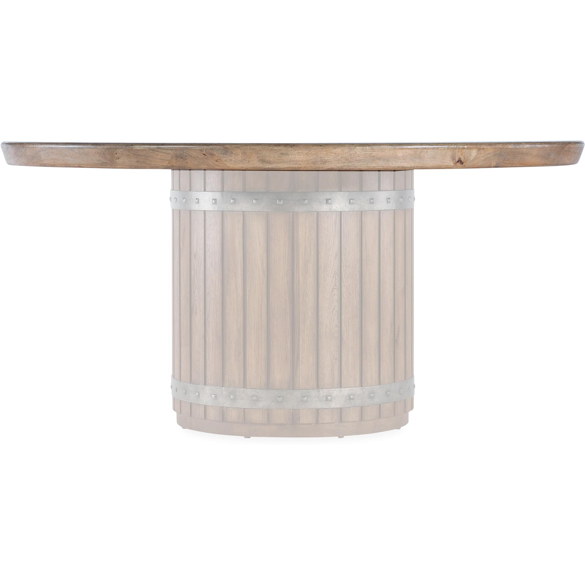 Features: Includes table top and base Round shape Two-tone finish with Sonoma on table top and Napa on table base Wine barrel designed base Rustic, hammered metal accents