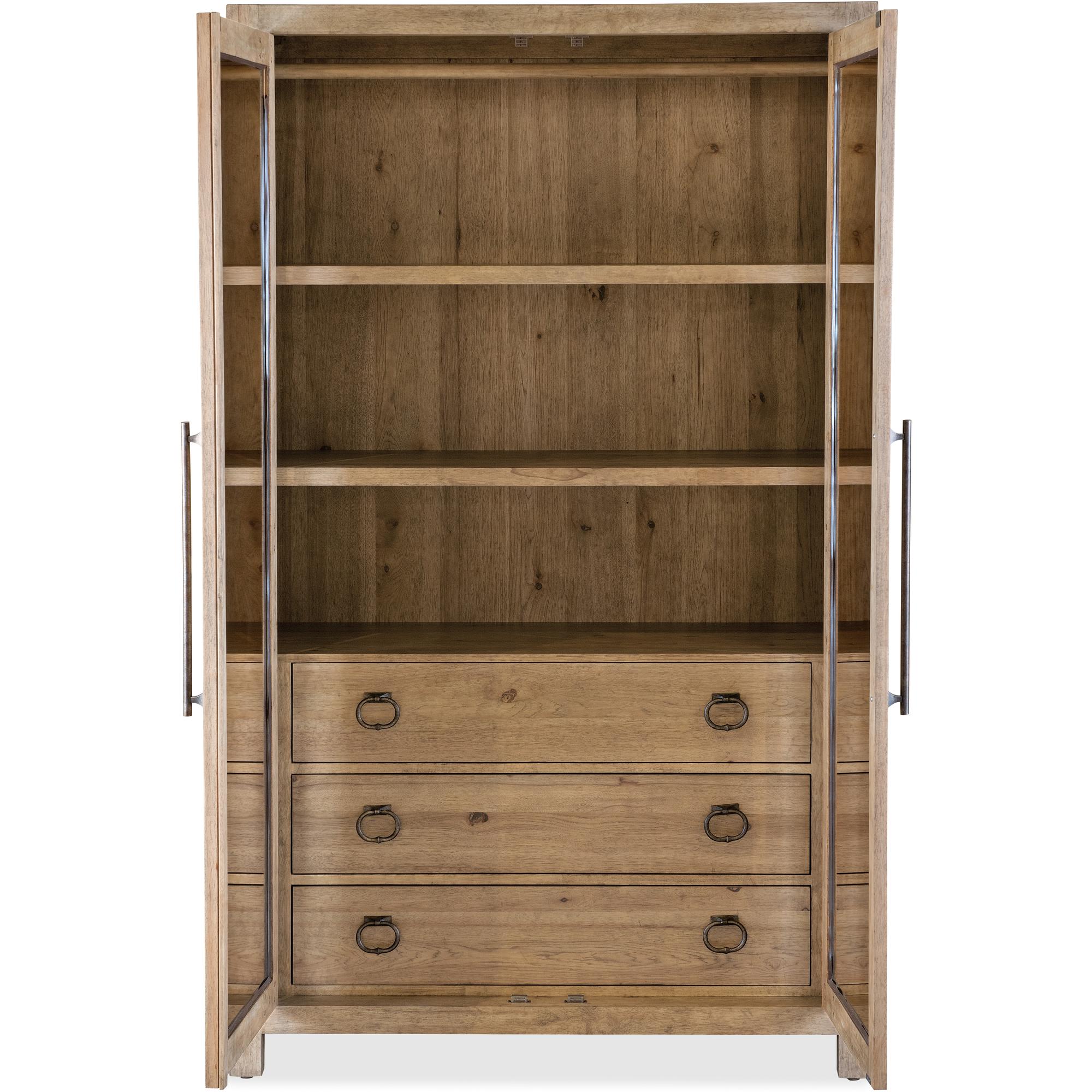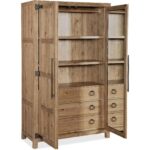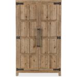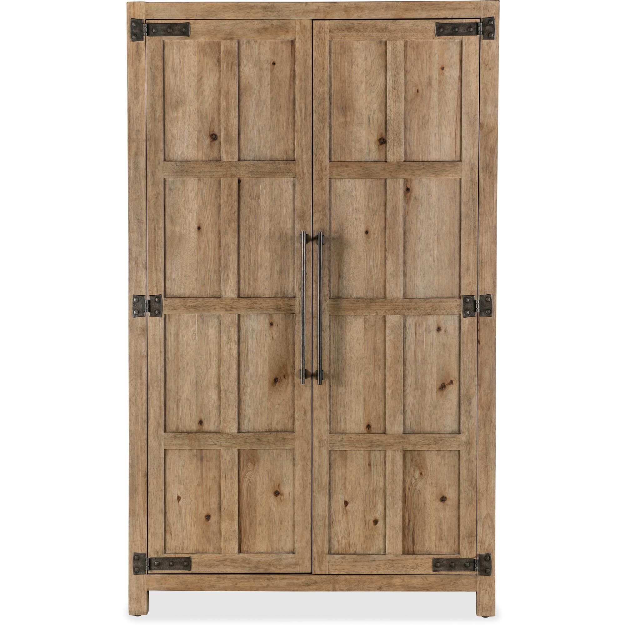 Features: Door fronts feature window pane design Two doors have mirror glass on back of doors One removable clothing rod Two adjustable wood shelves Three self-closing drawers Top drawer has removable black felt lined jewelry tray and one partition Center drawer has removable black felt liner Rustic, hammered metal accents