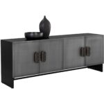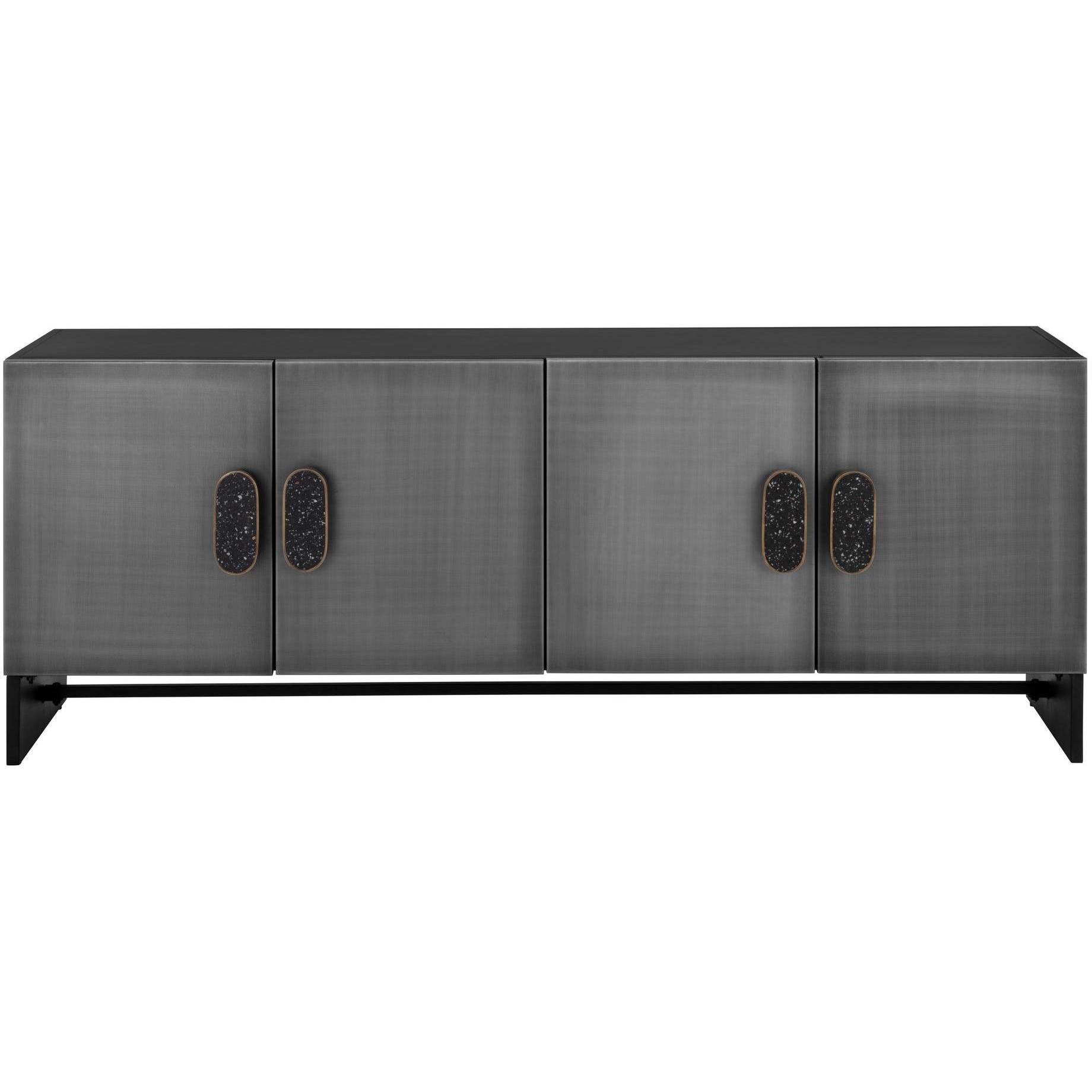 Add a cool and moody atmosphere to your dining space with the Viserys Sideboard. Features a black powder-coated frame and black terrazzo marble handles. Antique zinc iron doors add a faded lived in look to the piece. Made in India. With refined craftsmanship, this design was brought to life by skilled local artisans. Due to the nature of handcraftsmanship, unique imperfections such as fissures, markings and variations in colour and shape are welcomed and appreciated characteristics for a truly one-of-a-kind piece.
