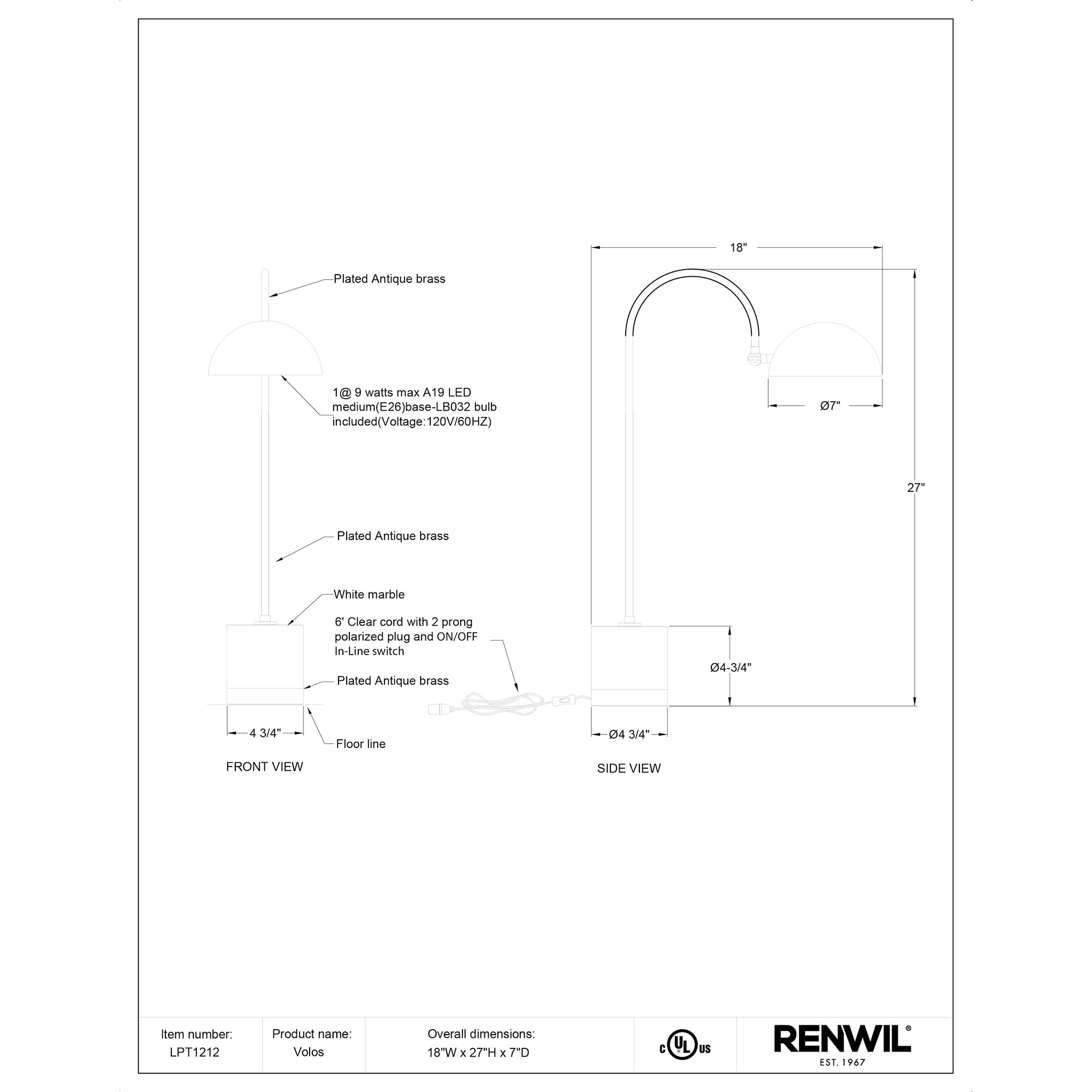 The home or business office takes on a luxe, designer quality when this table lamp enters the interior. Contrasting tones, textures and design details bring an intriguing element to this piece, allowing it to stand out without the need for additional accessories. The table lamp’s antique brush brass finish, moveable dome and marble base combine beauty and purpose. Within the contemporary interior, it pairs equally well with wood and leather textiles as it does with metal and fabric.