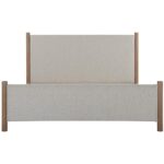 - Classic four post bed. Soft textured fabric upholstery pairs with rustic finish leg