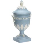 Graced with touches of white, the Wedgewood Urn in blue is an elegant and classic shape that can be used on bookshelves or tabletops.