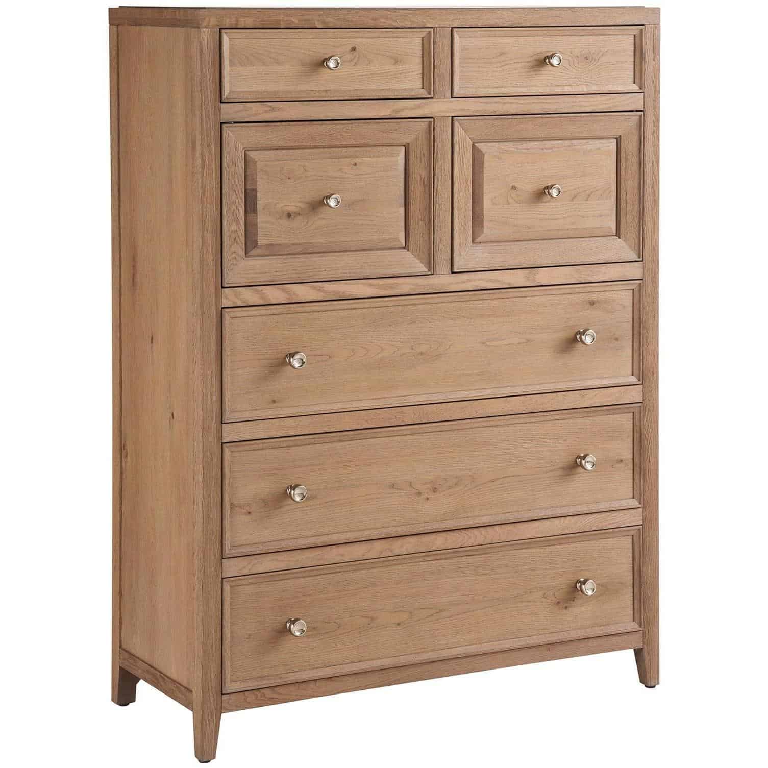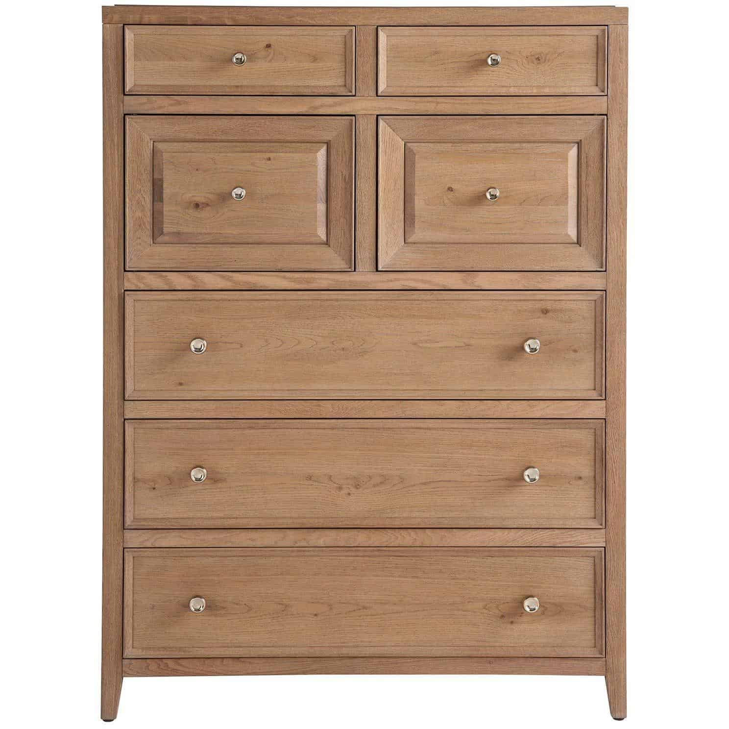 The Weekender Dressing Chest strikes an ideal balance between classic and modern, featuring a tall silhouette with drawers of varying sizes and a versatile knotty oak finish.