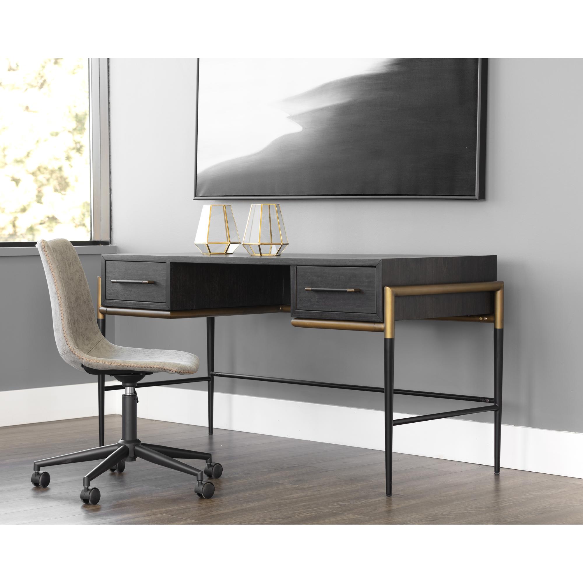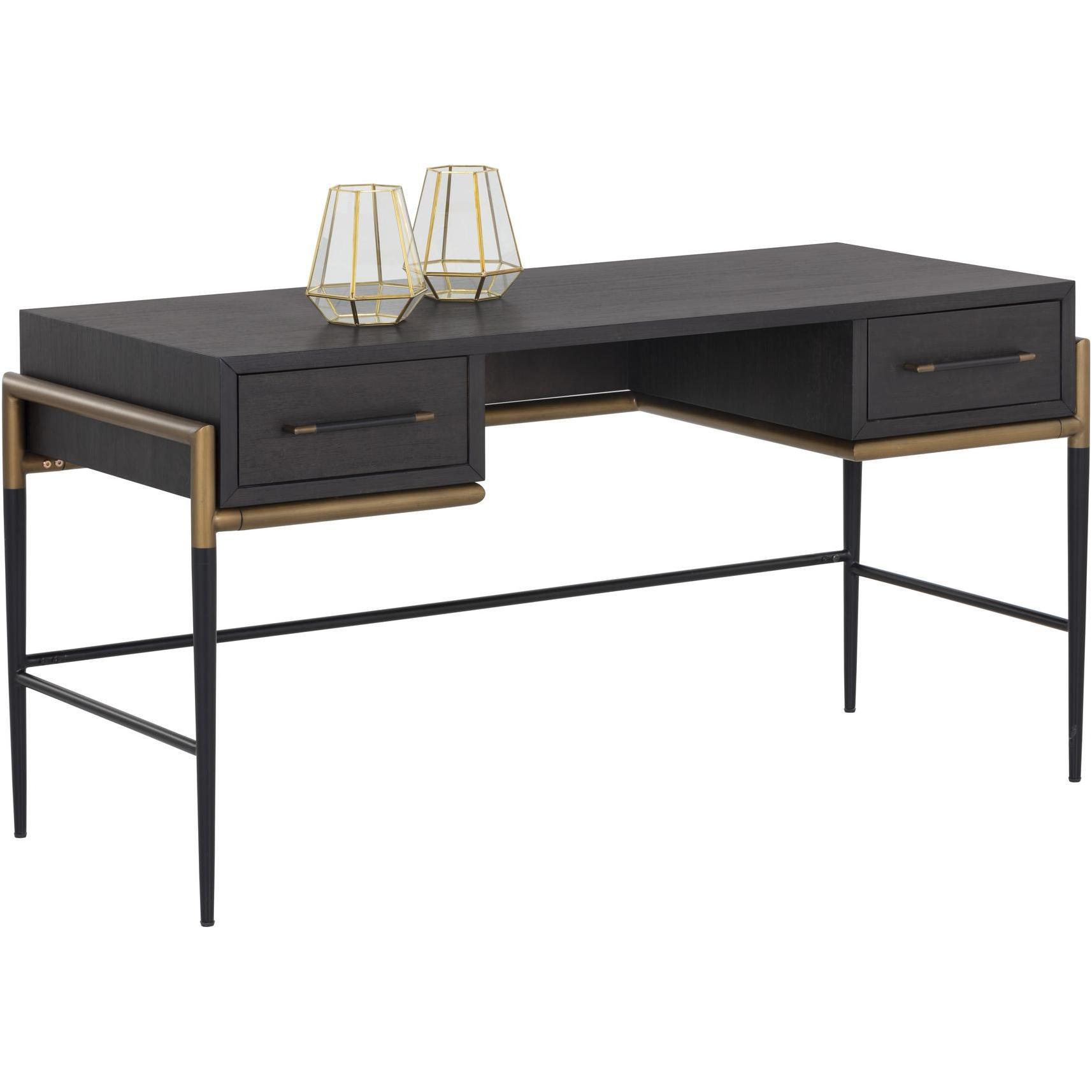 Make a statement with this stylish desk that exudes prestige. Features a espresso acacia wood veneer with two soft closing drawers. Completed with black and antique brass iron handles with coordinating base. As wood is an organic, porous material, these pieces will contain natural variation of texture and may also exhibit fine indentations and cracks. Wood pieces will also display a disparity of colour and grain, and visible knots and burls that add to the character of each piece.