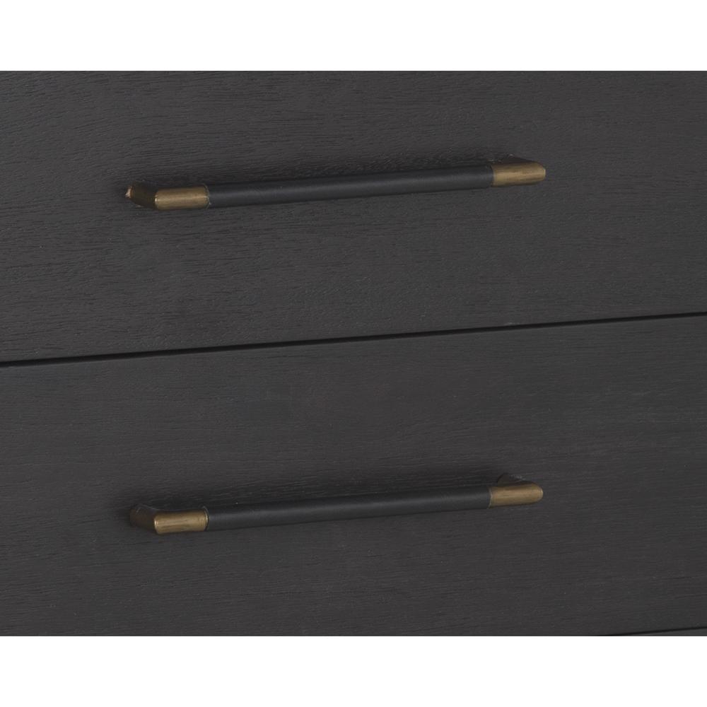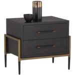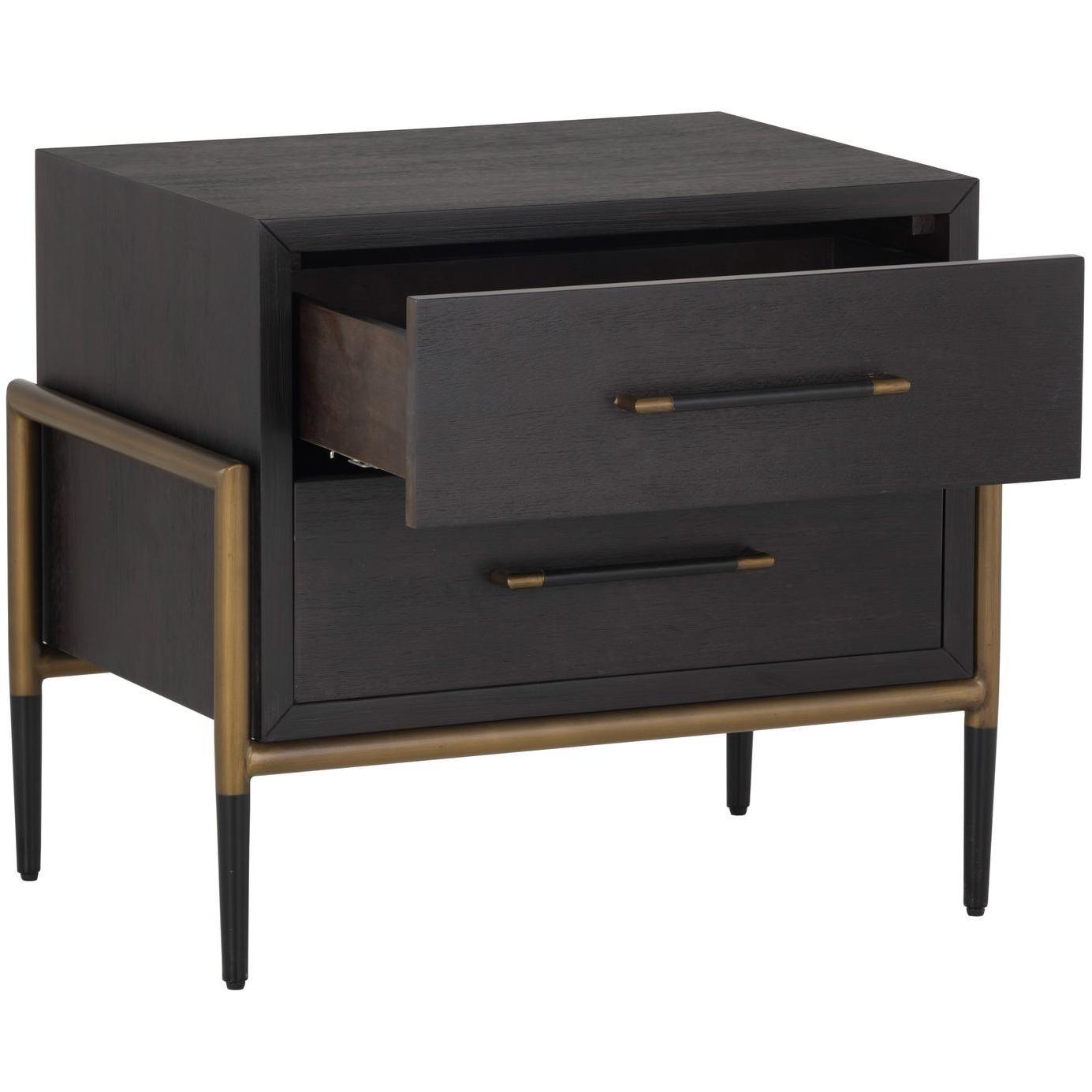 Make a statement with this stylish nightstand that exudes prestige. Features a espresso acacia wood veneer with two soft closing drawers. Completed with black and antique brass iron handles with a coordinating base. As wood is an organic, porous material, these pieces will contain natural variation of texture and may also exhibit fine indentations and cracks. Wood pieces will also display a disparity of colour and grain, and visible knots and burls that add to the character of each piece.