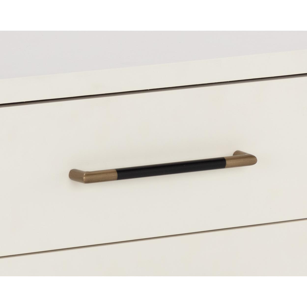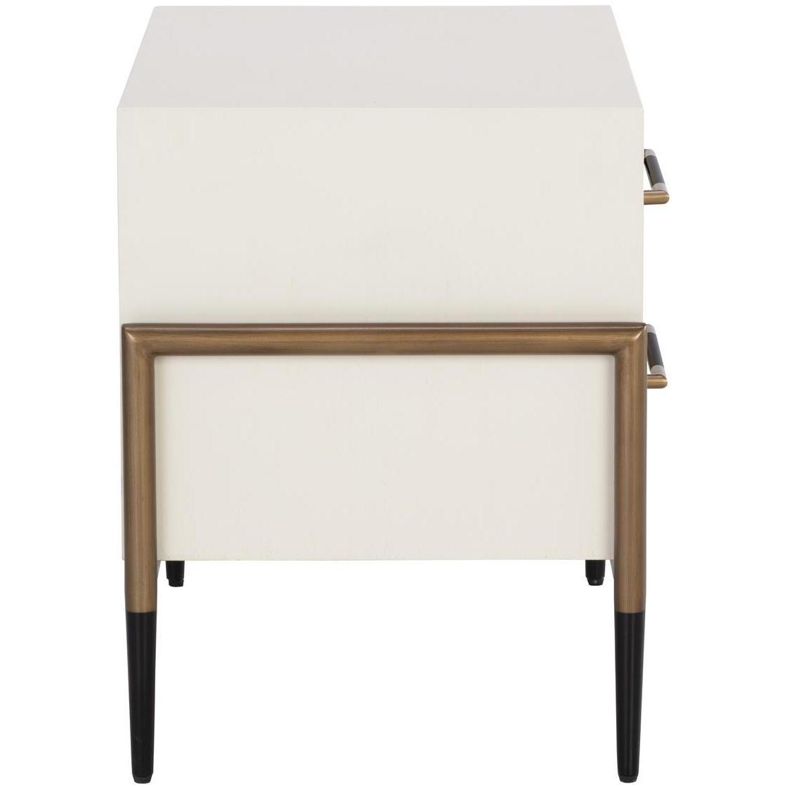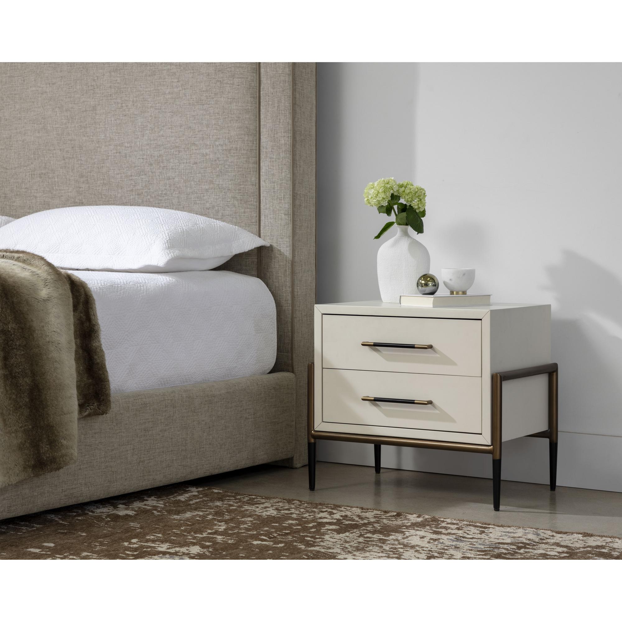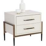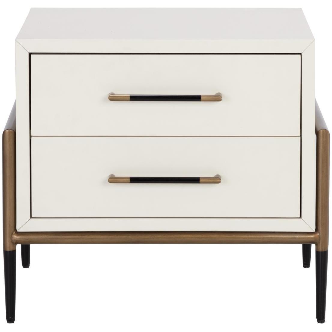 Make a statement with this stylish nightstand that exudes prestige. Features a oyster acacia wood veneer with two soft closing drawers. Completed with powder coated black and antique brass iron handles with a coordinating base.