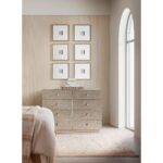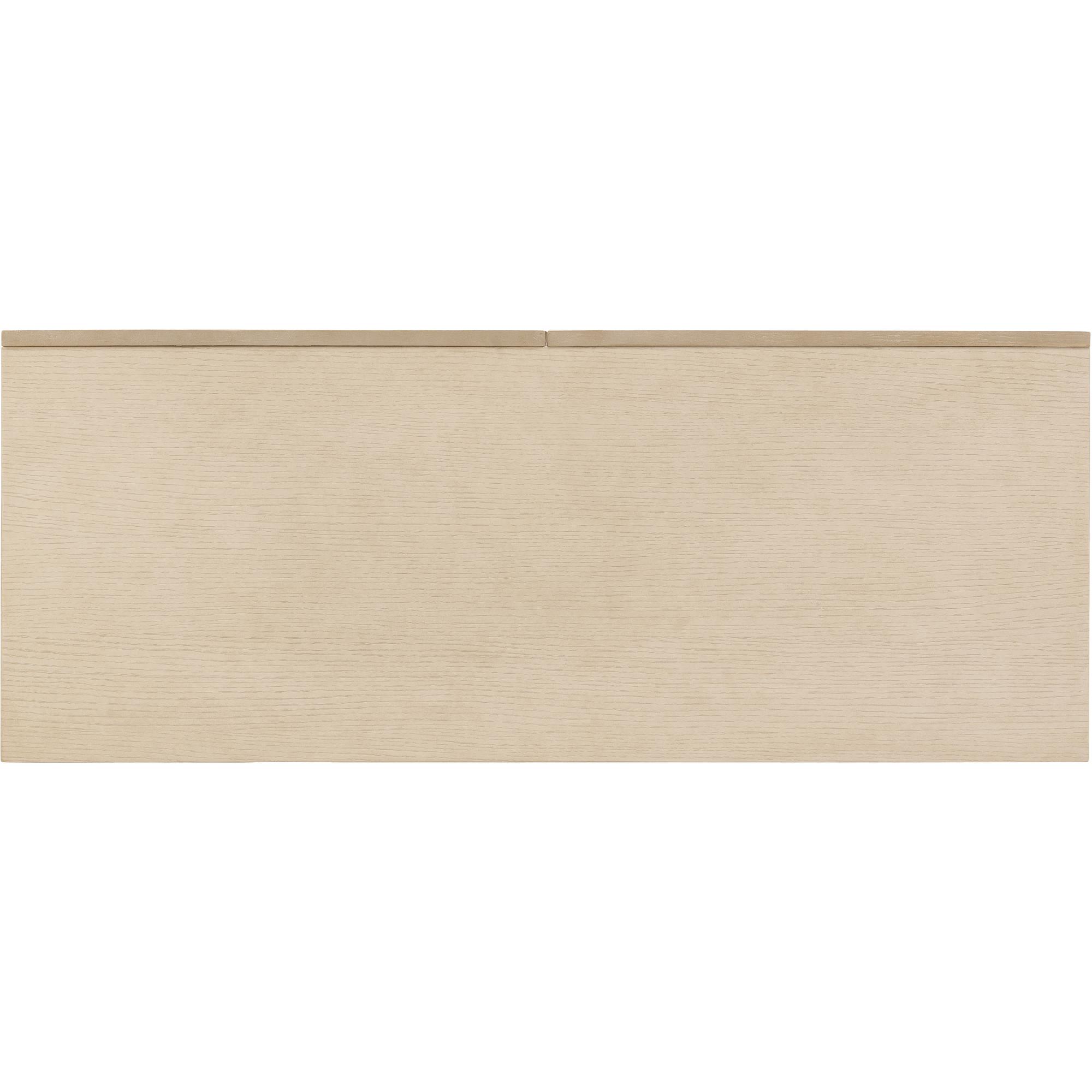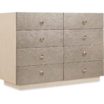 Finish: Polished Limestone finish on quartered oak veneers on sides and top with Venetian Dawn silver-leaf décor on door fronts. Plated Radiance finish on hardware knobs.