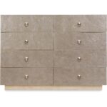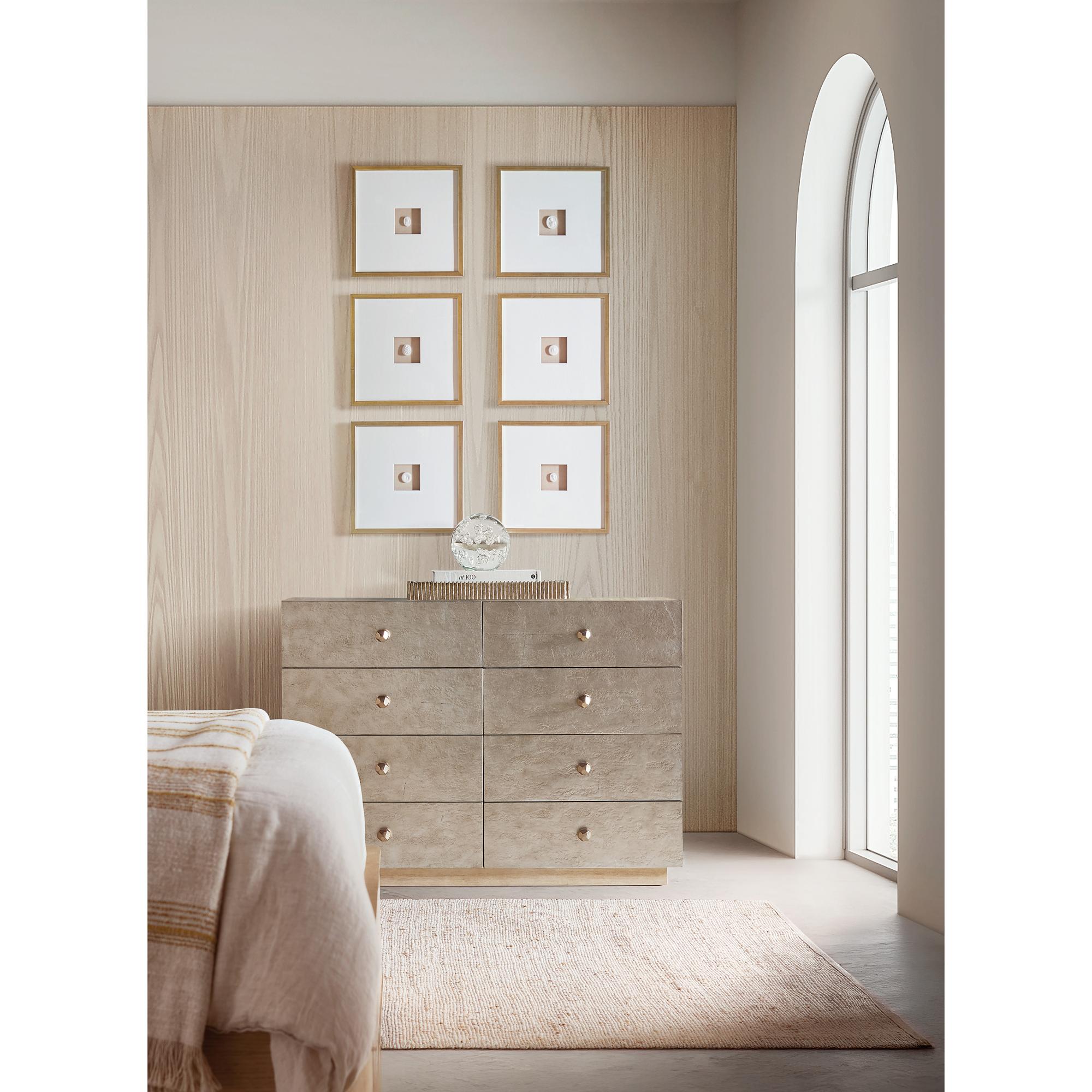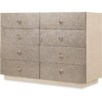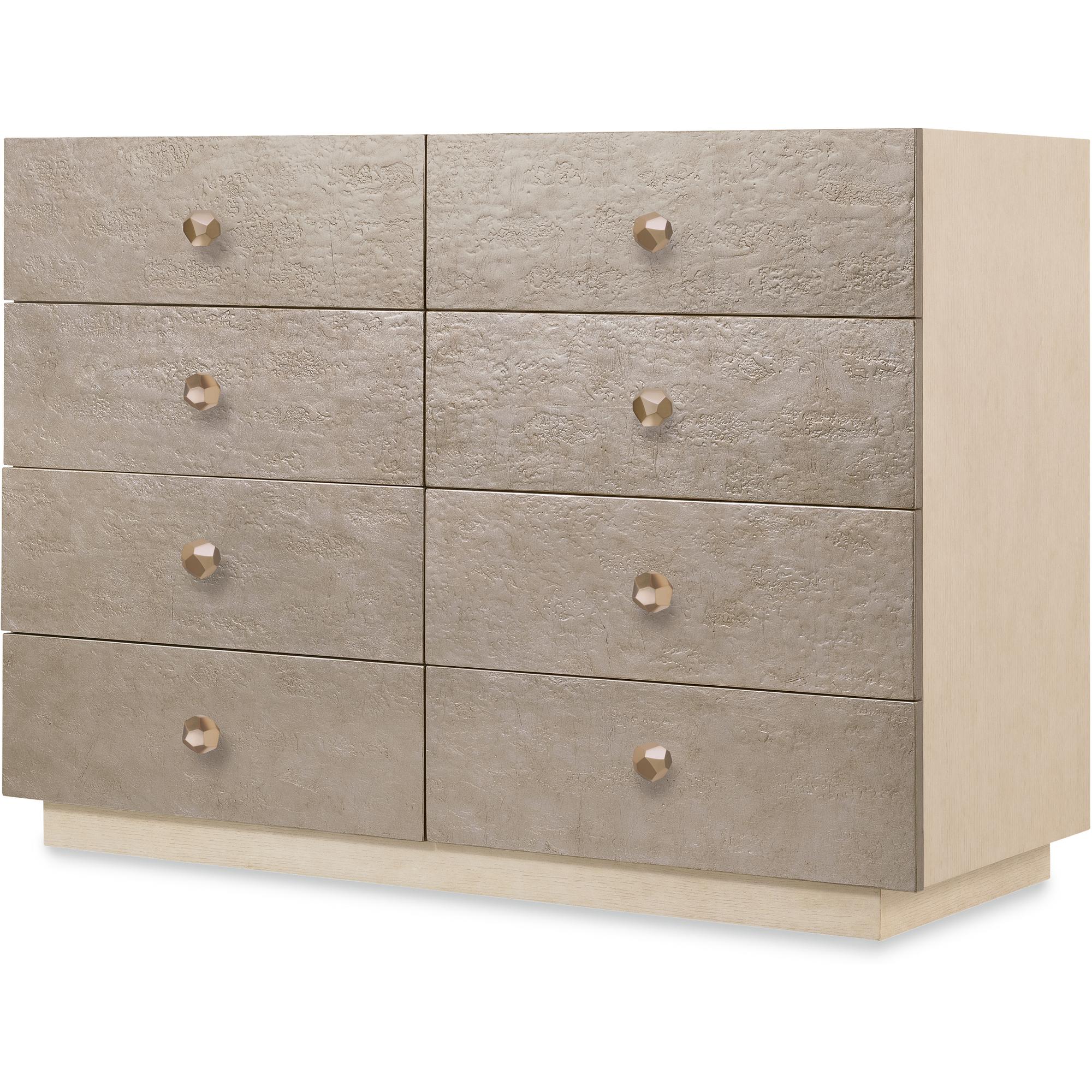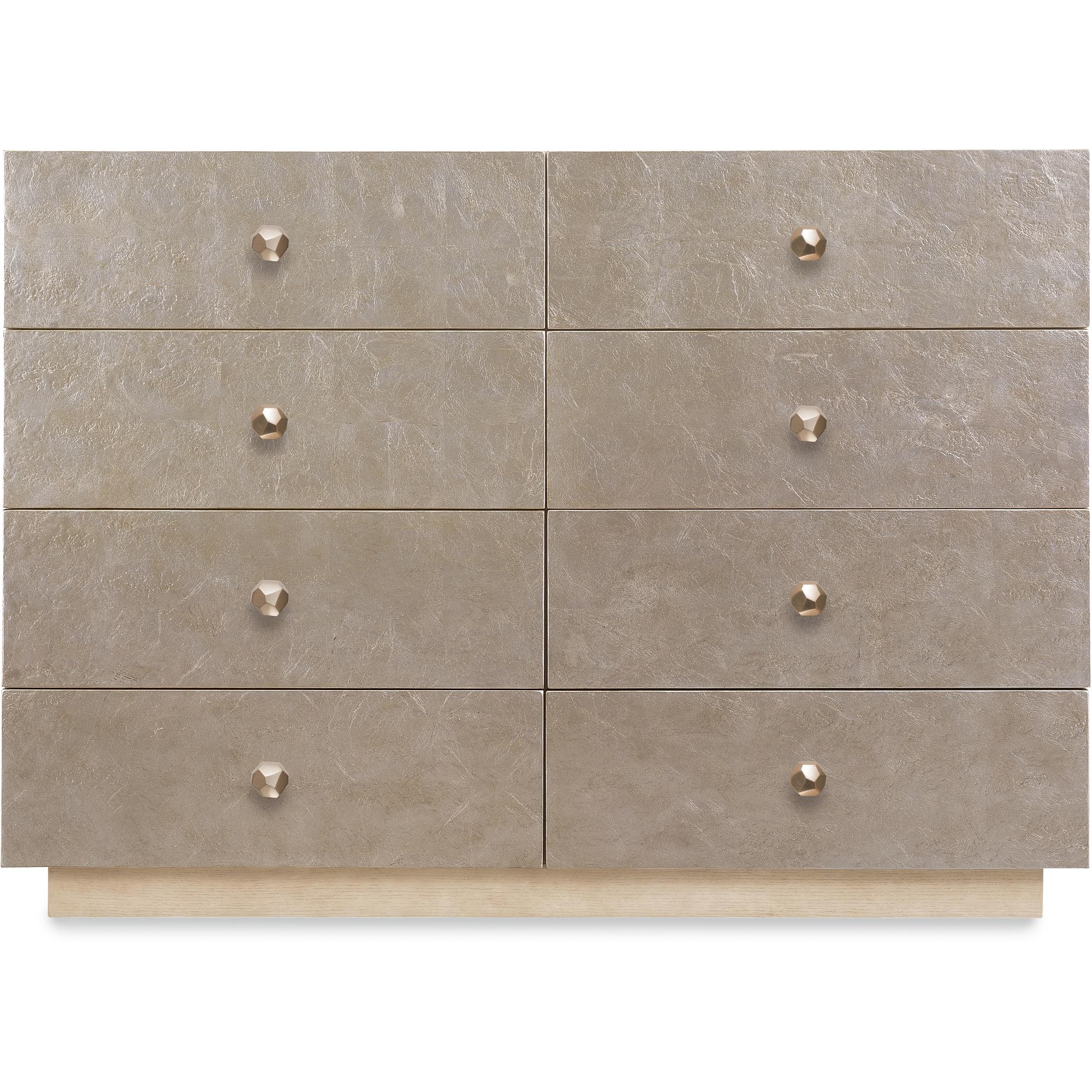 Features: Eight drawers Contrasting silver leaf finished drawer fronts Oak veneer drawer bottoms on top six drawers Cedar-lined bottom drawers Plinth base