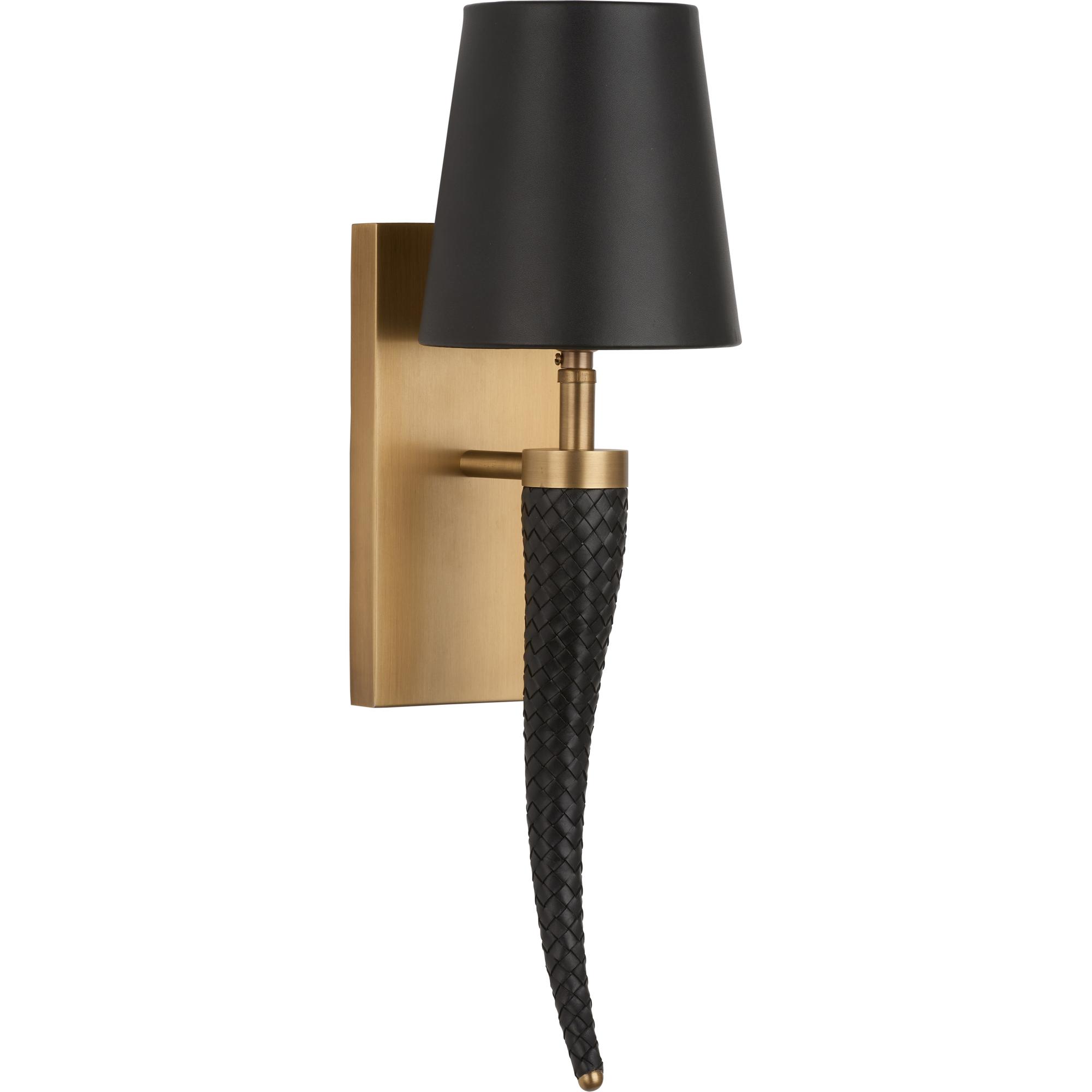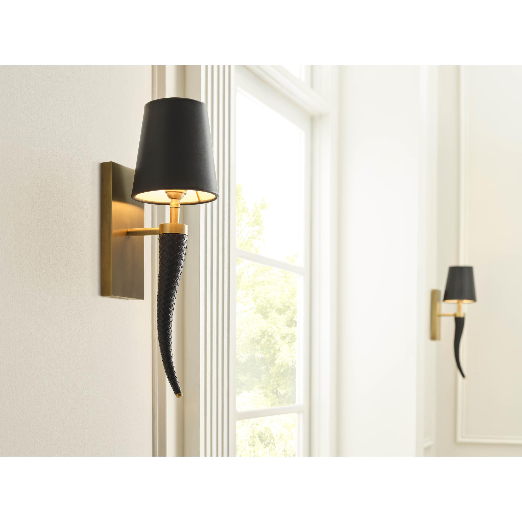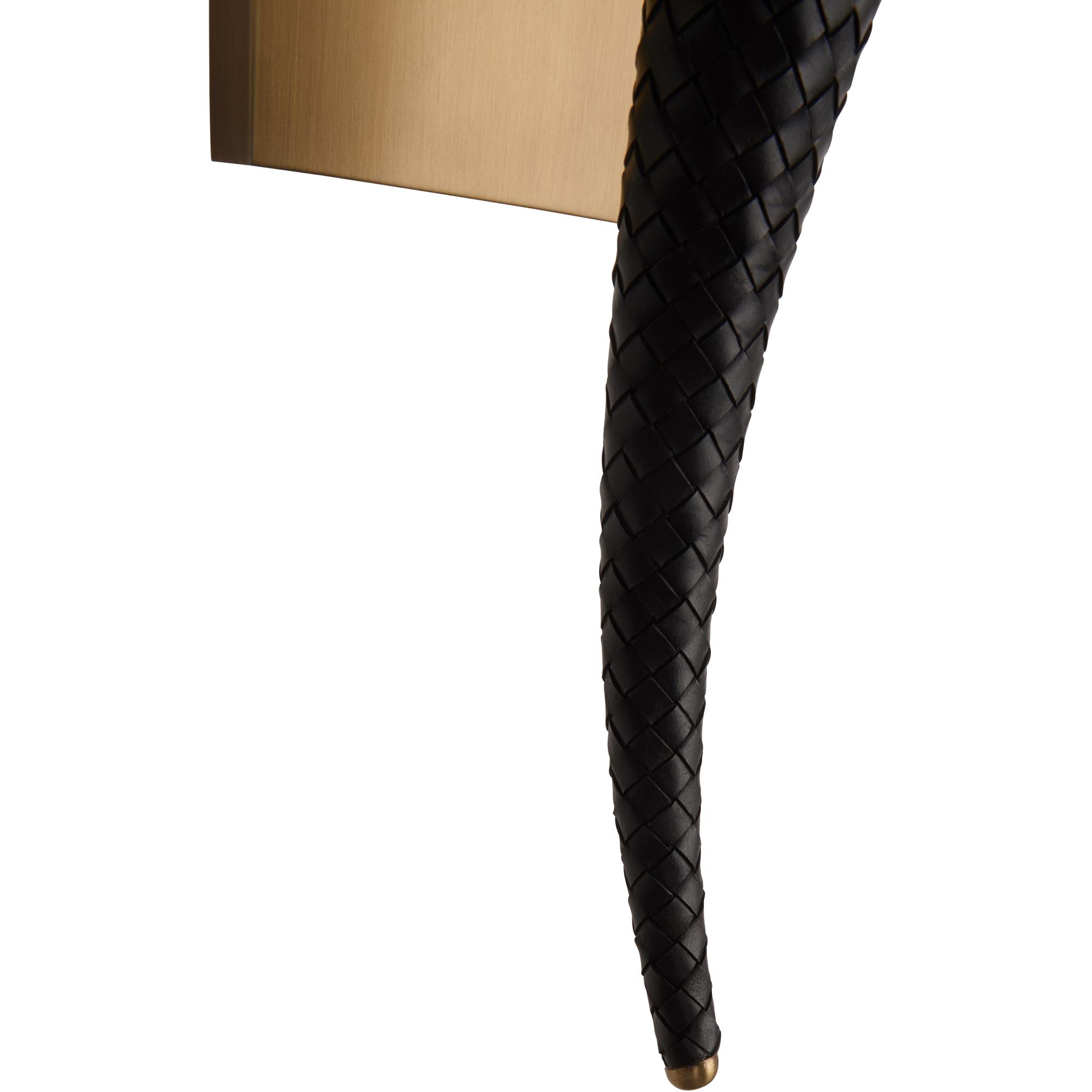 The Wexler Sconce is a bold fusion of braided leather and brass, offering a refined yet distinctive design. With its sculptural horn-like form and sleek black shade, this sconce brings a sophisticated edge to any space, perfect for adding warmth and character to your walls.