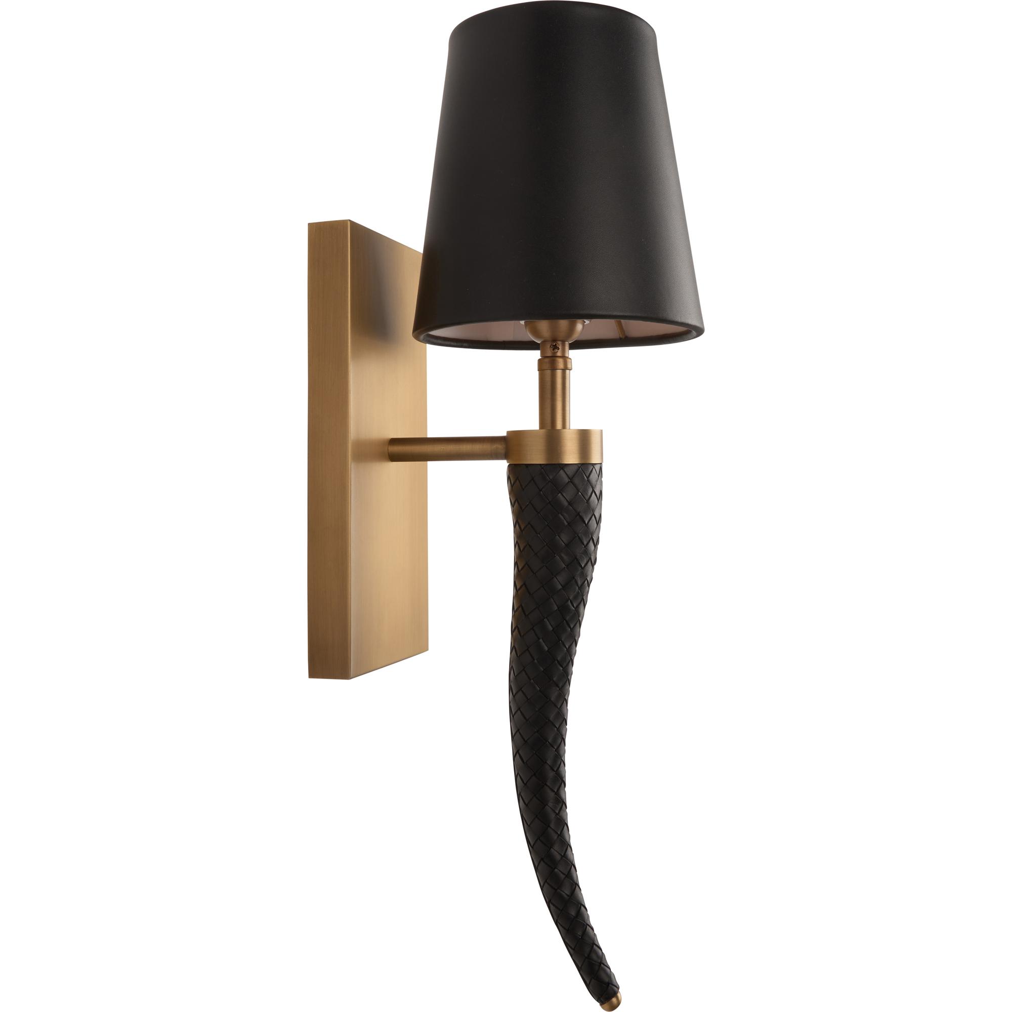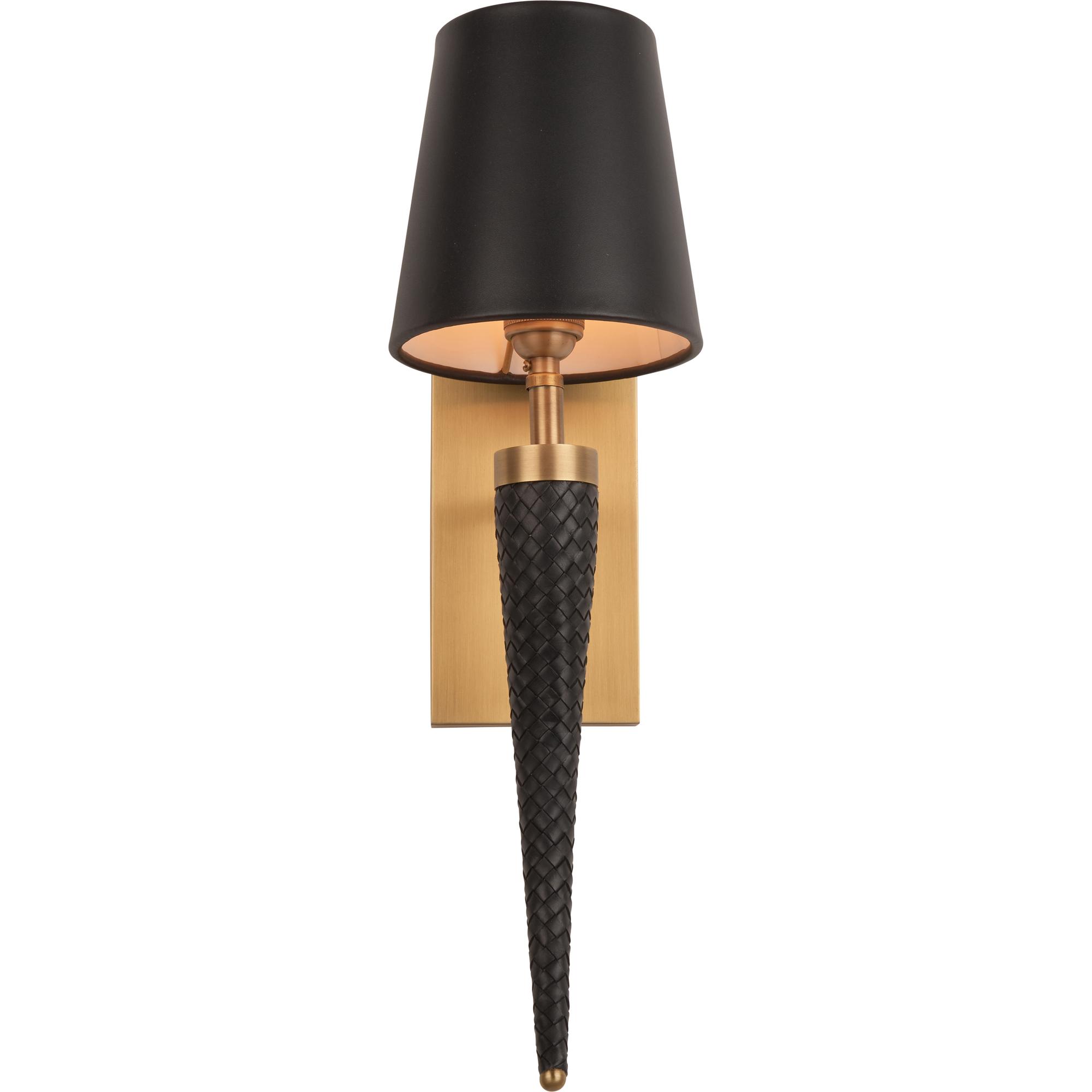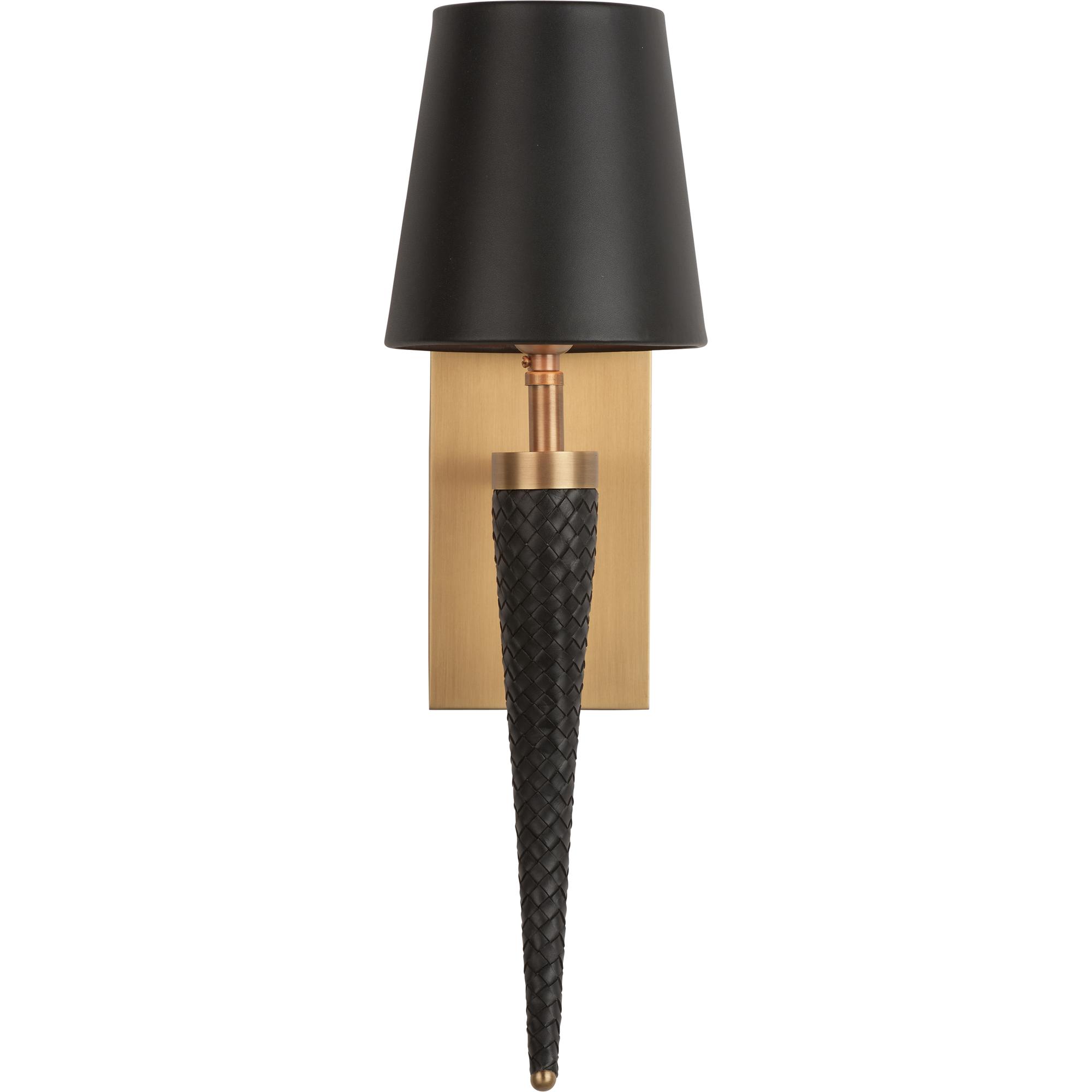 The Wexler Sconce is a bold fusion of braided leather and brass, offering a refined yet distinctive design. With its sculptural horn-like form and sleek black shade, this sconce brings a sophisticated edge to any space, perfect for adding warmth and character to your walls.