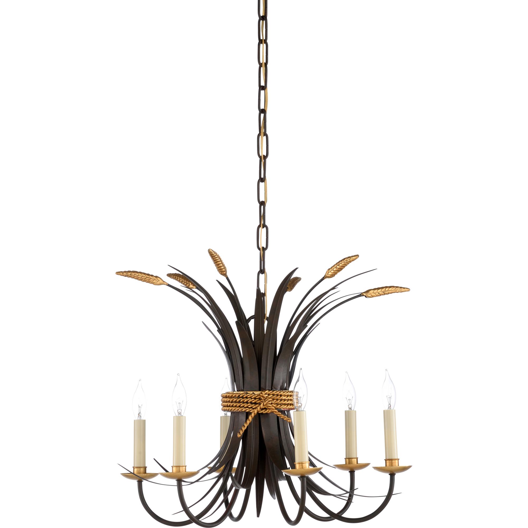Inspired by the vintage “ear of corn” chandelier, our wheat chandelier has a spike of wheat wrapped with a tied cord. The bronze finished iron with antique gold leaf details is a stunning design for a rustic modern space. It has six ivory candles to illuminate your design style.