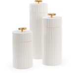 Set of three white ceramic canisters with metallic gold bamboo handles. Medium: 17.25h x 6.75w x 6.75d, Small: 13.25h x 6.75w x 6.75d designed by Claire Bell.