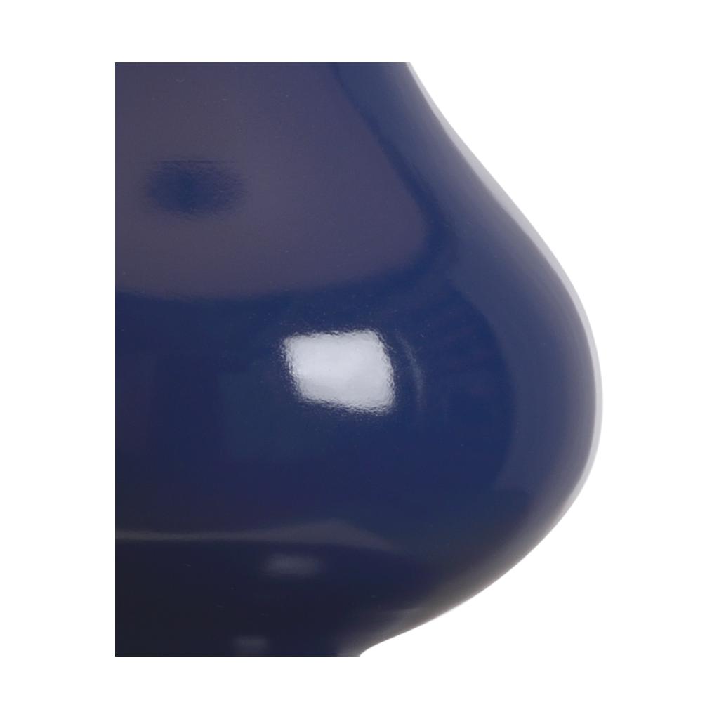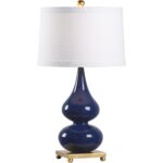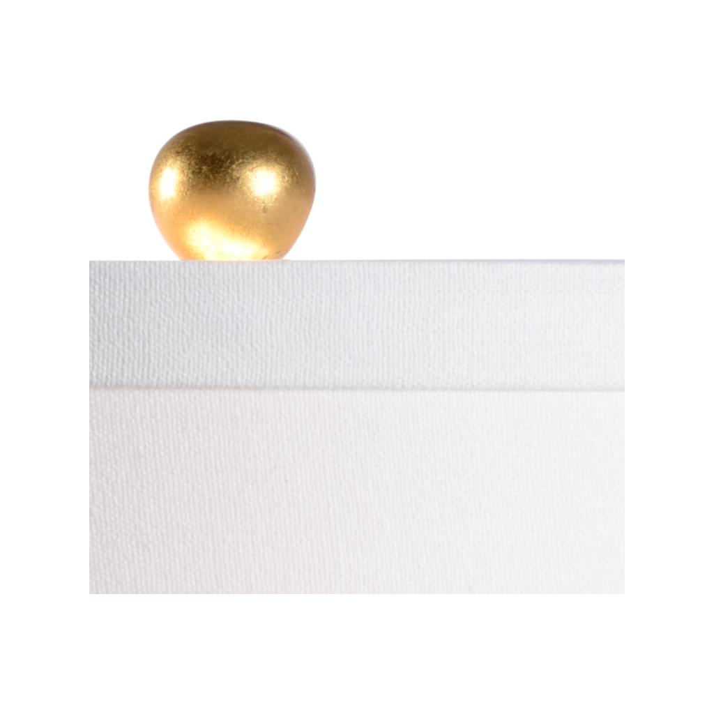 The Whitney Lamp features a graceful double-gourd silhouette finished in a glossy blue glaze, perfectly complemented by a classic drum shade. The antique gold leaf base emits a soft warm glow, and its round feet lift the lamp for a light, airy look. Topped with a matching gold finial, this piece effortlessly blends timeless elegance with a touch of modern charm.