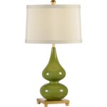 The Whitney Lamp features a graceful double-gourd silhouette finished in a glossy green glaze, perfectly complemented by a classic drum shade. The antique gold leaf base emits a soft warm glow, and its round feet lift the lamp for a light, airy look. Topped with a matching gold finial, this piece effortlessly blends timeless elegance with a touch of modern charm.