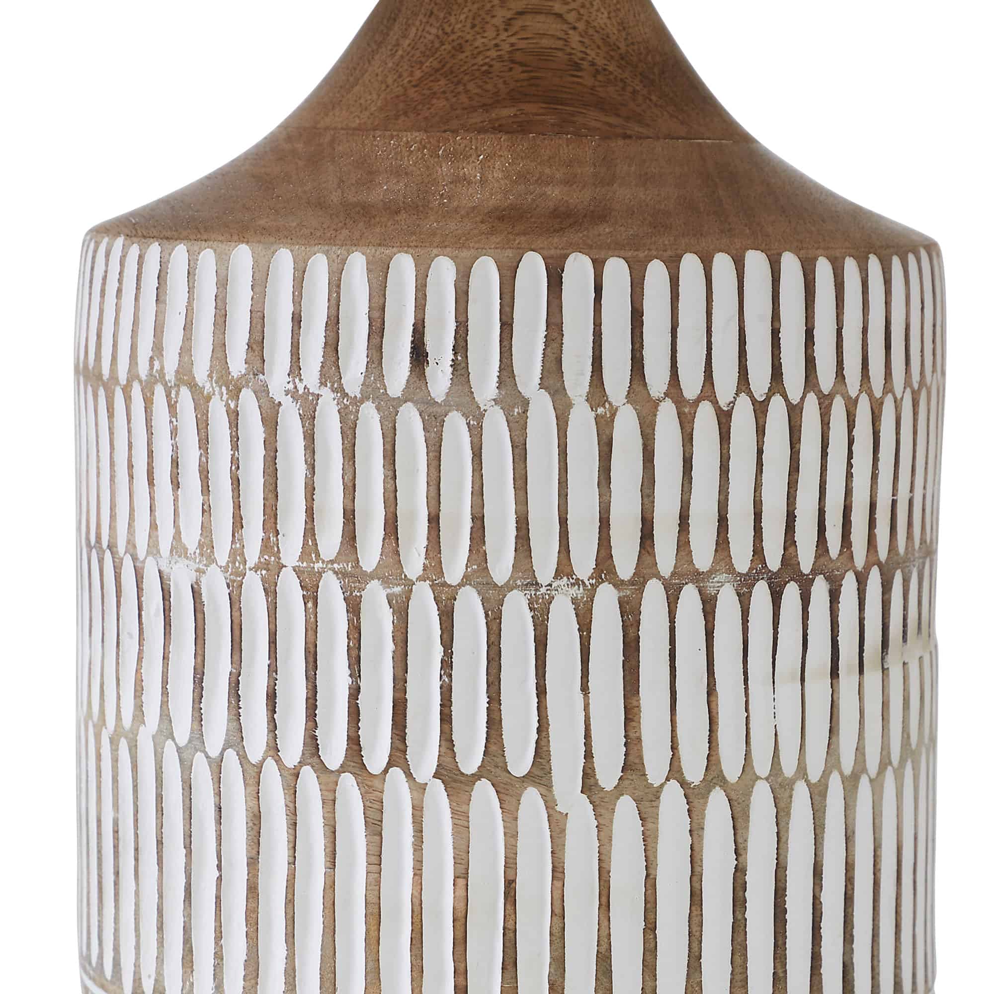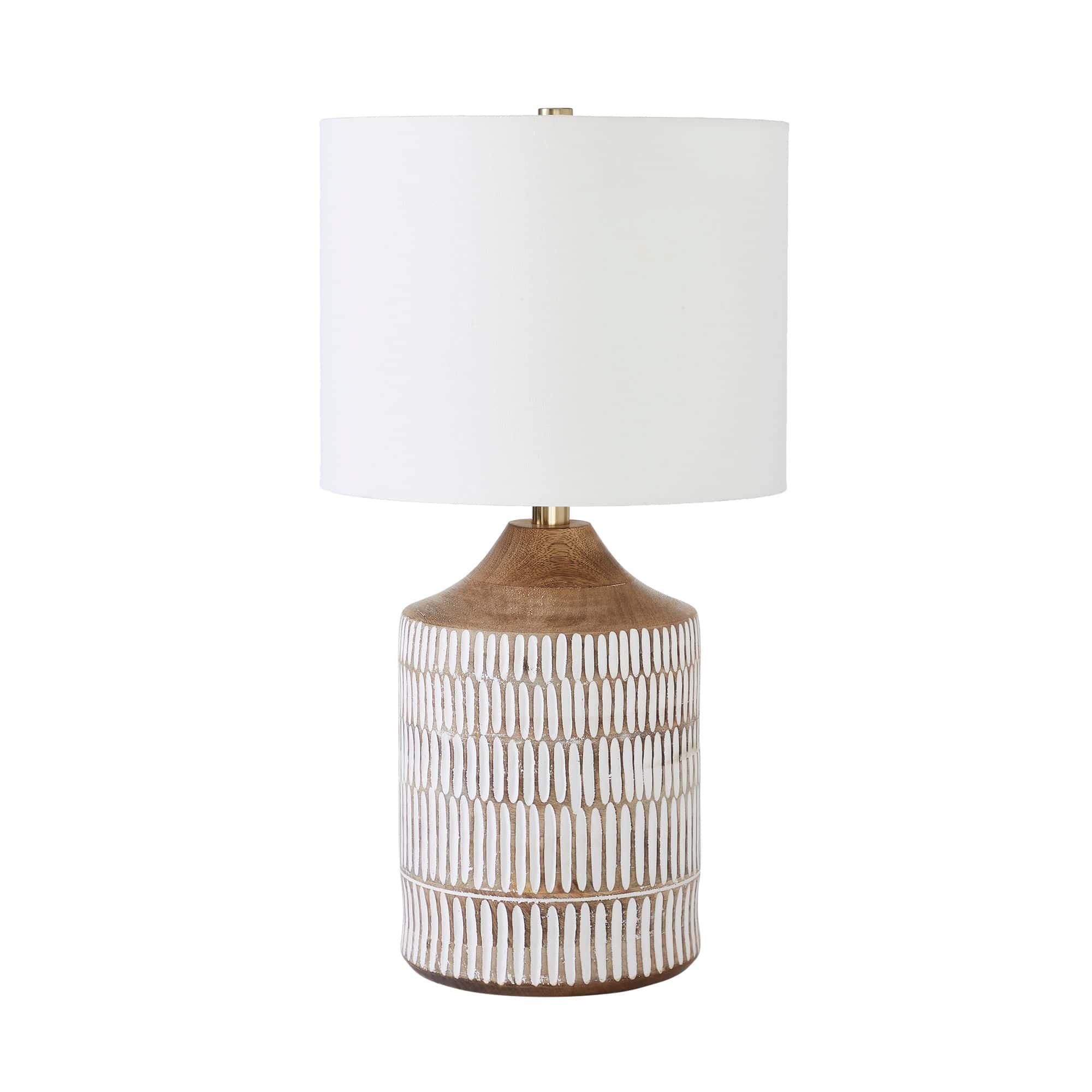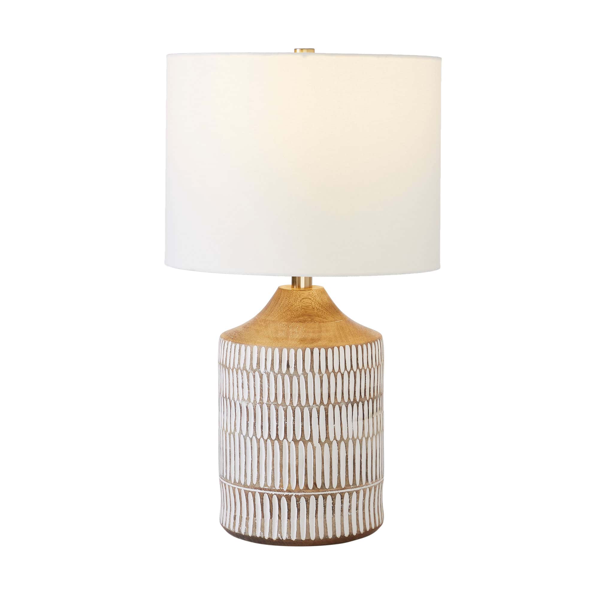 A tribal influence enters the bedroom interior through this table table lamp design. Set on a single bedside table or pair of bedside tables, this piece completes the comforting atmosphere one hopes to create in the space. Featuring a juxtaposition of cotton and mango wood, this table lamp has an inherent effortless quality that radiates from every angle.