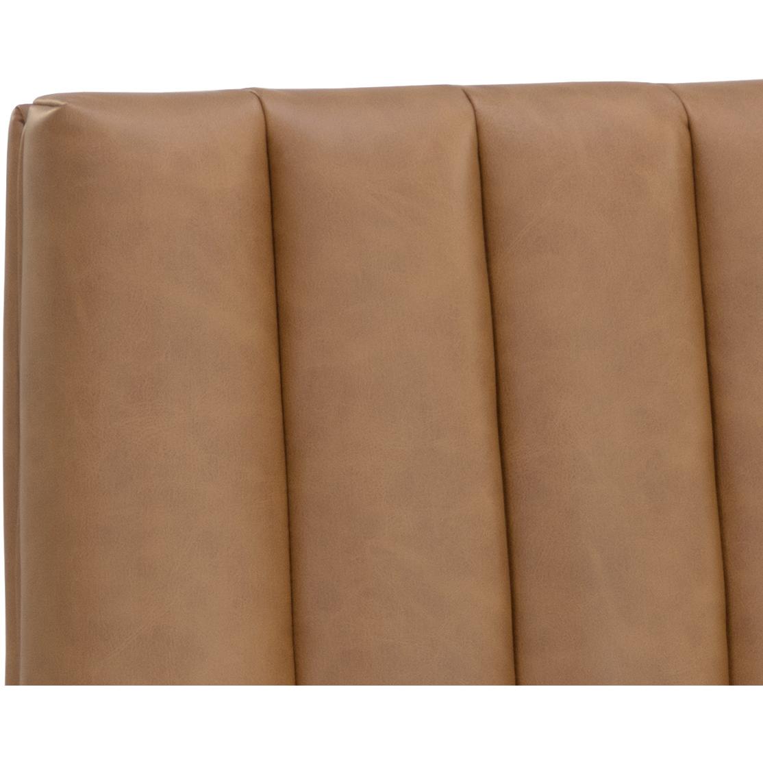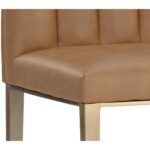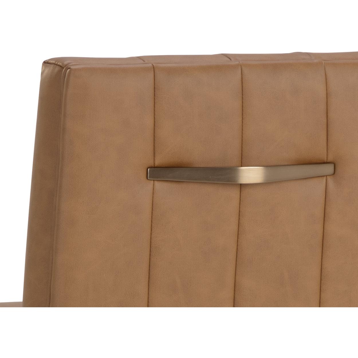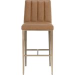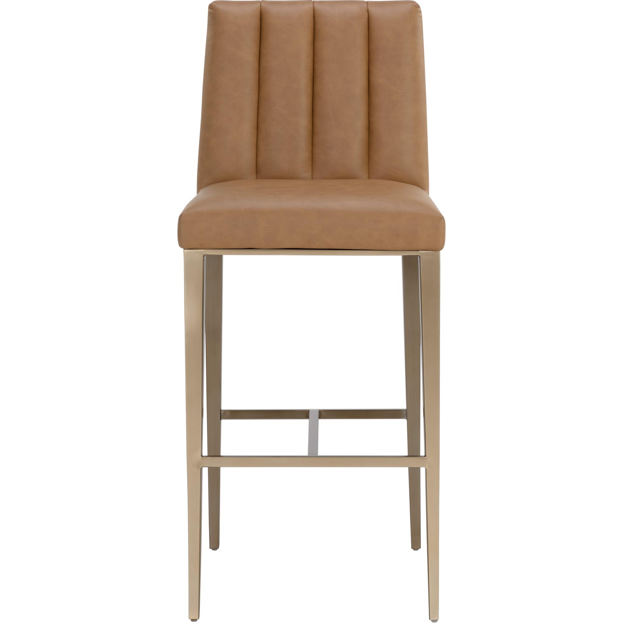 Minimal and classic best describes the Wilbur Barstool. Upholstered in milliken cognac faux leather with vertical channeling on the back seat for added flair. Finished with powder-coated stainless steel legs and a matching handle. Handle With Care: This design has been crafted with faux leather. Faux leather is manufactured to reflect the natural characteristics of leather; as such, colour variations, markings, wrinkles, grooves, and light scratches are appreciated characteristics. No two pieces will be alike. Visit our Product Care page for more information on how to ensure the lasting beauty of this piece.
