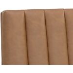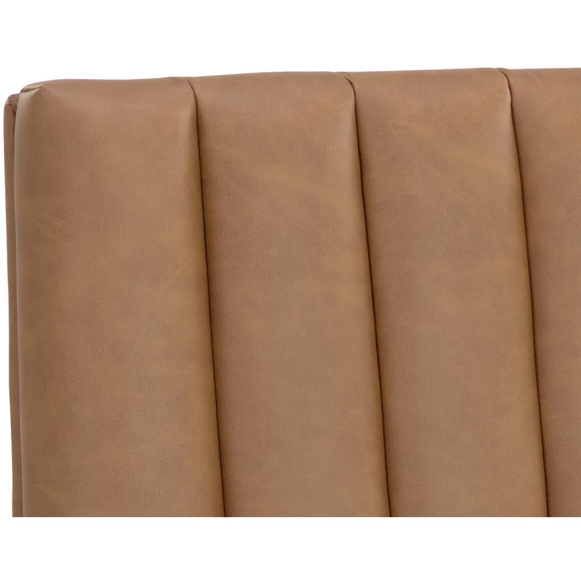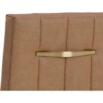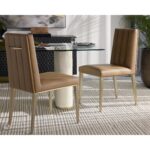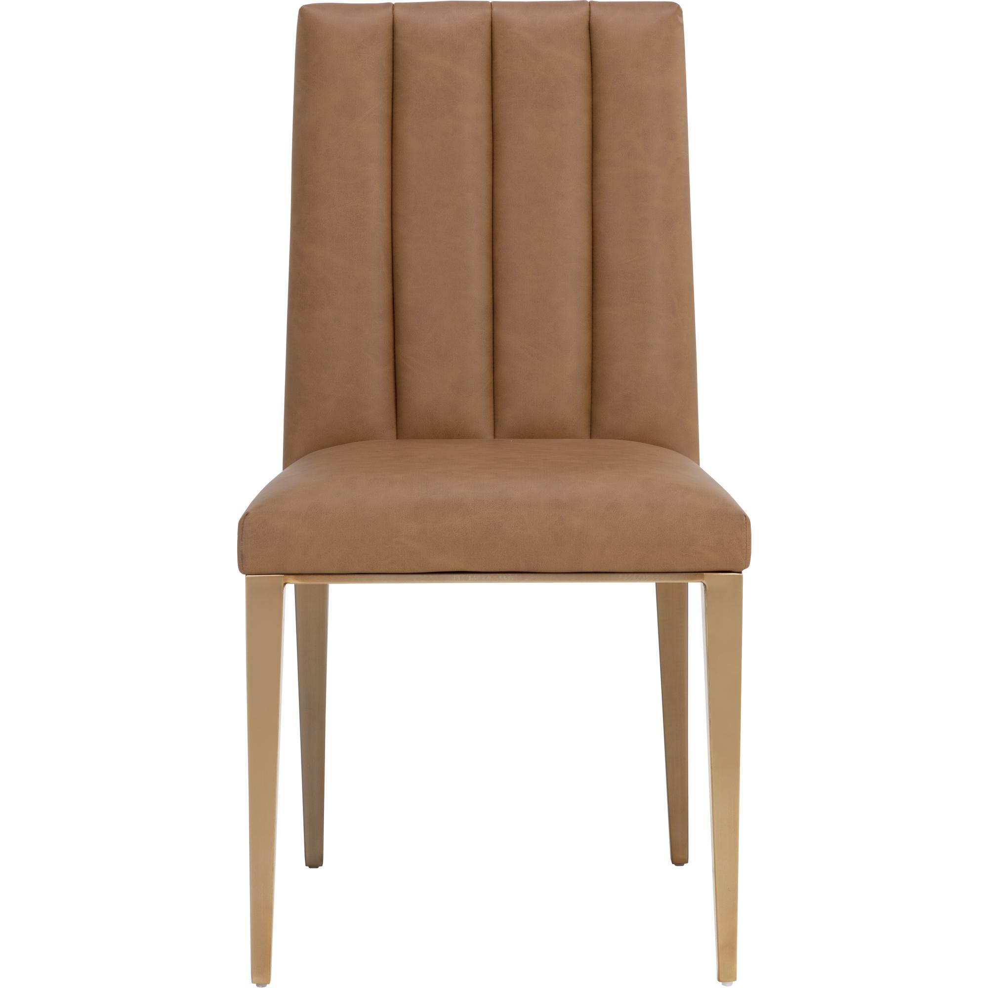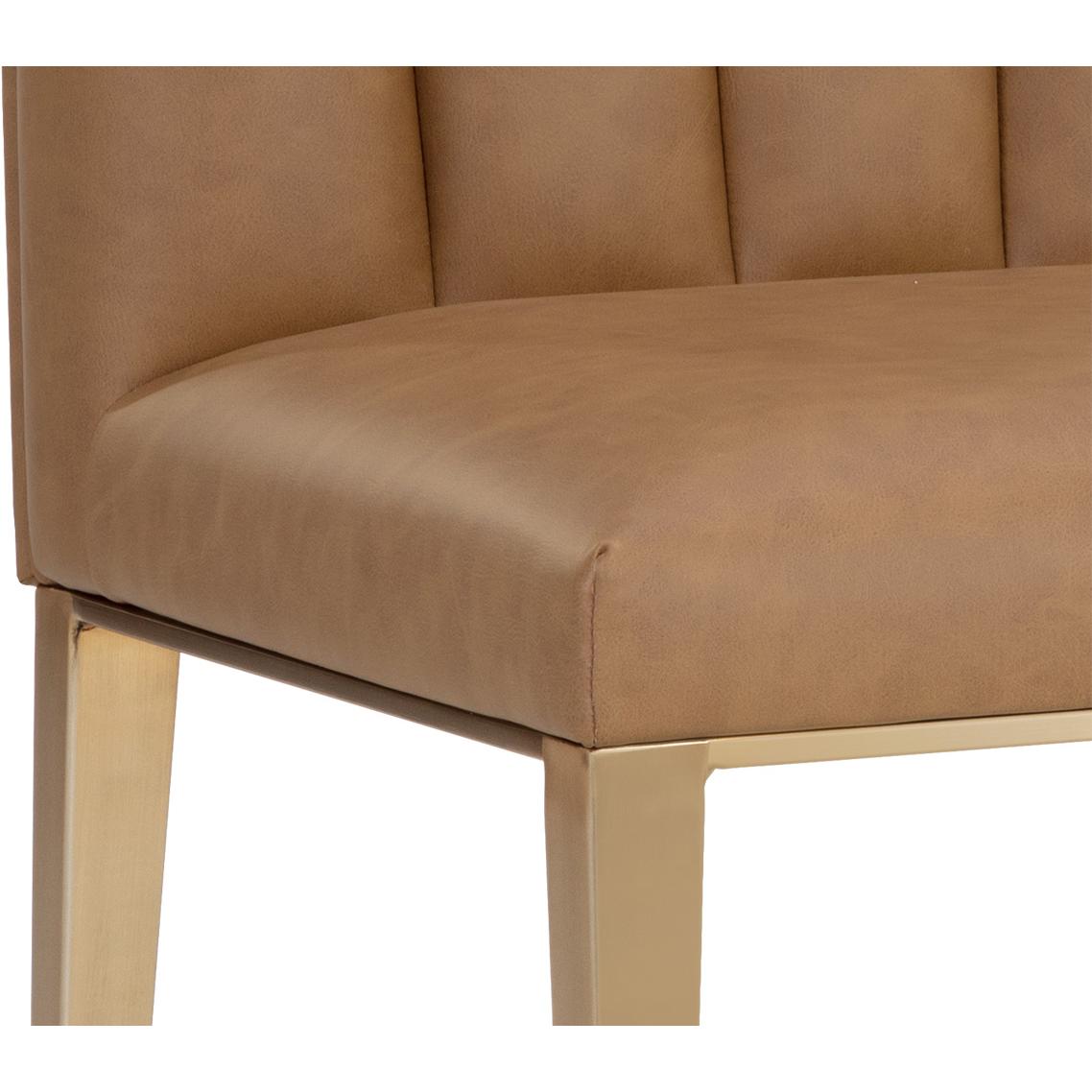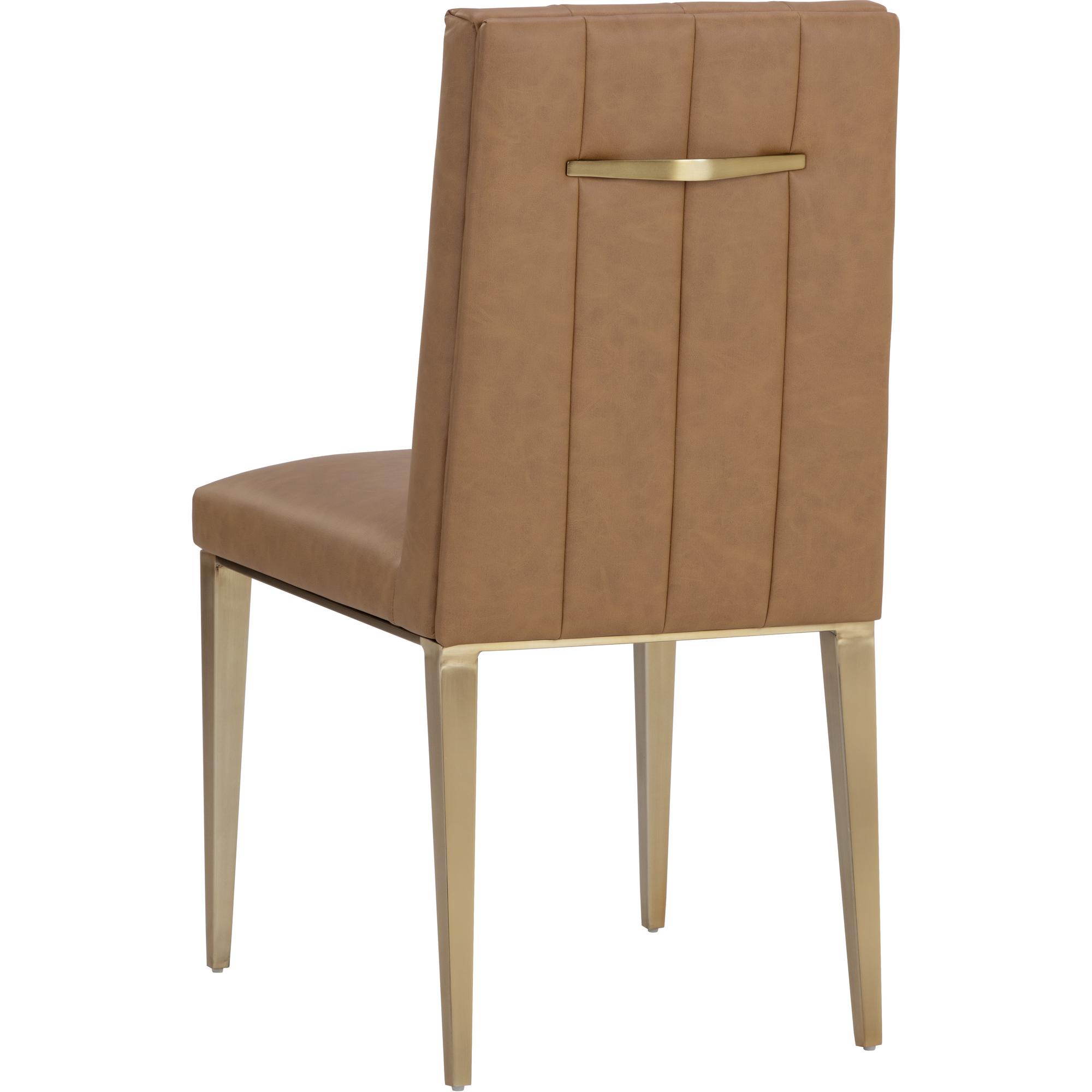 Minimal and classic best describes the Wilbur Dining Chair. Upholstered in milliken cognac faux leather with vertical channeling on the back seat for added flair. Finished with powder-coated stainless steel legs and a matching decorative handle.