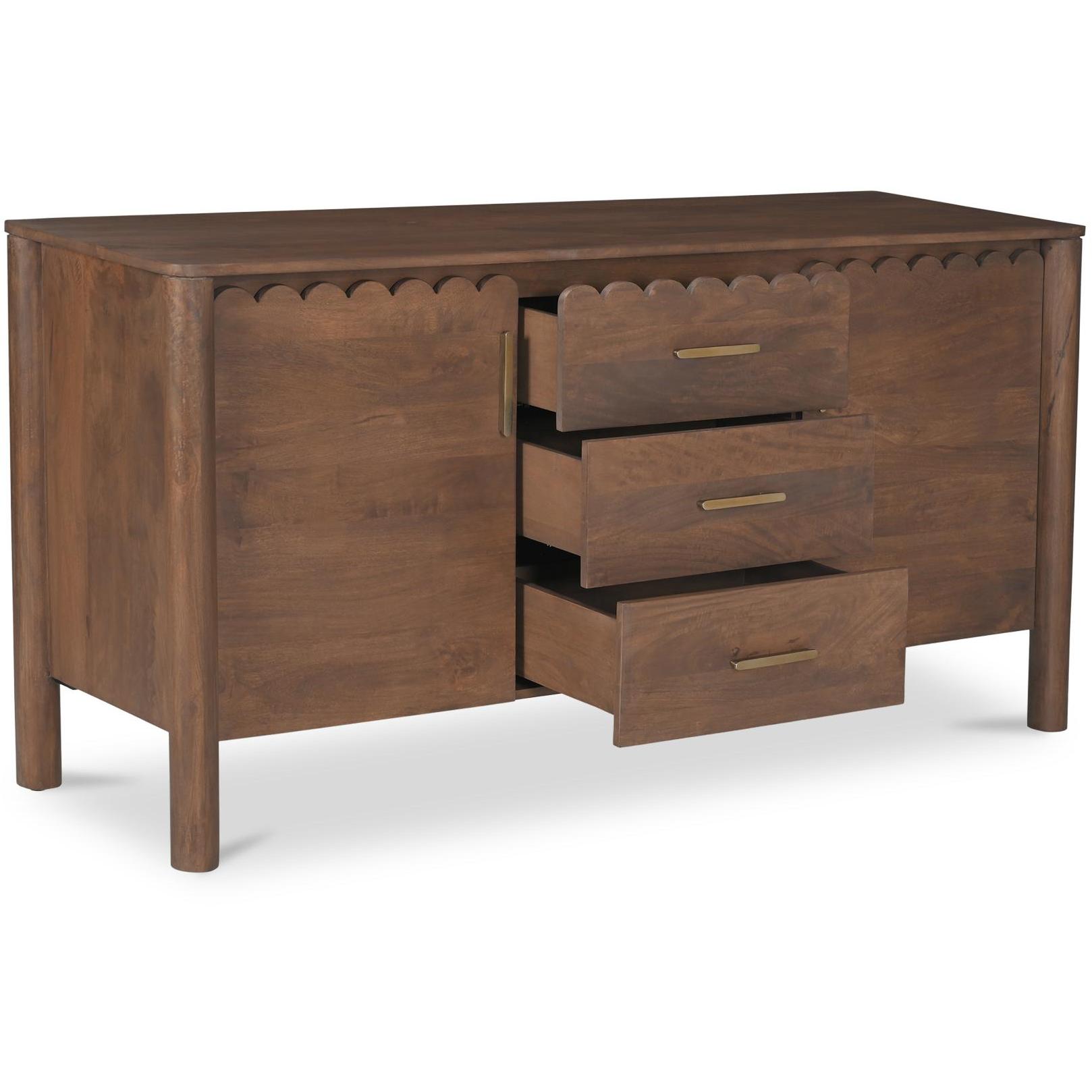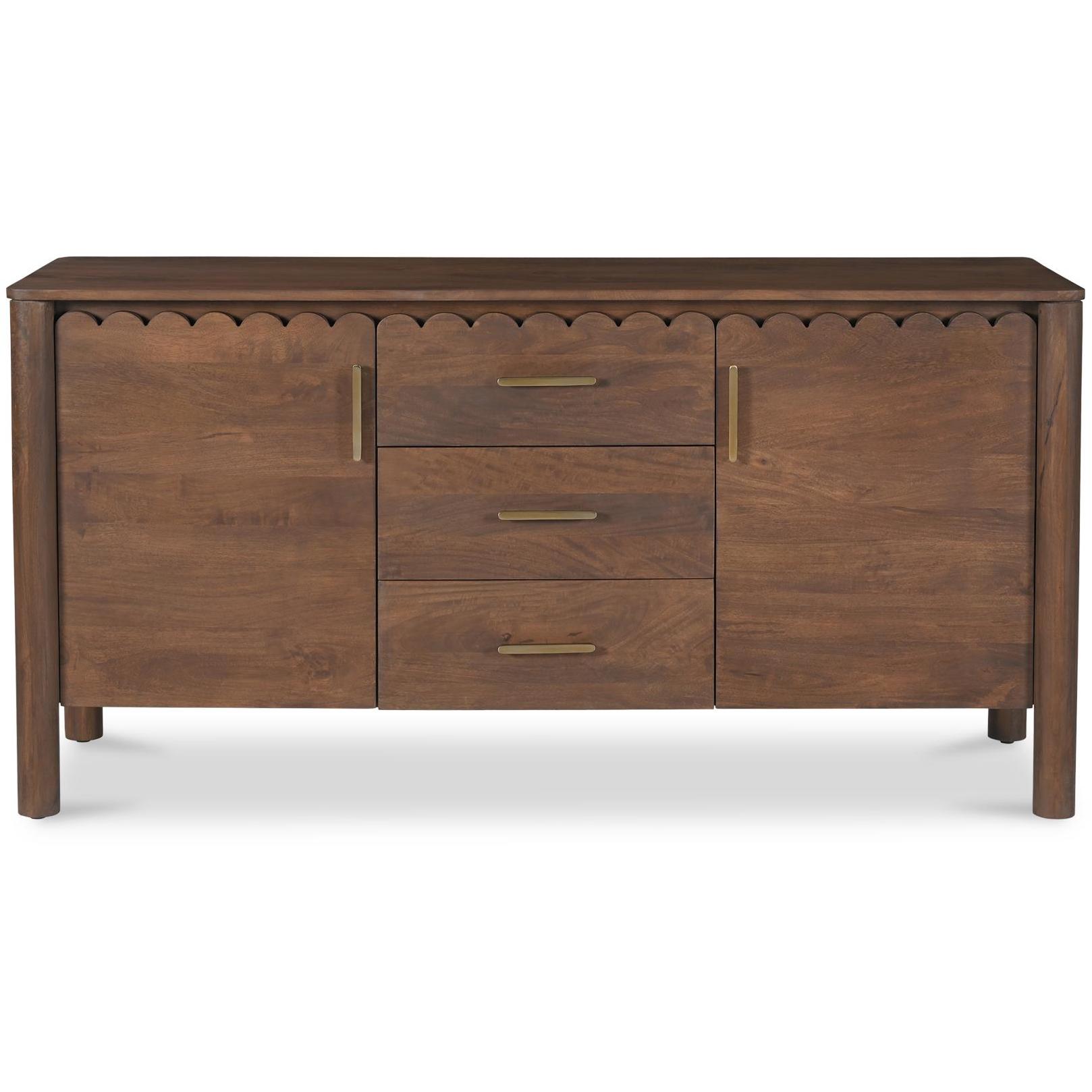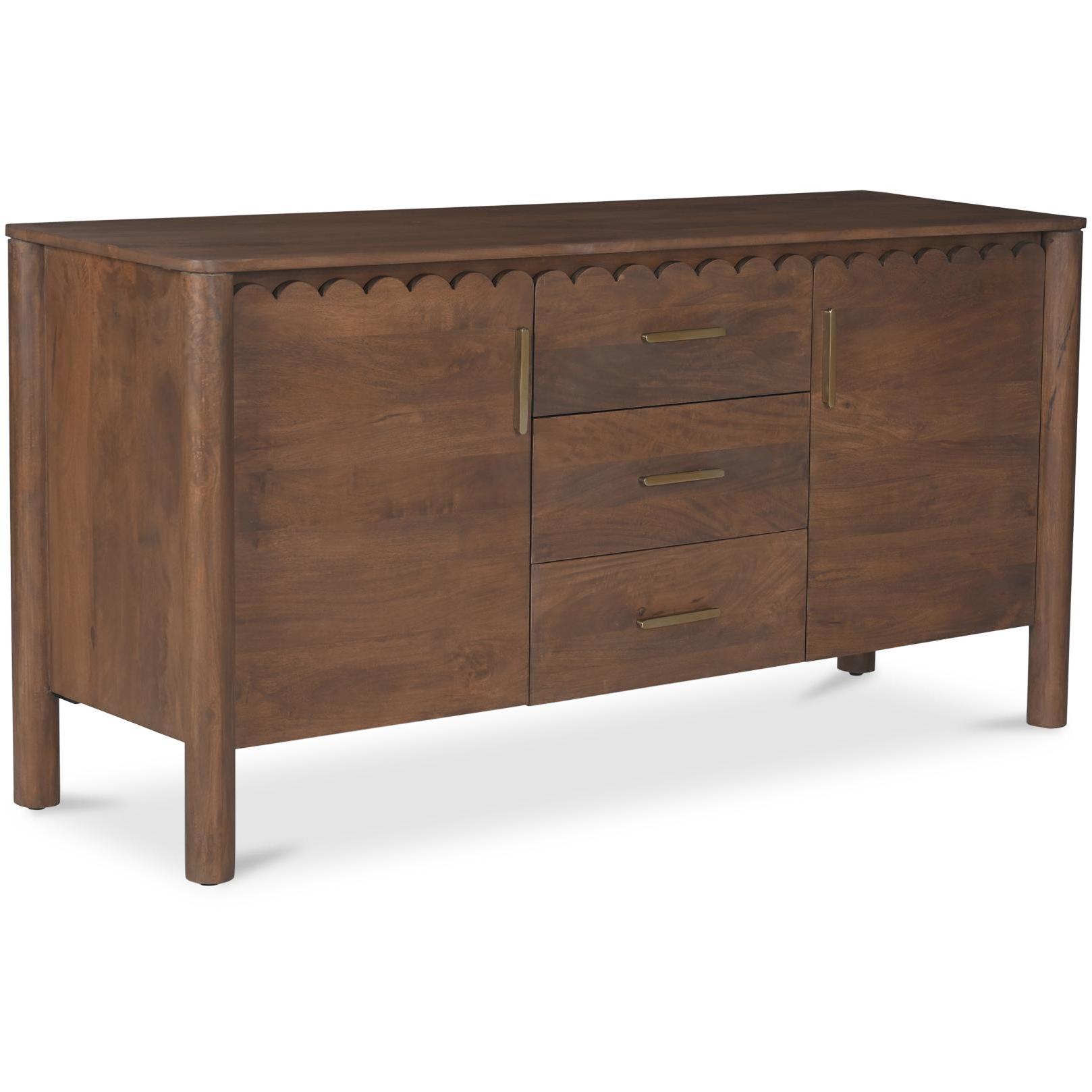 Storage, but make it design-forward. Wiley blends modern Scandinavian calm with Shaker simplicity, so it feels easy in a dining room, entry, or living space. Geometric curves, scalloped edge details, and monolithic round legs keep the silhouette clean, while the vintage brown finish brings warmth. Three roomy drawers and weighty brass handles add everyday usefulness with a little polish. The kind of piece that quietly does a lot.