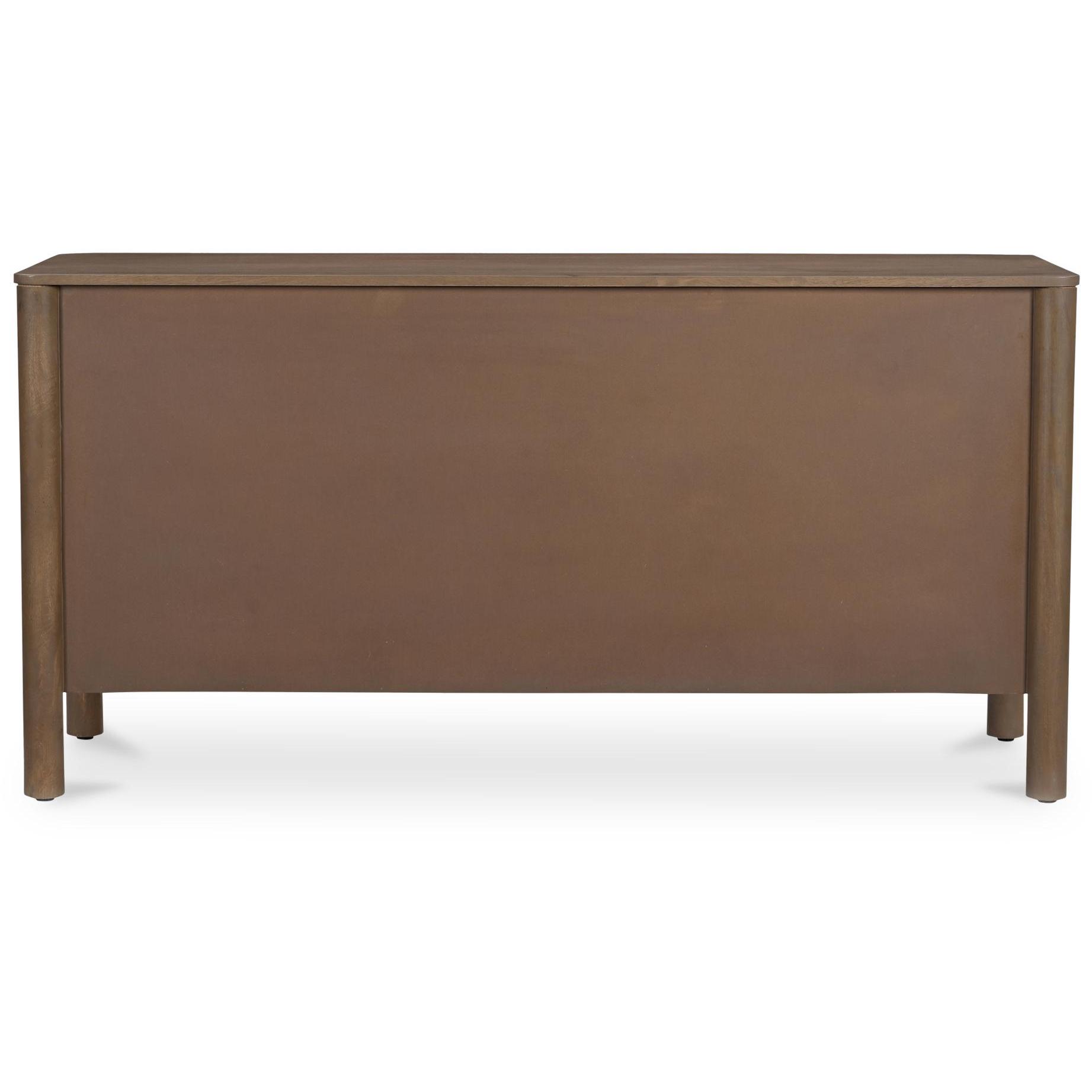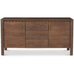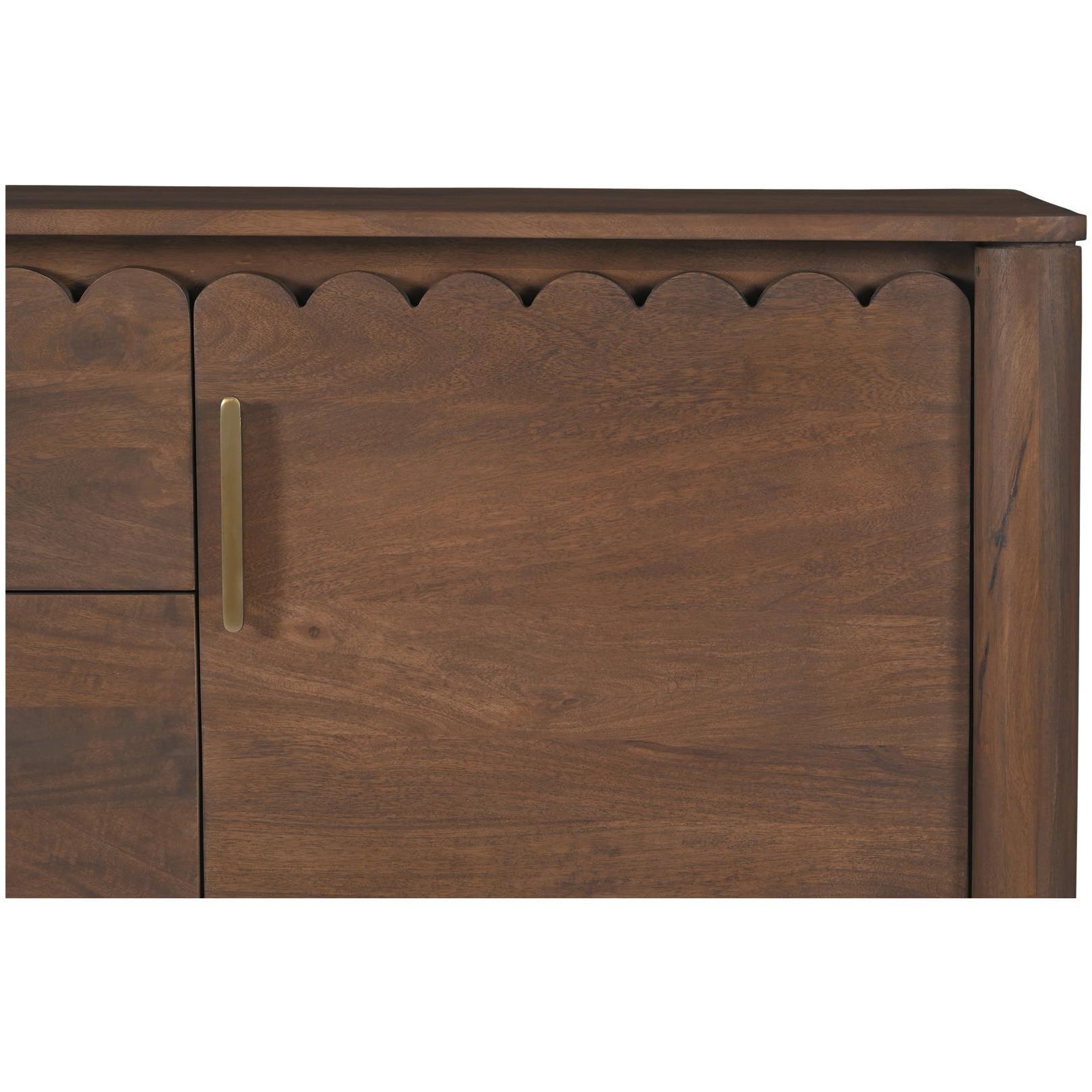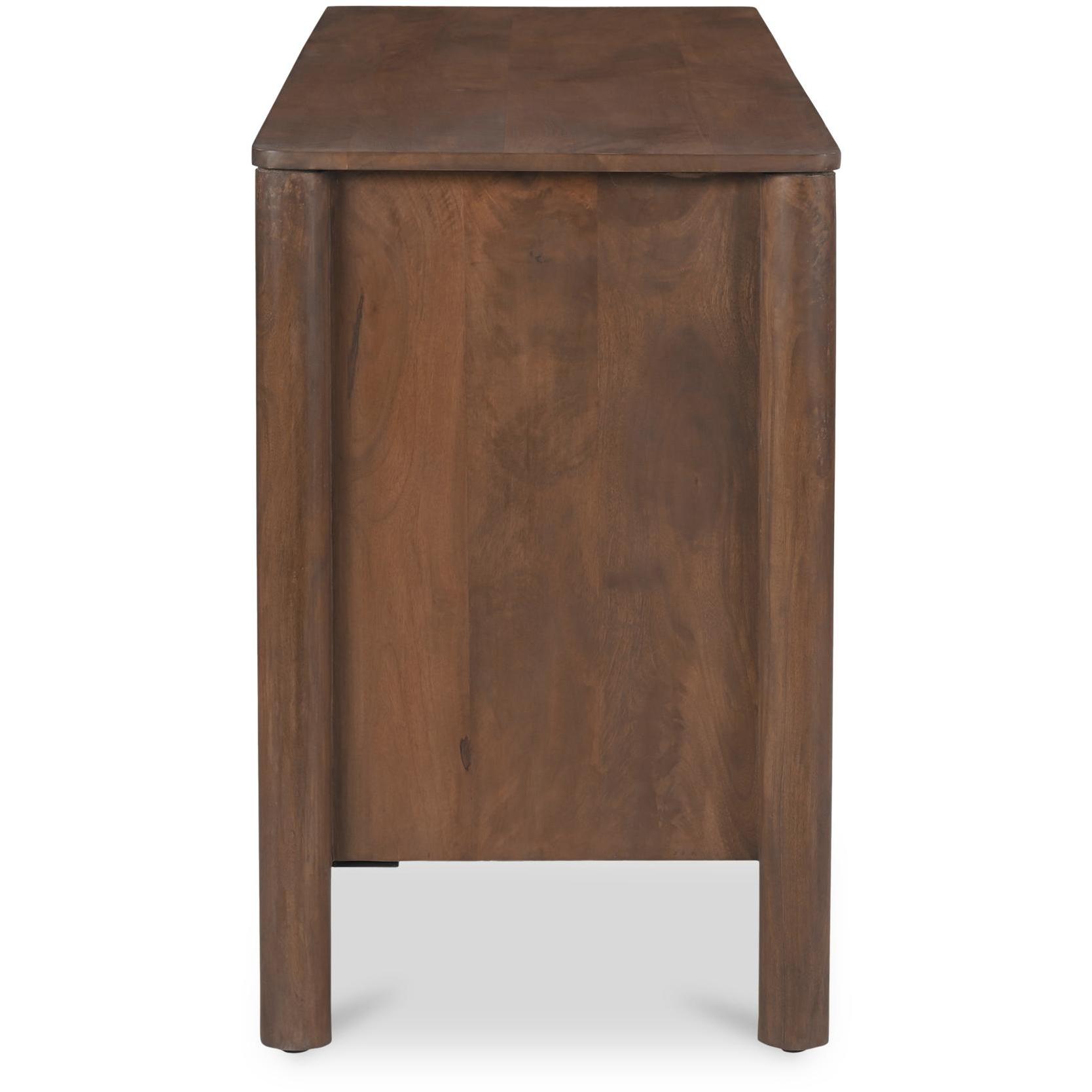Storage, but make it design-forward. Wiley blends modern Scandinavian calm with Shaker simplicity, so it feels easy in a dining room, entry, or living space. Geometric curves, scalloped edge details, and monolithic round legs keep the silhouette clean, while the vintage brown finish brings warmth. Three roomy drawers and weighty brass handles add everyday usefulness with a little polish. The kind of piece that quietly does a lot.