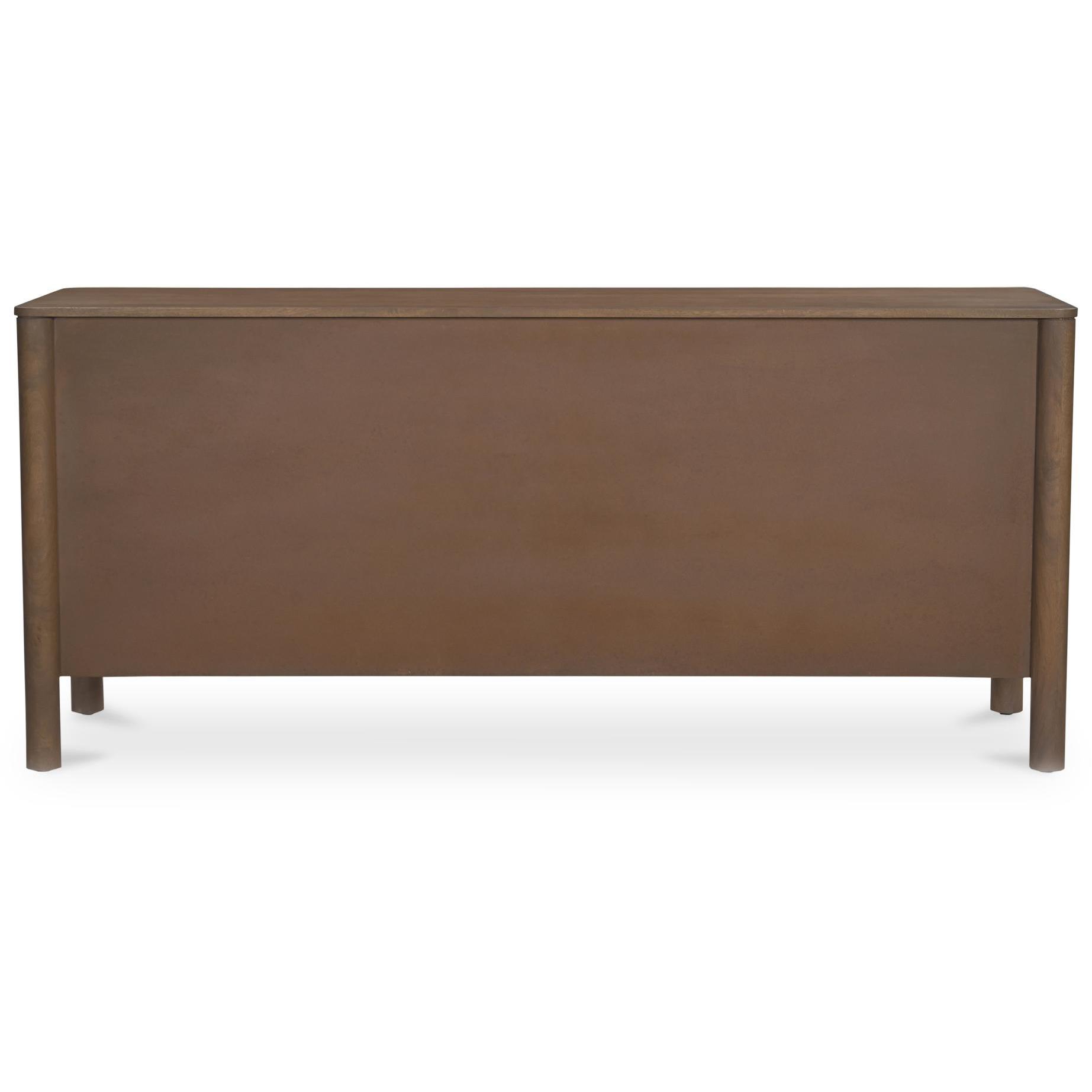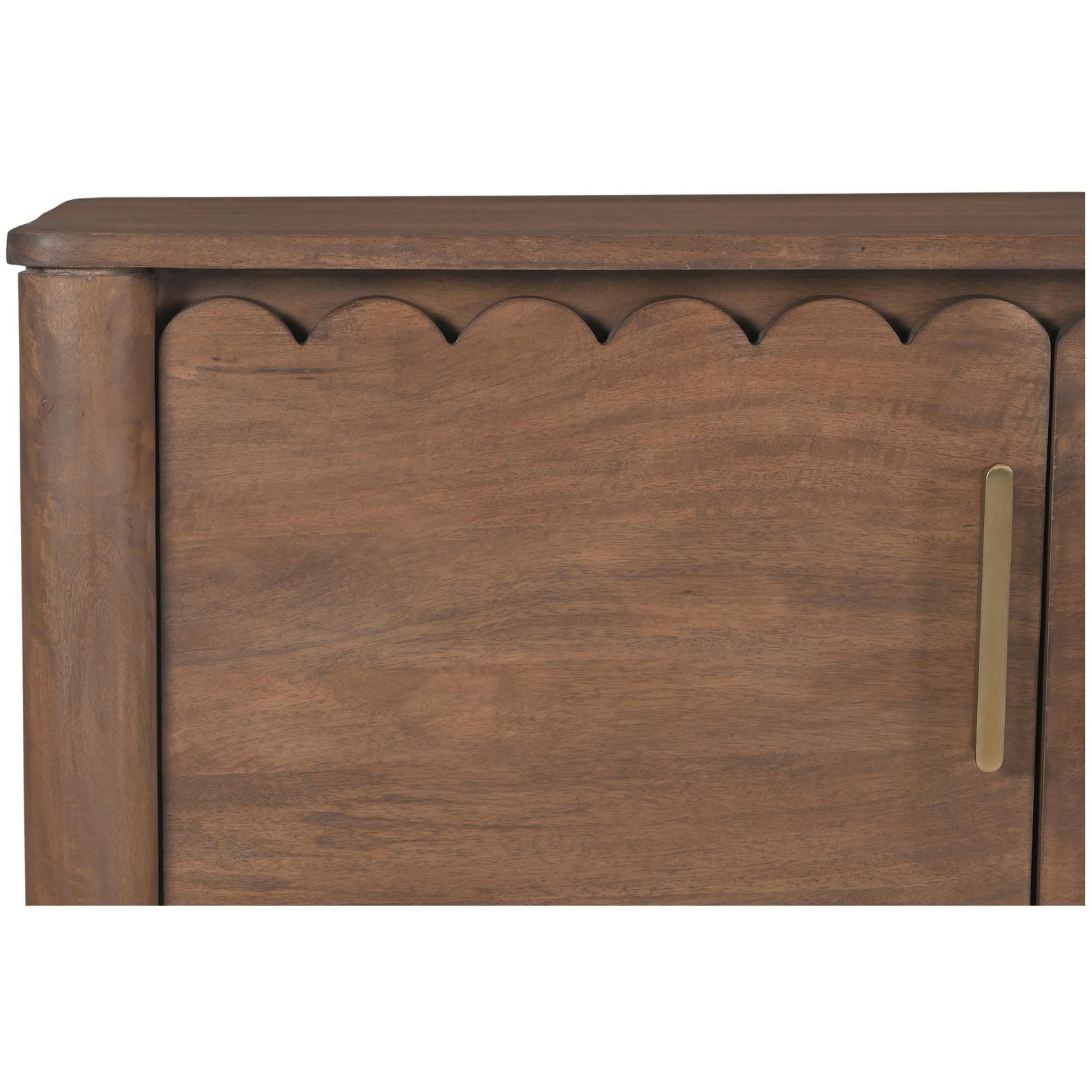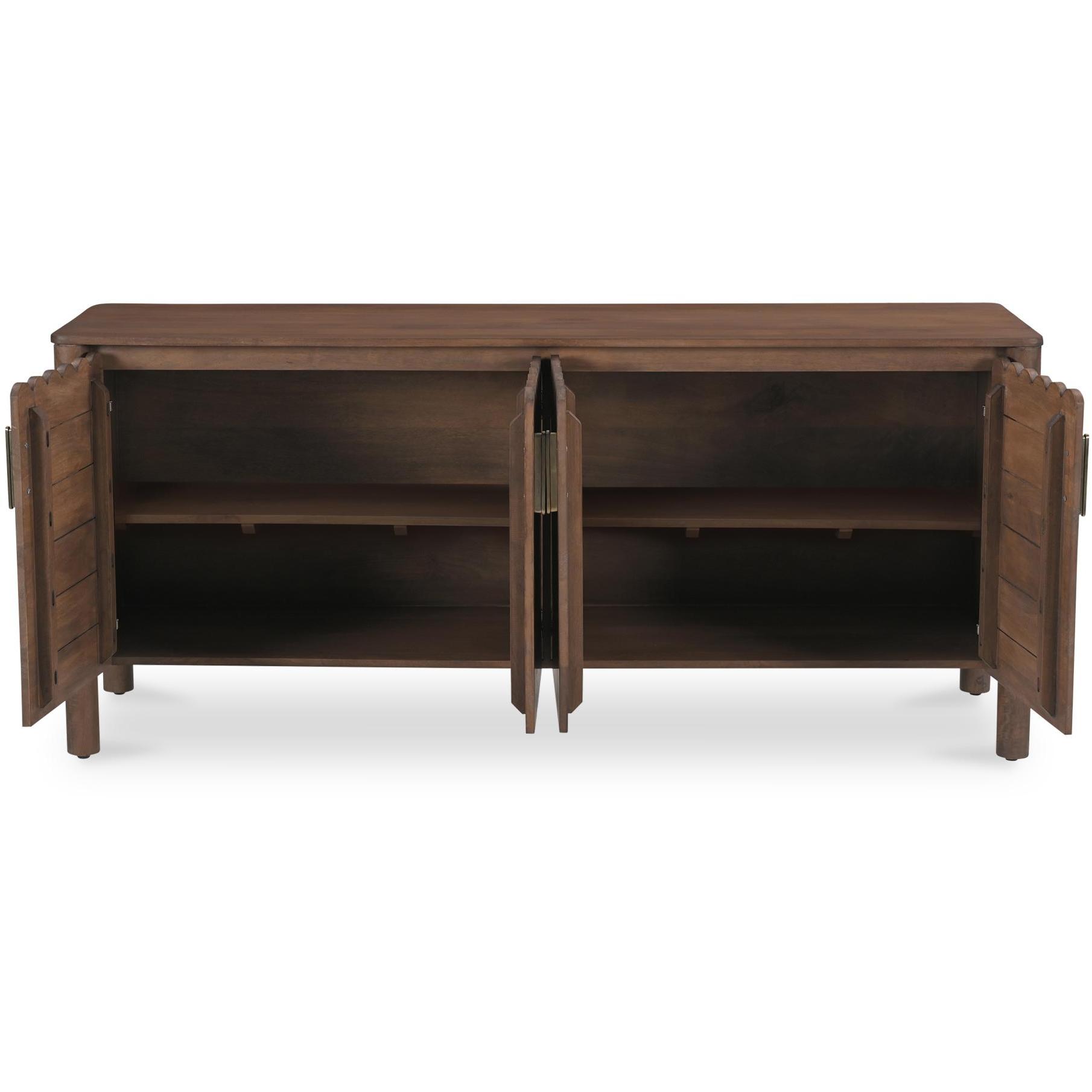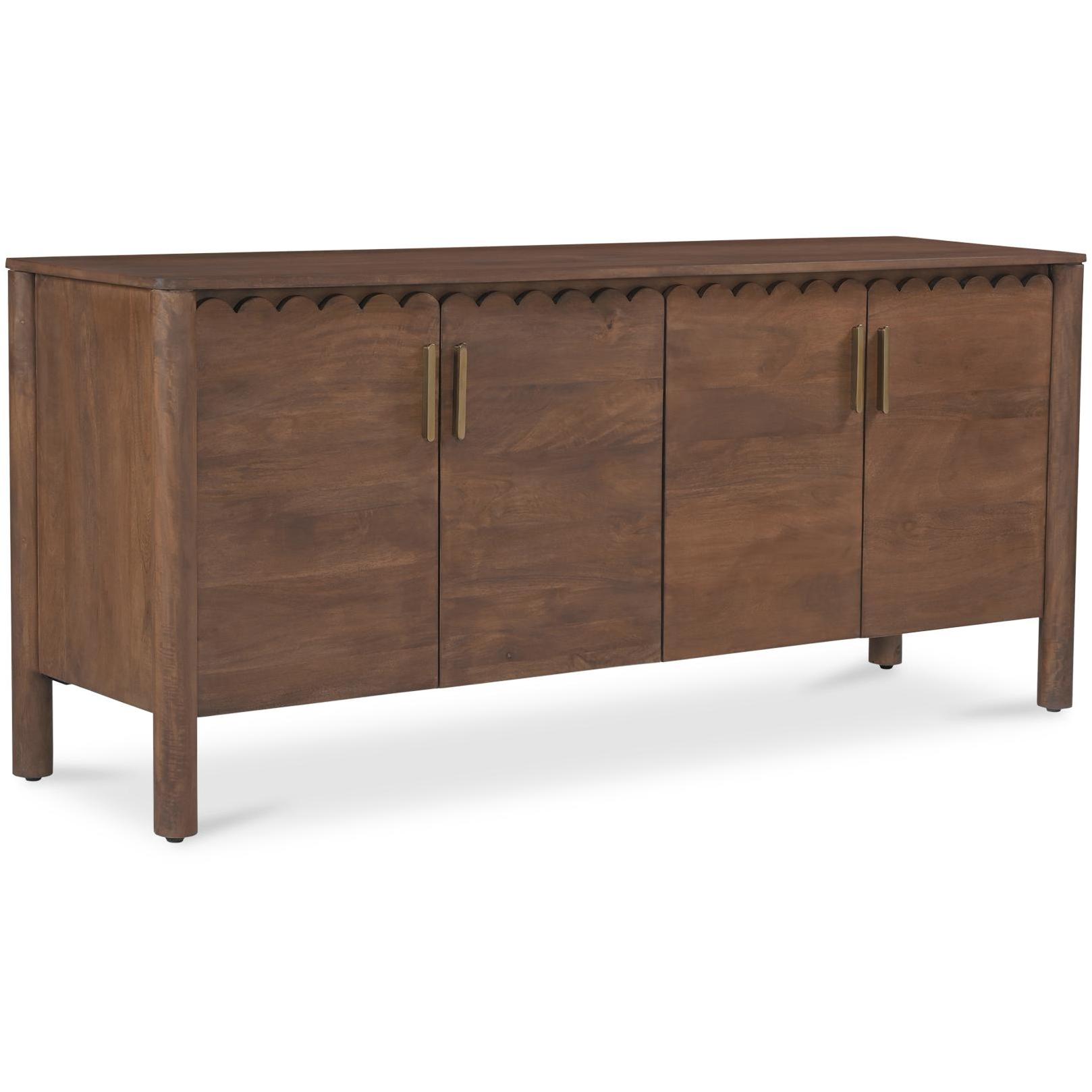 When you want storage that still looks intentional. Wiley pulls from modern Scandinavian and Shaker roots to keep things clean, warm, and adaptable. Geometric curves, scalloped edge details, and monolithic round legs give it a confident stance, finished in vintage brown for a deeper, grounded feel. Behind four doors, you’ve got space to tuck away the not-pretty stuff—made better with weighty brass handles you’ll use every day.