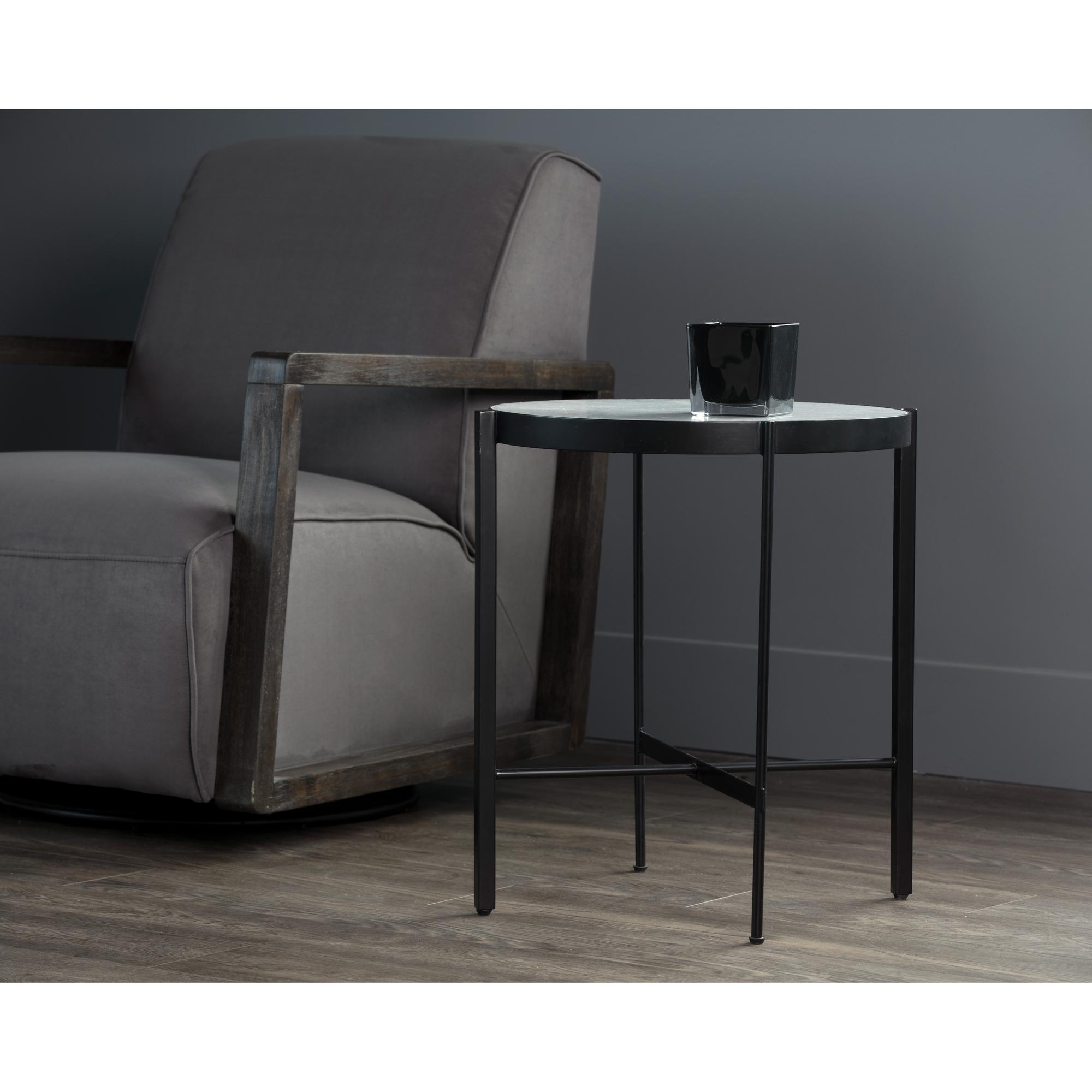 A sleek round end table that is cool and alluring. Designed with a simple and linear matte black metal frame and white cararra marble top. Can be paired with the coordinating coffee tables to create a unique table grouping. As marble is a natural material, unique veining, pitting, fissures, micro-cracks and colour variations are all characteristics that add to the uniqueness and beauty of each piece.
