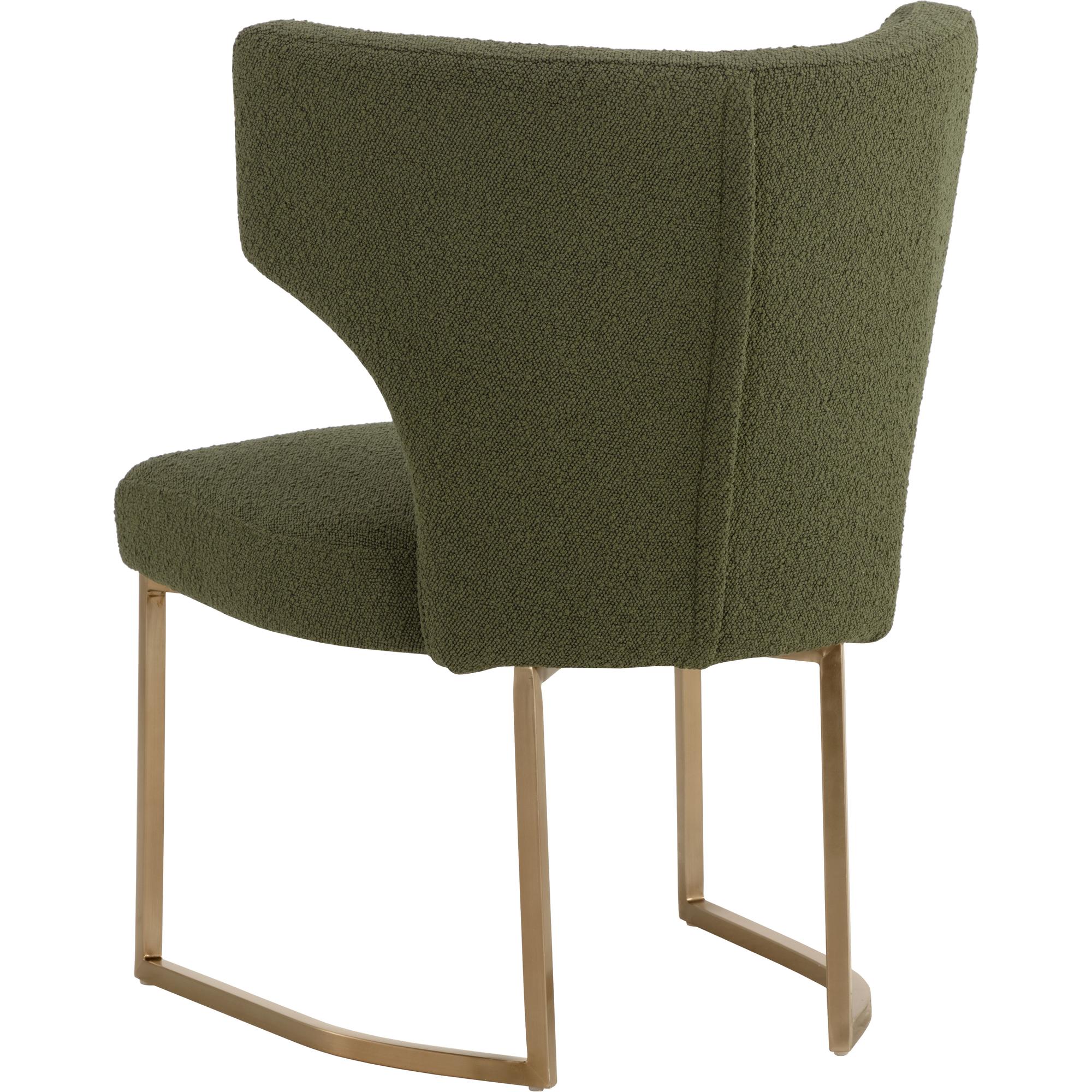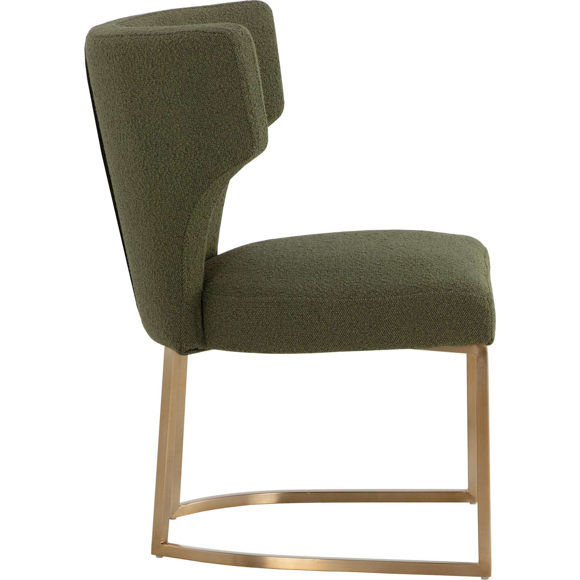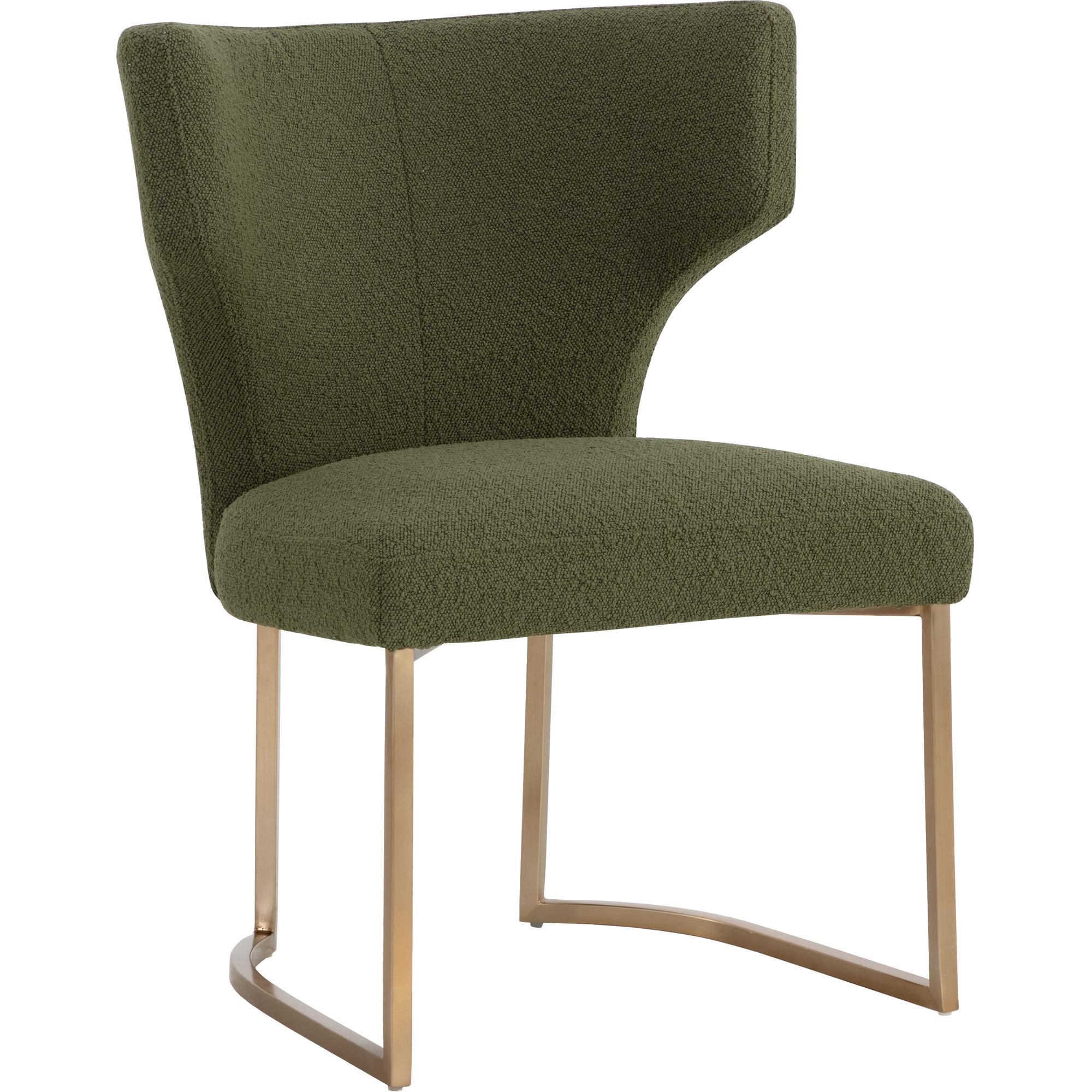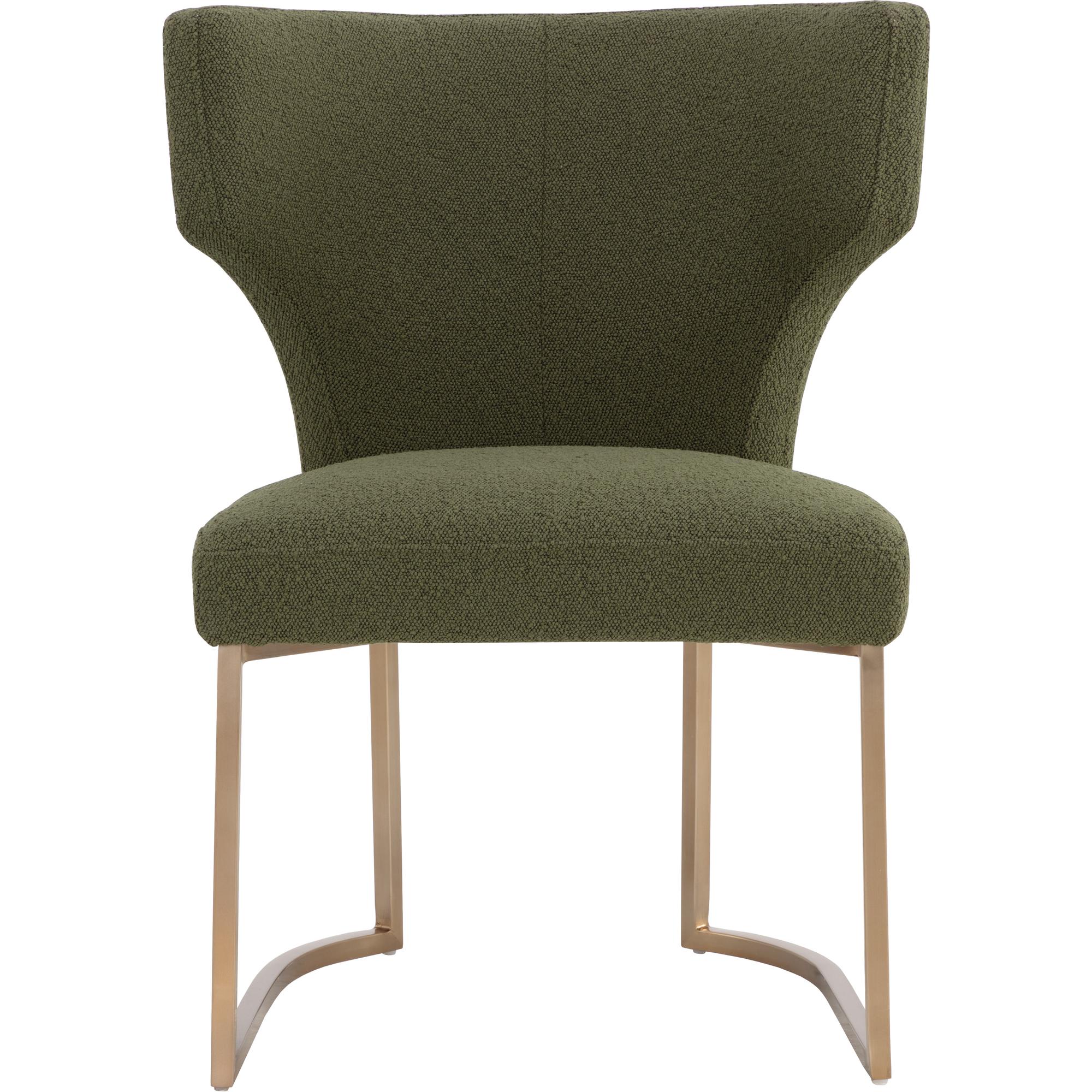 The elegant curves of the Willowdale Dining Chair will bring an air of sophistication to any dining space. Soft copenhagen olive fabric pairs beautifully with gold powder-coated stainless steel for a refined look.