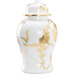 The Winged Creatures Ginger Jar’s classic silhouette is adorned with a beautifully rendered birds design, depicting branches and leaves that intertwine and flourish in harmony. Crafted from high-quality white ceramic and adorned with a gold intricate detail bringing an artistic flair. Perfect for displaying on a mantel, shelf, or side table, this ginger jar makes a stunning statement piece in any room. Designed by Lisa Kahn.