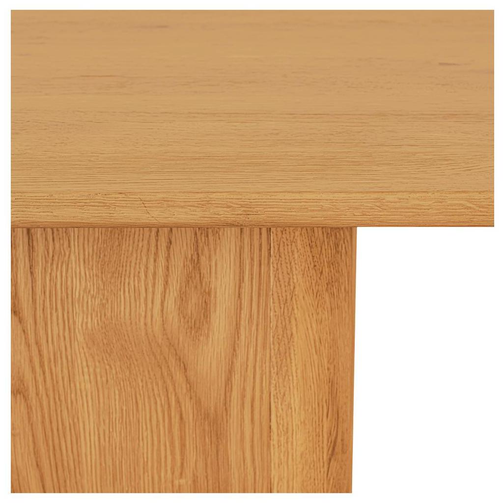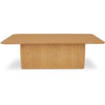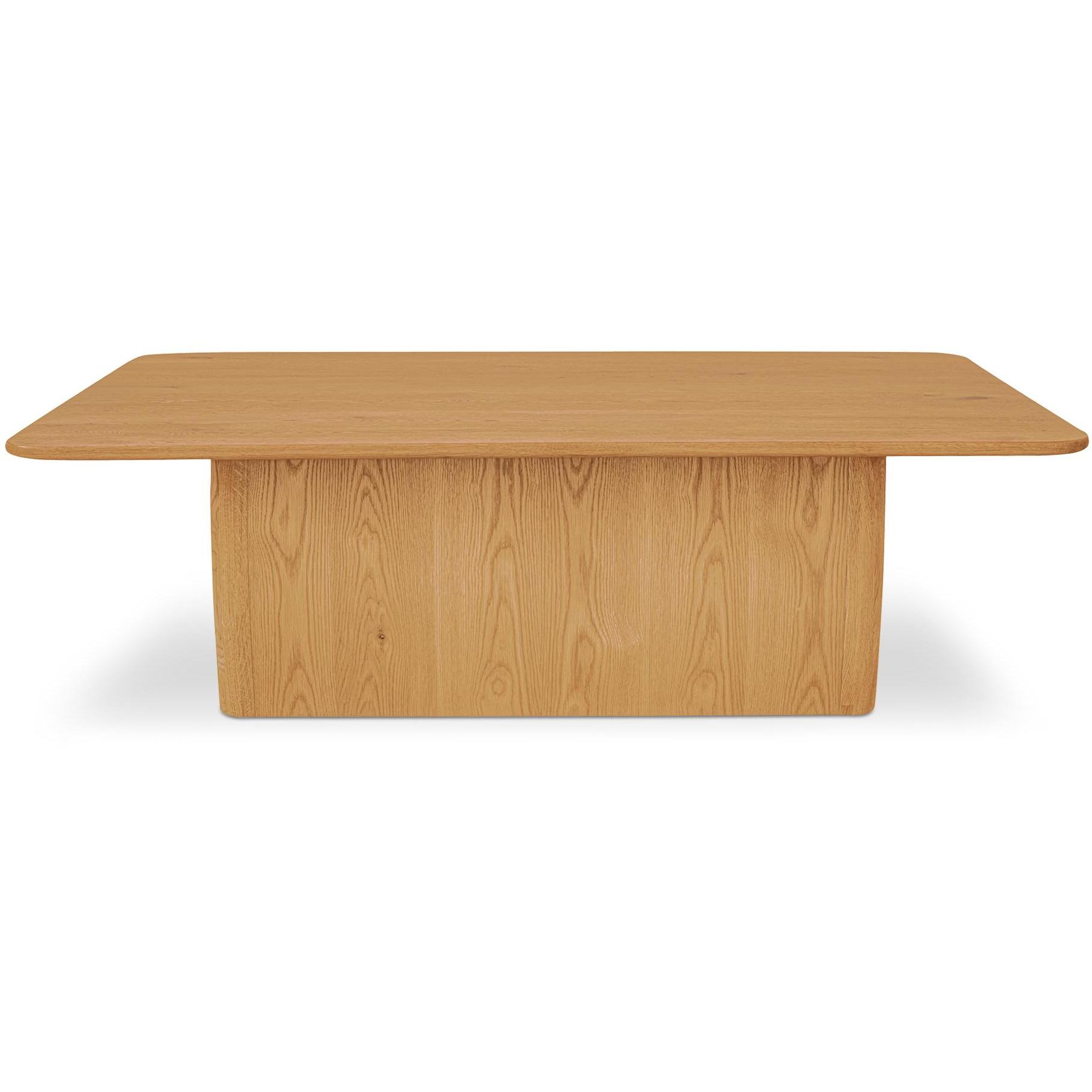 The Winston coffee table’s commanding plinth base features softly rounded edges at all four corners, offering a hefty, substantial design poised to be the centerpiece of any space. Finished in a rustic oak veneer with expressive knots highlighting the wood’s natural charm, it crafts a striking contrast between old and new.