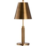 Sleek and sculptural, the Woodbury Lamp makes a refined statement with its all-over antique brass finish. The tapered metal shade and textured column base add a touch of industrial elegance, while the warm metallic tones lend timeless sophistication. Adjustable height.