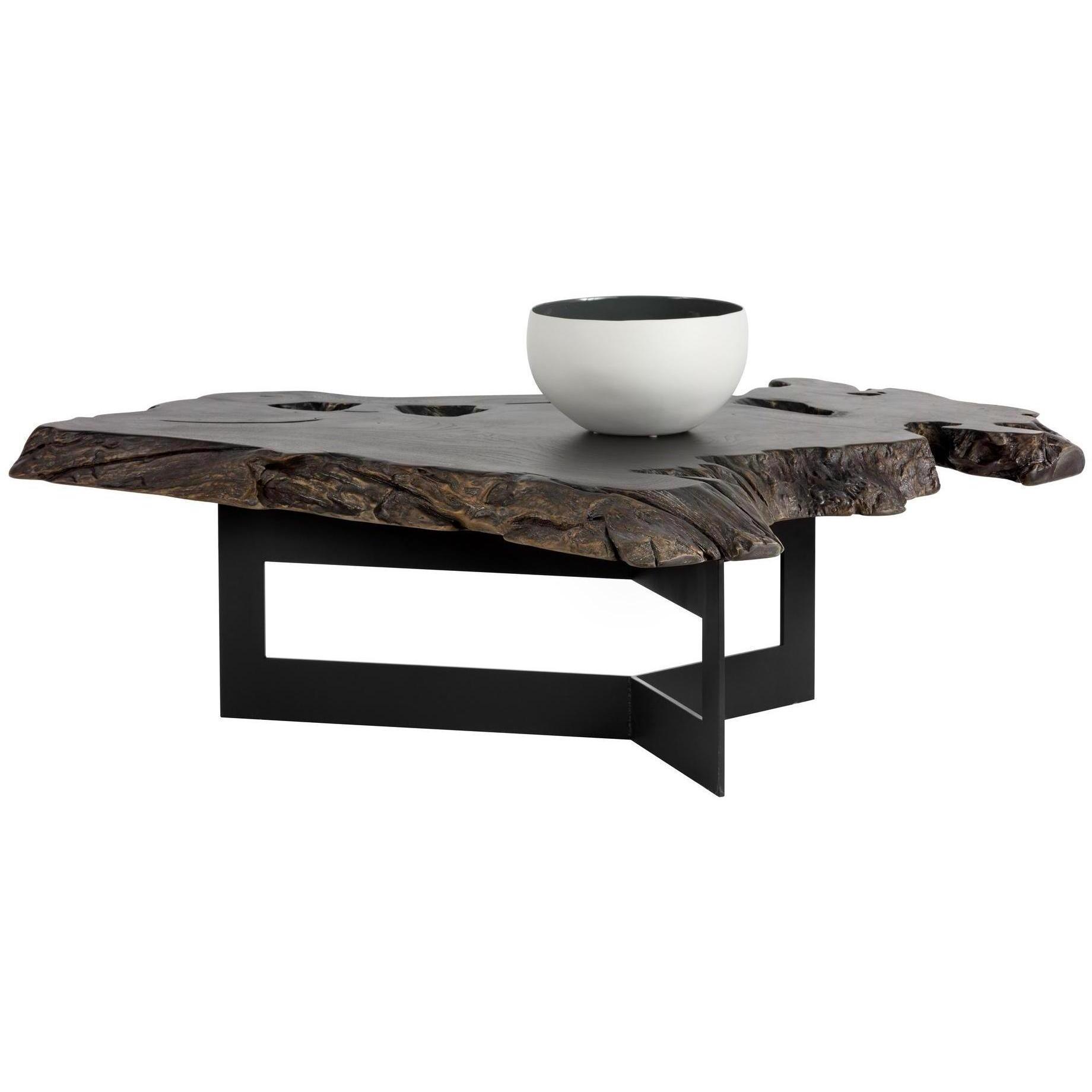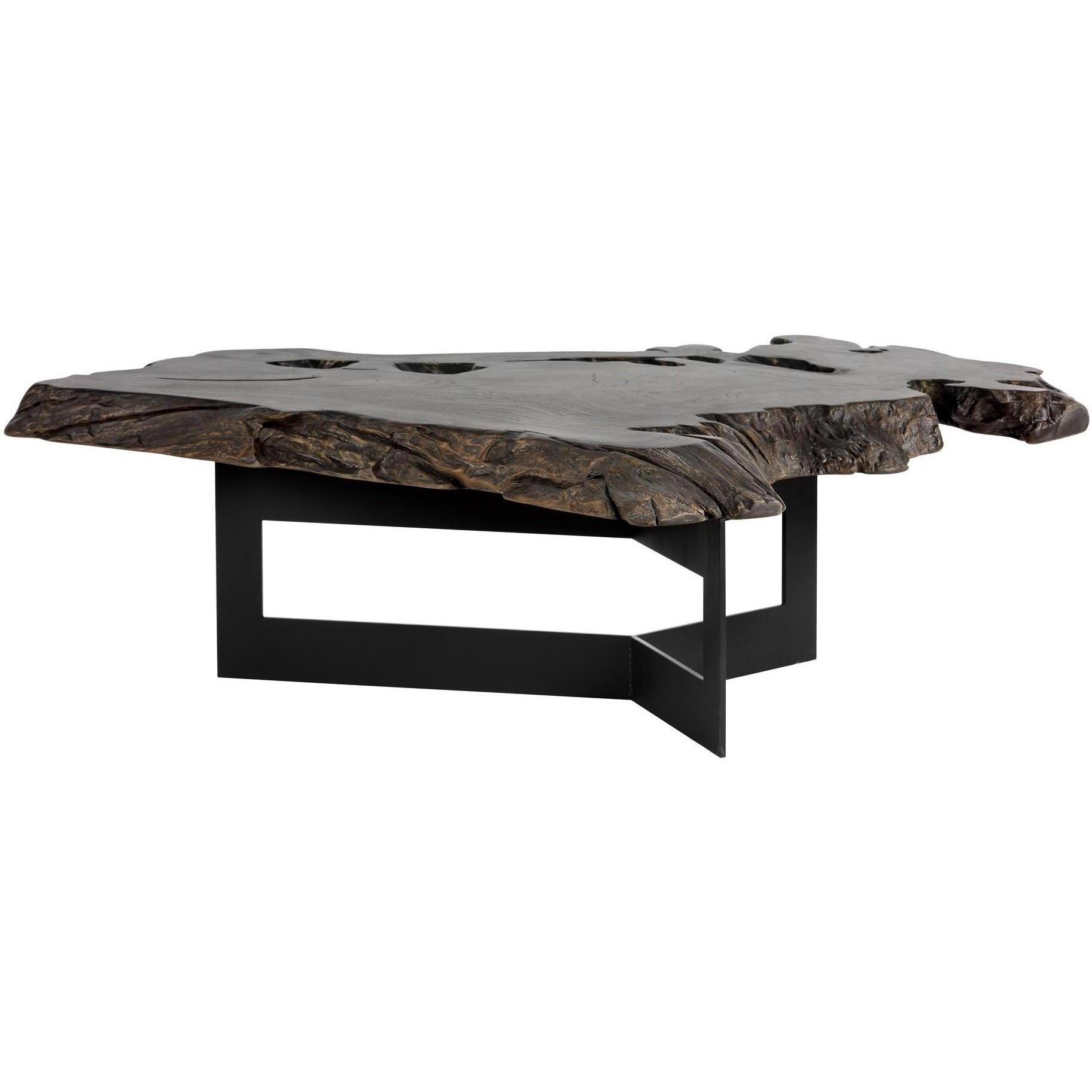 Bold and impressive, this coffee table will elevate the design of contract and residential spaces. Made in Indonesia from solid teak root wood painted black, with each piece uniquely varying in shape and size. Features a painted black top and finished with a sturdy black steel frame. Can be grouped together with the Wyatt End Table for added dimension. As wood is an organic, porous material, these pieces will contain natural variation of texture and may also exhibit fine indentations and cracks. Wood pieces will also display a disparity of colour and grain, and visible knots and burls that add to the character of each piece.