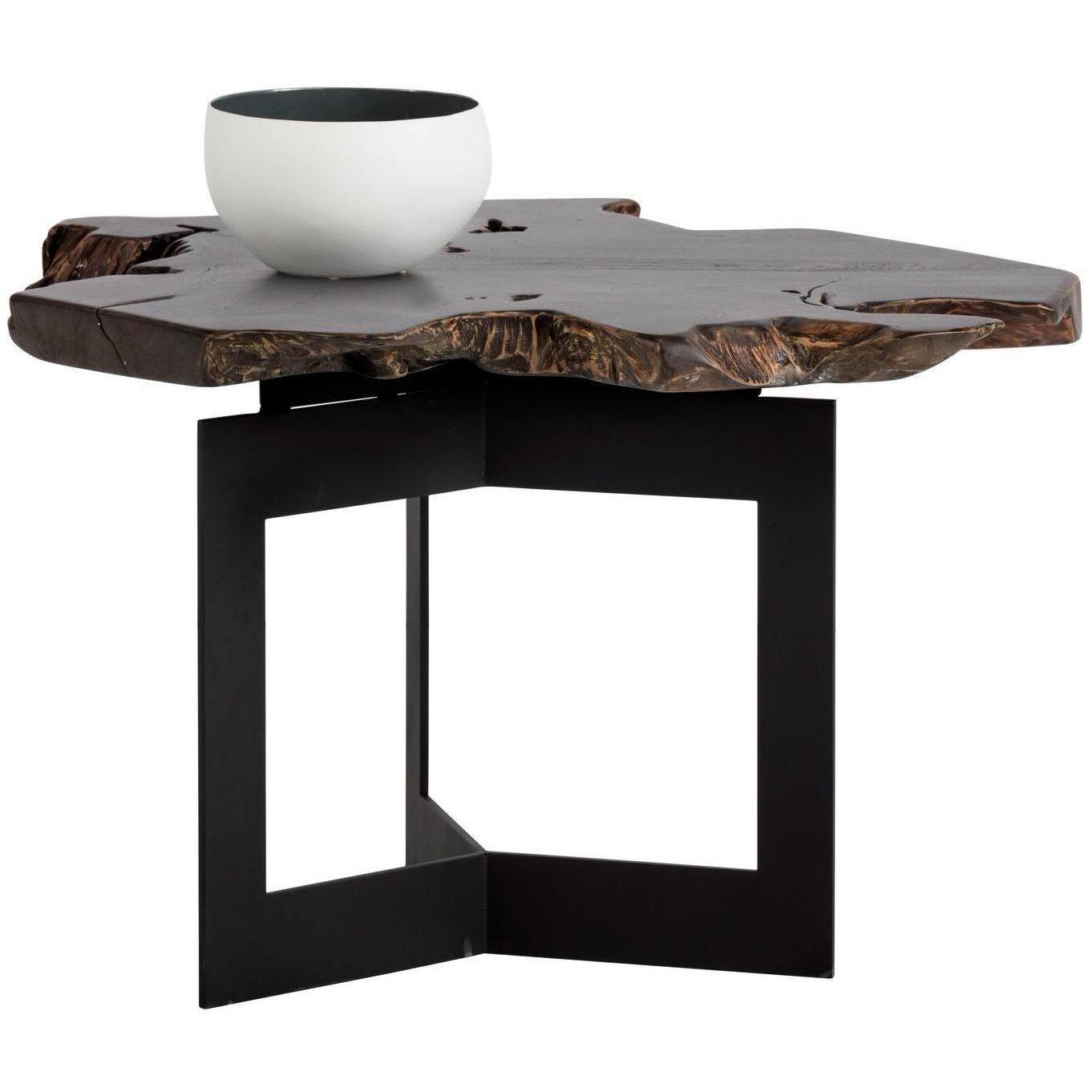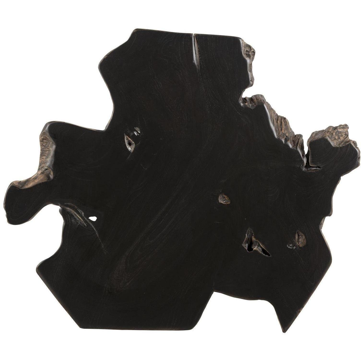 Bold and impressive, this end table will elevate the design of contract and residential spaces. Made in Indonesia from solid teak root wood painted black, with each piece uniquely varying in shape and size. Finished with a sturdy black steel frame. Can be grouped together with the Wyatt Coffee Table for added dimension. As wood is an organic, porous material, these pieces will contain natural variation of texture and may also exhibit fine indentations and cracks. Wood pieces will also display a disparity of colour and grain, and visible knots and burls that add to the character of each piece.