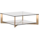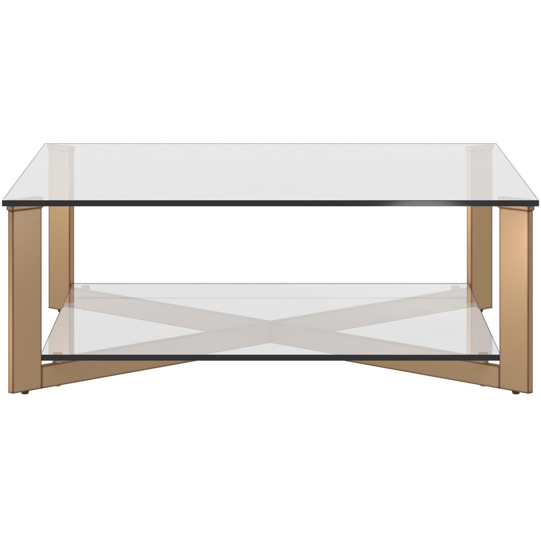 A sleek and modern square coffee table. Made with a tempered glass top and bottom shelf perfect for displaying decor and accents. Finished with an antique brass stainless steel frame. Also available in a rectangle shape, along with coordinating end table.