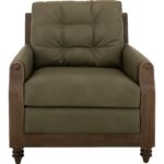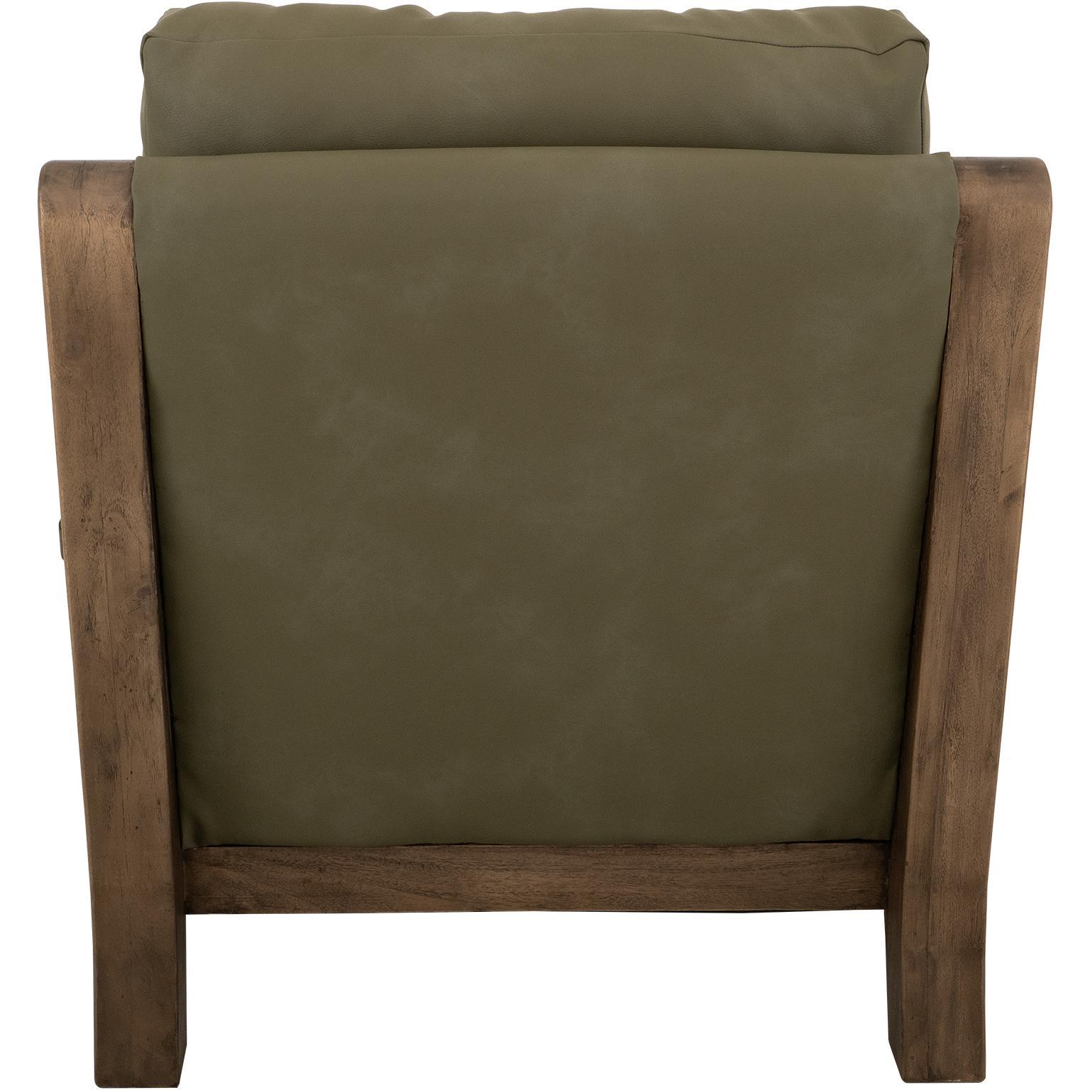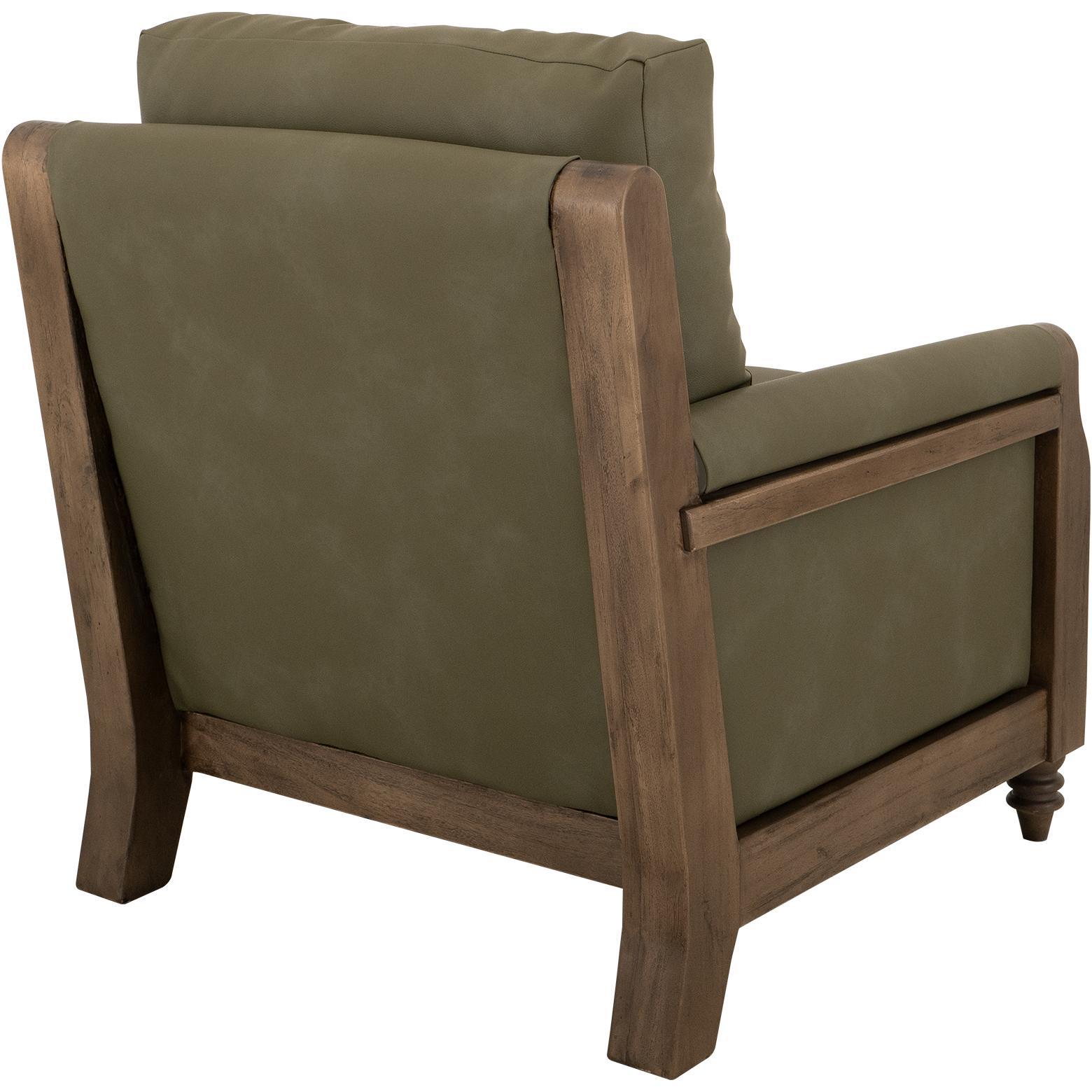 Transform your living space with this stunning wooden-framed armchair, which perfectly combines craftsmanship and comfort. The Xel-Ha II Collection features tufted back cushions upholstered in a green leather-like fabric, providing plush support and an elegant touch. The decorative throw pillows add a charming and warm accent to the overall design. What truly sets this collection apart is its beautifully designed, gently curved armrests, enhancing its aesthetic appeal and ergonomic comfort. The turned wooden legs, with their intricate detailing, showcase timeless sophistication. Redefine your space with furniture that makes a statement because every home deserves a touch of artistry.