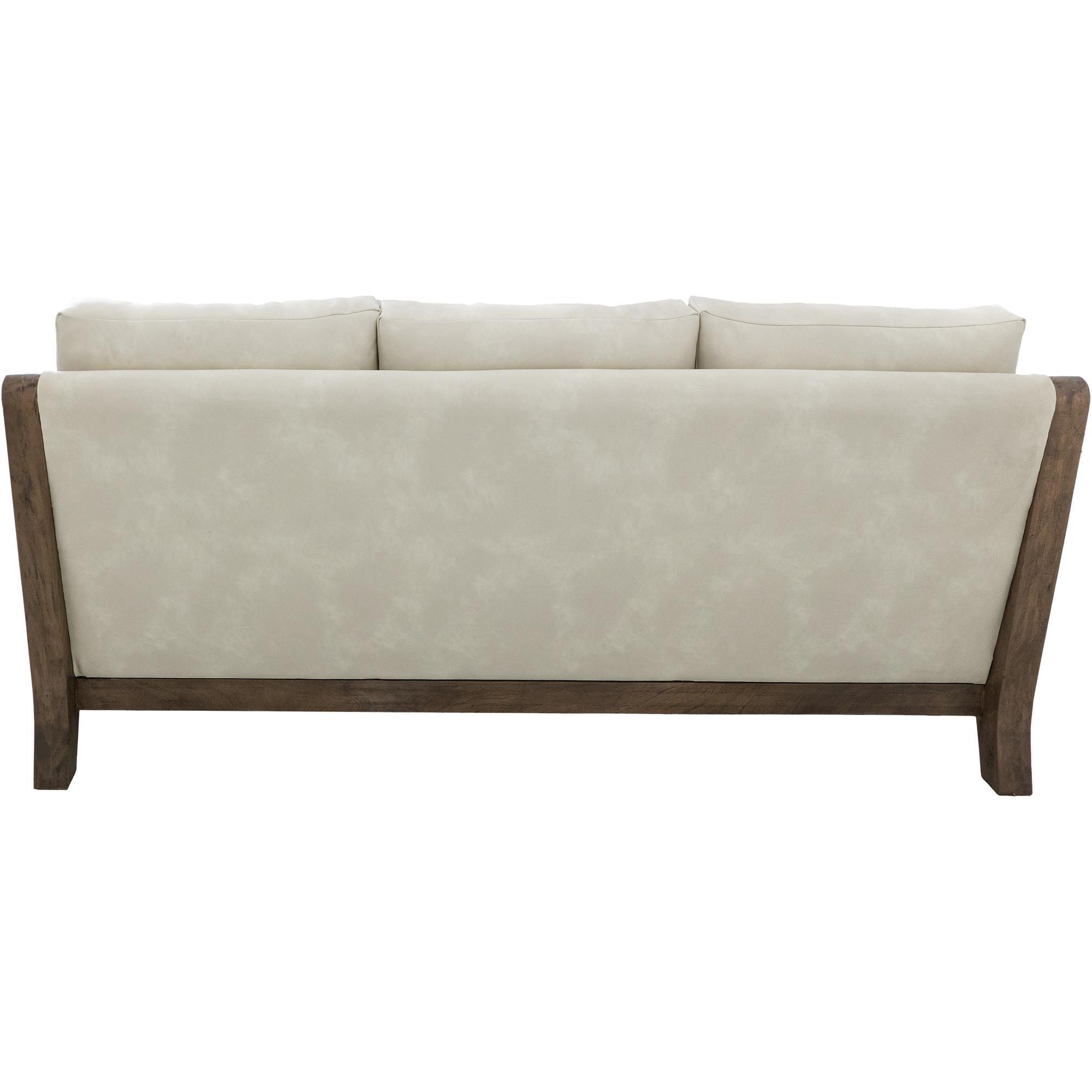 Transform your living space with this stunning wooden-framed sofa that perfectly combines craftsmanship and comfort. The Xel-Ha II Collection features tufted back cushions upholstered in ivory leather-like fabric, providing plush support and an elegant touch. The decorative throw pillows add a charming and warm accent to the overall design. What truly sets this collection apart is its beautifully designed, gently curved armrests, enhancing its aesthetic appeal and ergonomic comfort. The turned wooden legs, with their intricate detailing, showcase timeless sophistication. Redefine your space with furniture that makes a statement because every home deserves a touch of artistry.